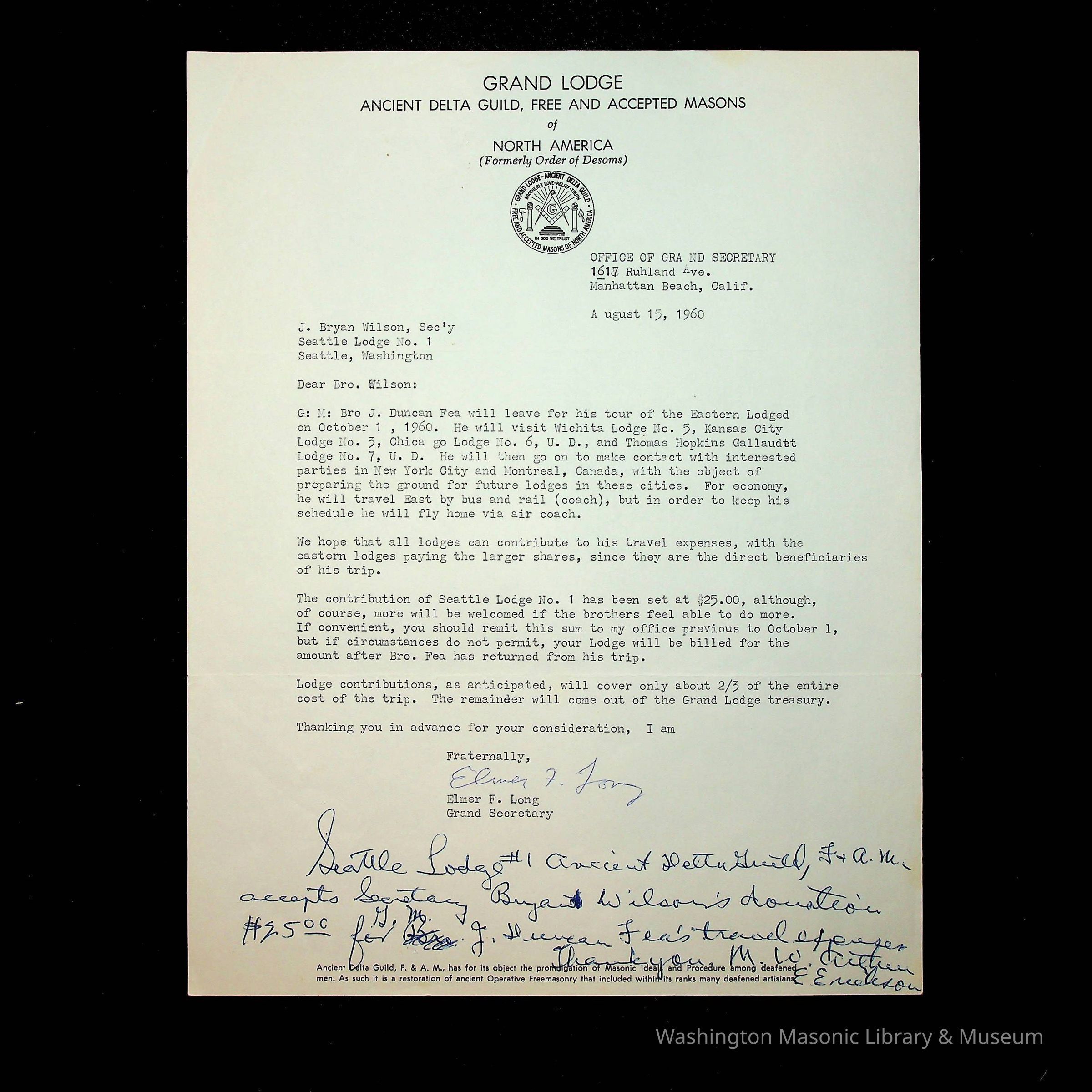 a) Letter to J. Bryan Wilson from Office of Grand Secretary, CA (August 15, `1960)