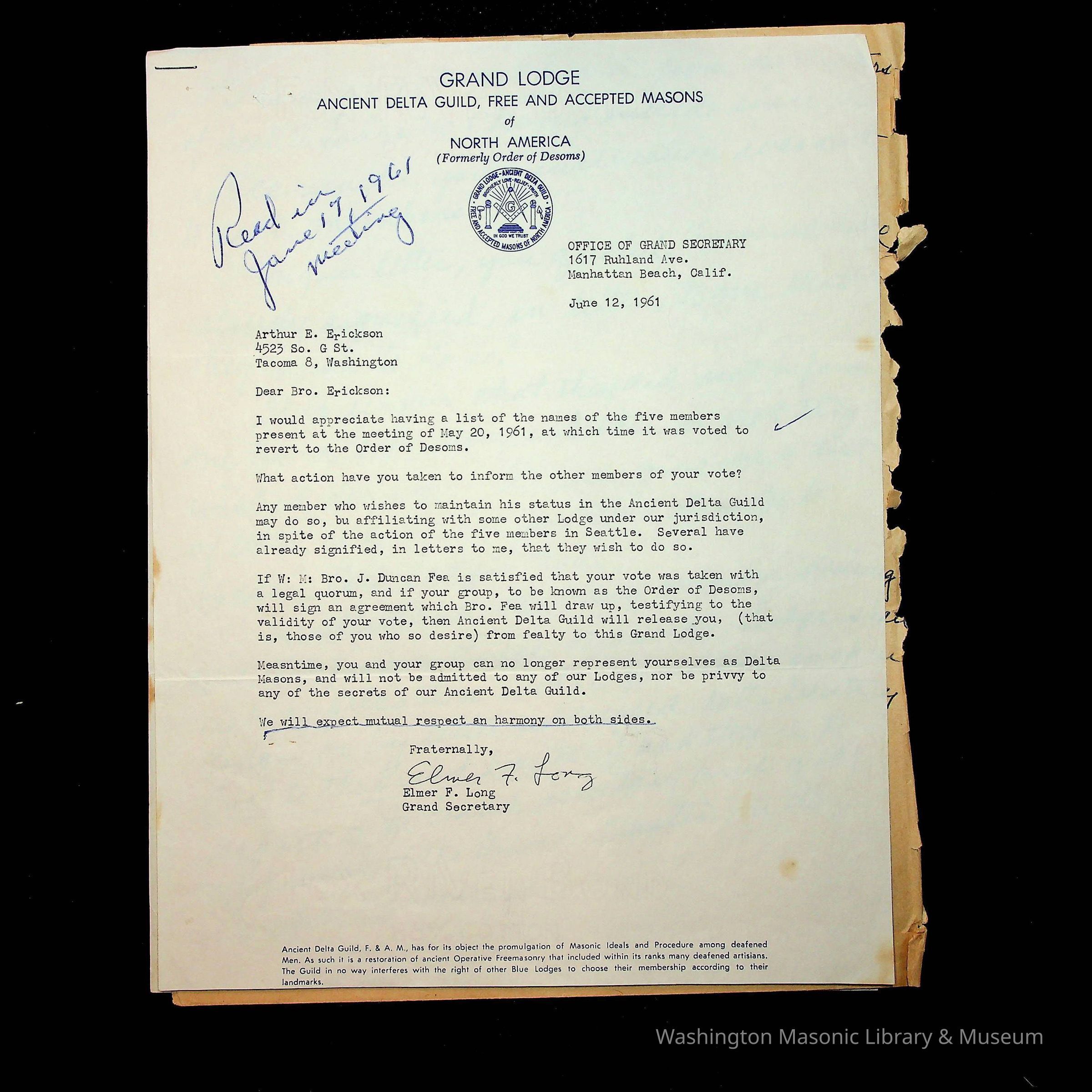 d-f) Letter and notes to Arthur E. Erickson from Office of Grand Secretary, CA (June 12, 1961). Originally stapled together
