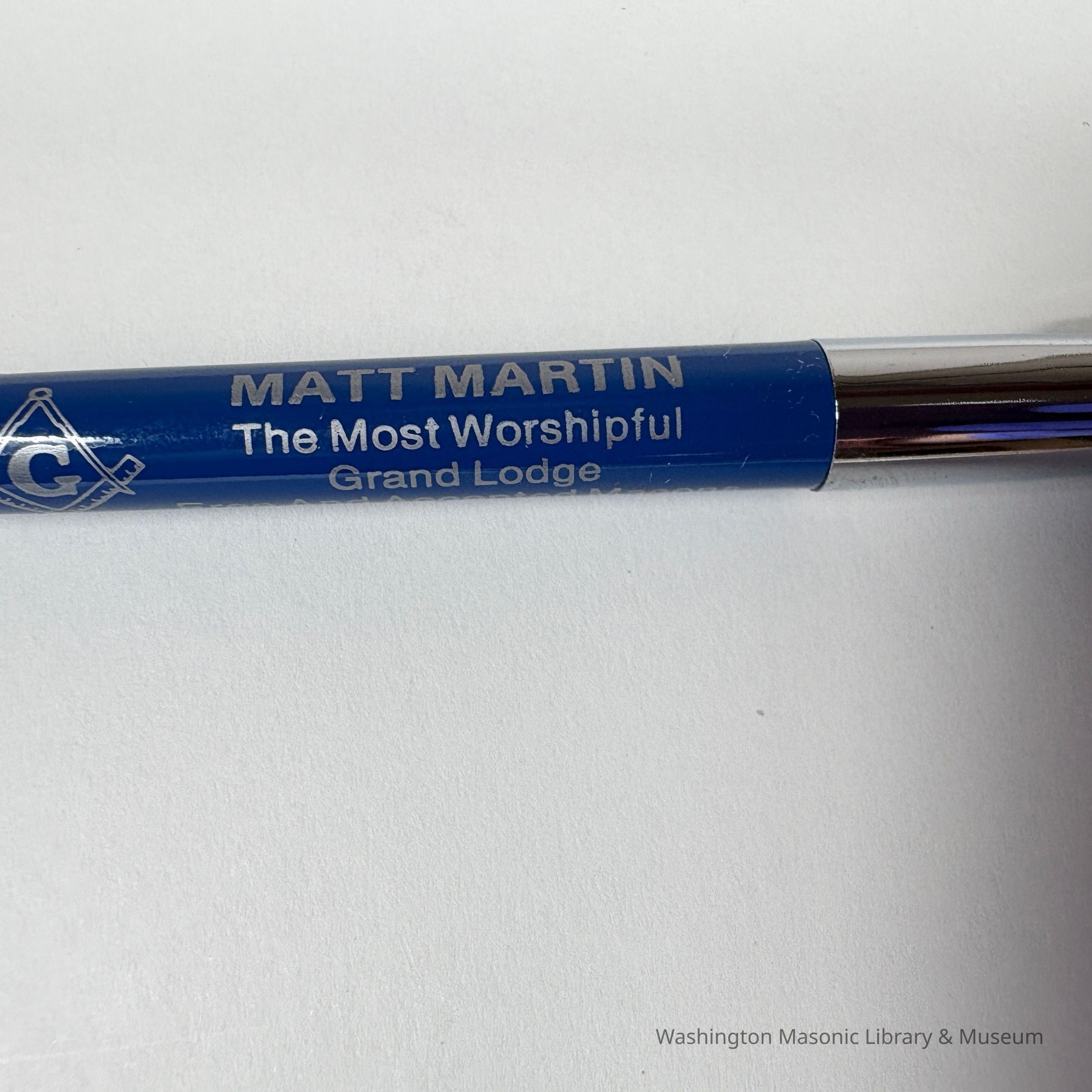 Pen: Blue with silver accents. "Matt Martin/The Most Worshipful Grand Lodge Free and Accepted Masons of Washington". Martin was Grand Master (1984-1985)Collection