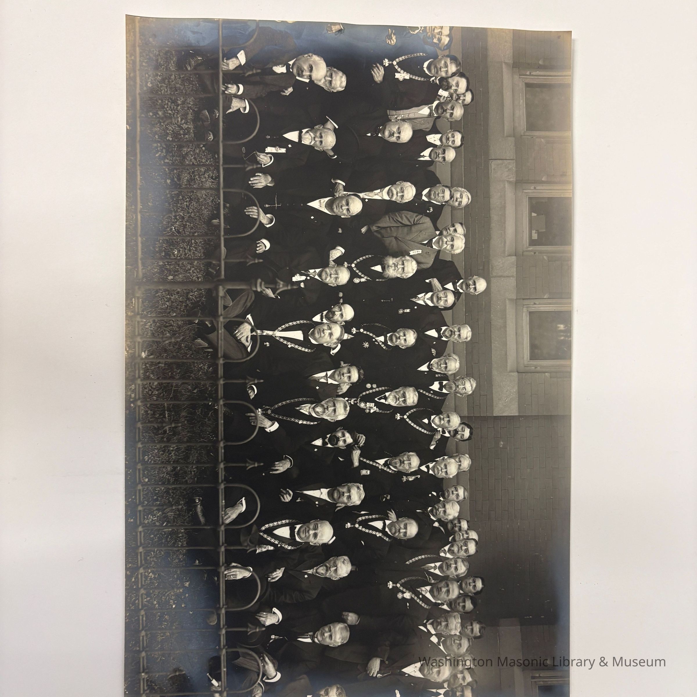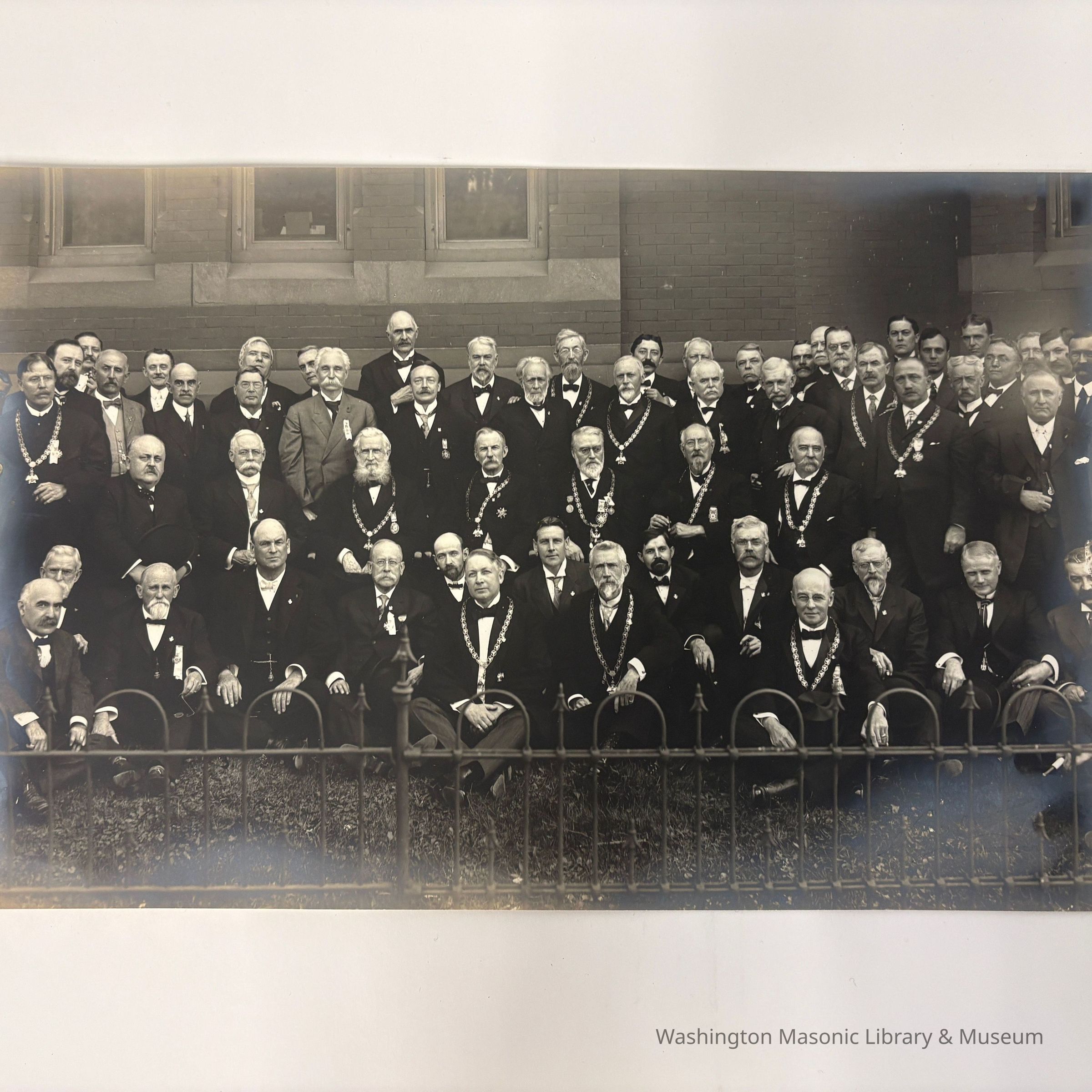 Photograph: Black and White. Scottish Rite officers posed outside a building. Gate in foreground. Probably a 33rd Degree Conclave photograph.Collection
