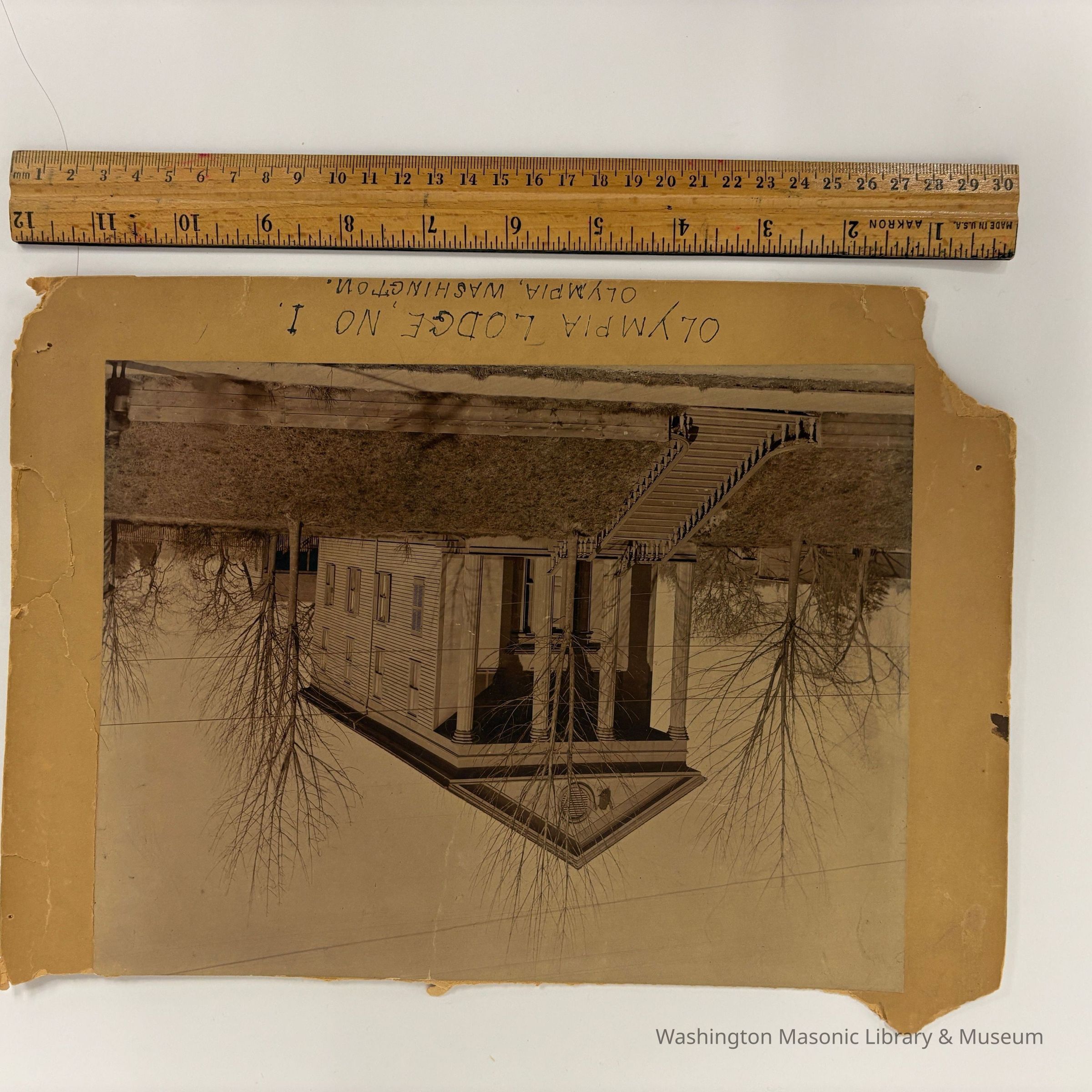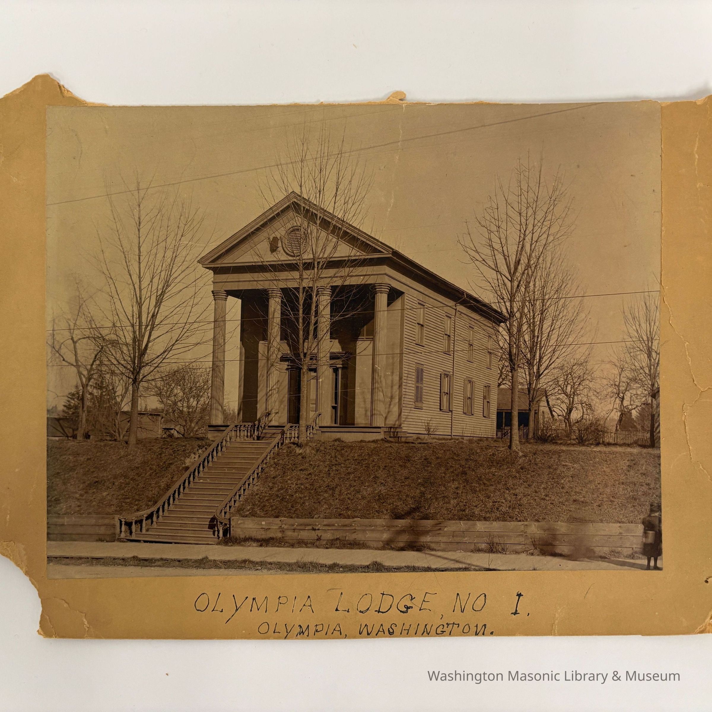 Photograph:on matting. First Lodge building built in Olympia, Washington, for Olympia Lodge No. 1. "Olympia Lodge No. 1, Olympia, Washington" Built 1853 and raised 1911.