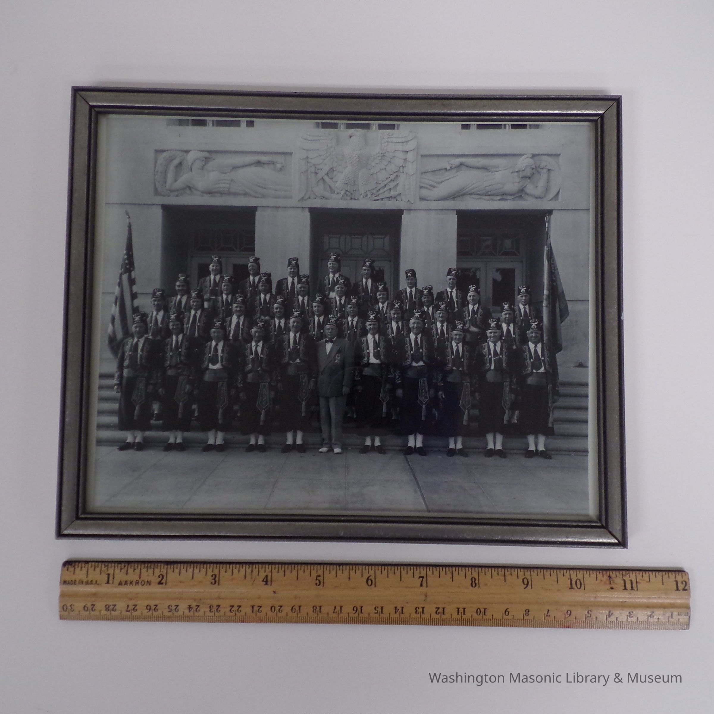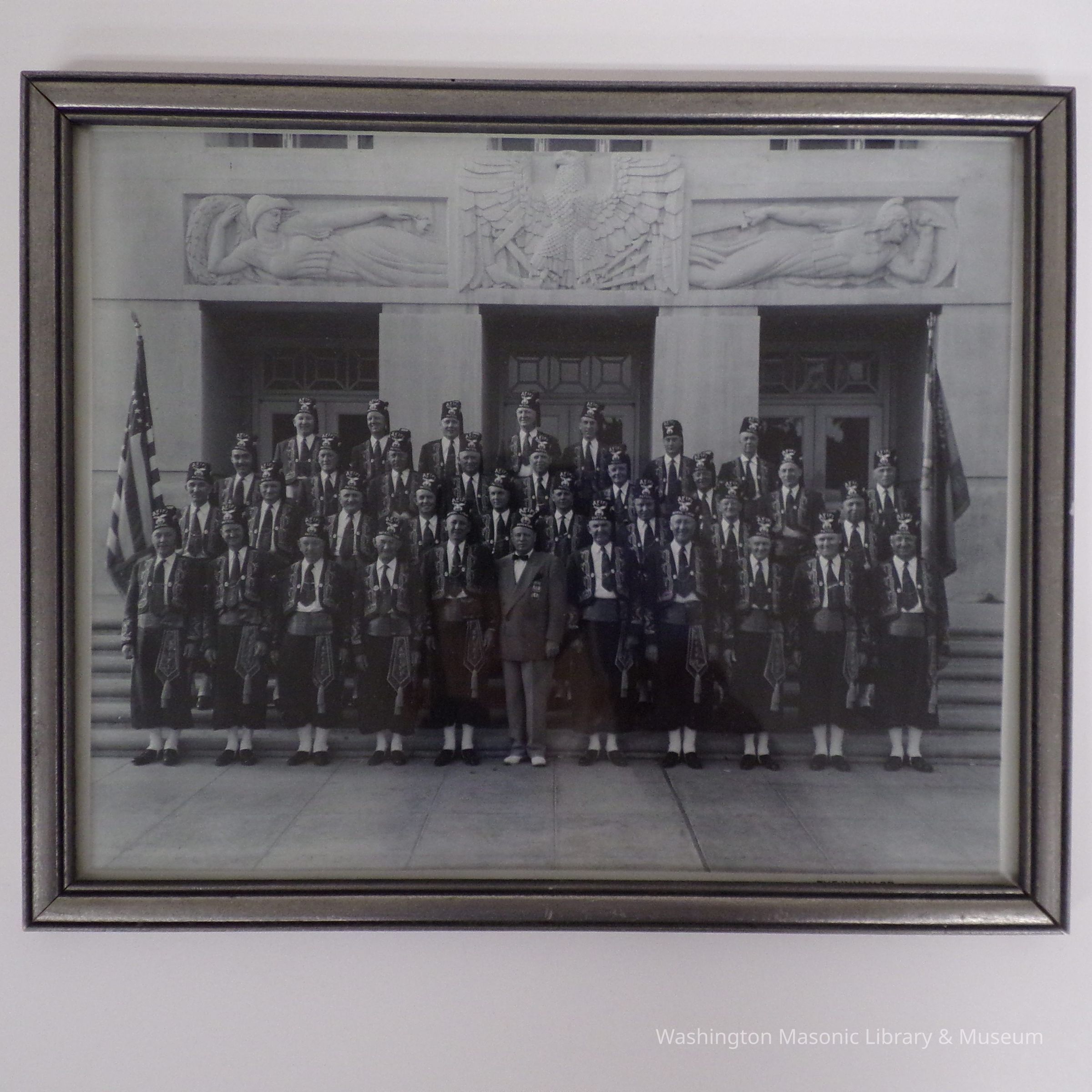 Photograph: Framed. 1950 Shrine Patrol, Los Angeles. 2 badges for "A.M. Anderson" on back.