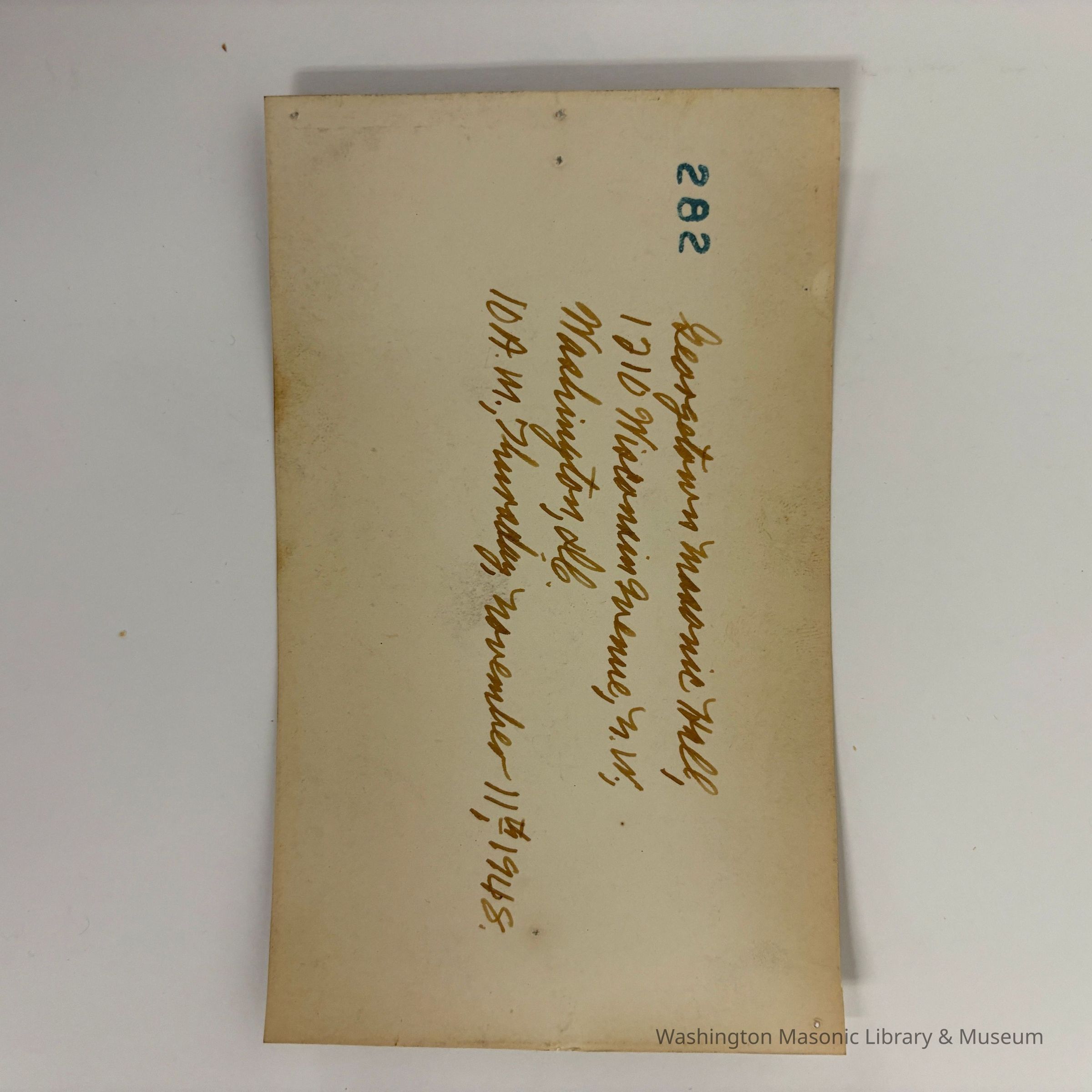 On the back: "Georgetown Masonic Hall, 1210 Wisconsin Avenue, N.W., Washington, D.C., 10:am, Thursday, November 11th, 1948.Collection