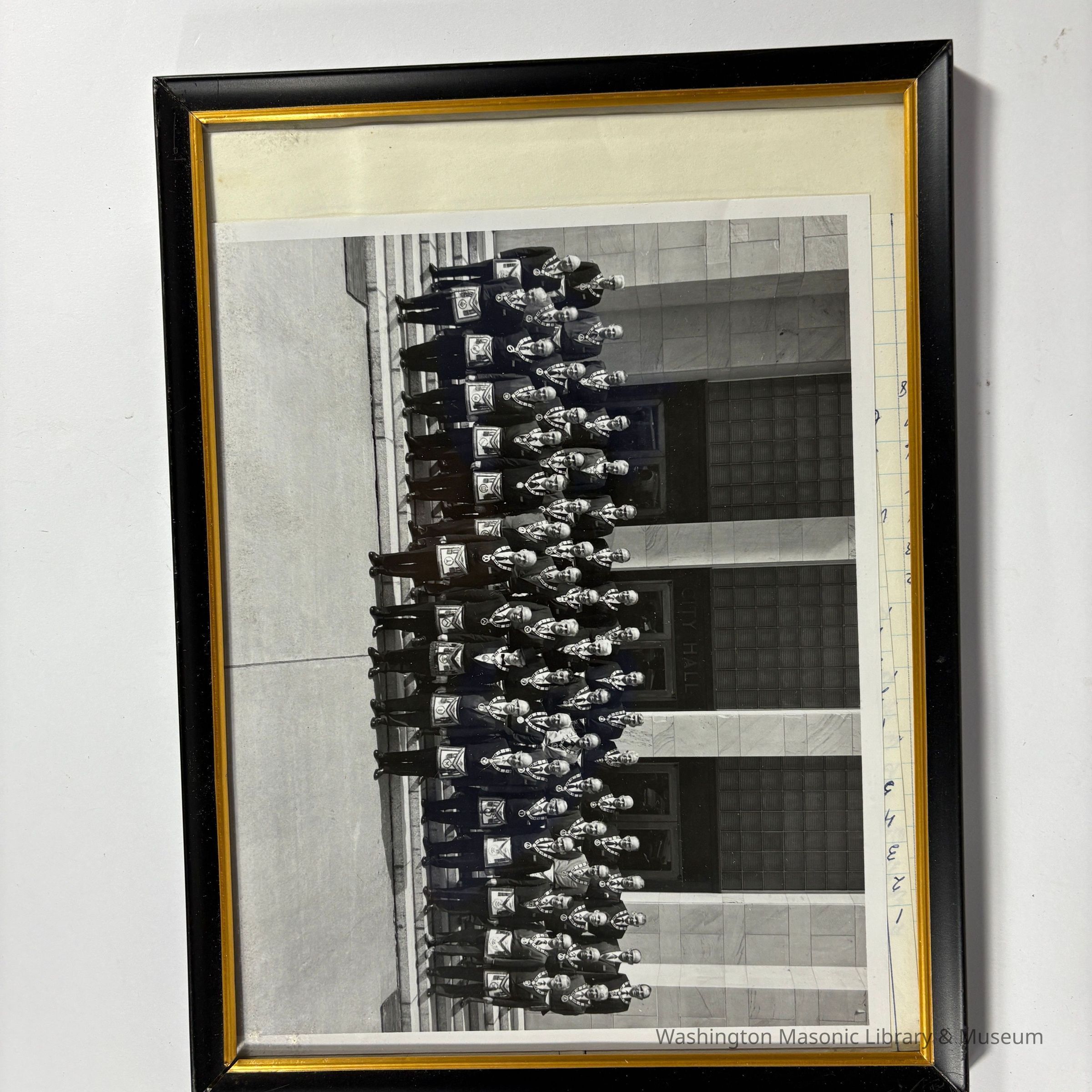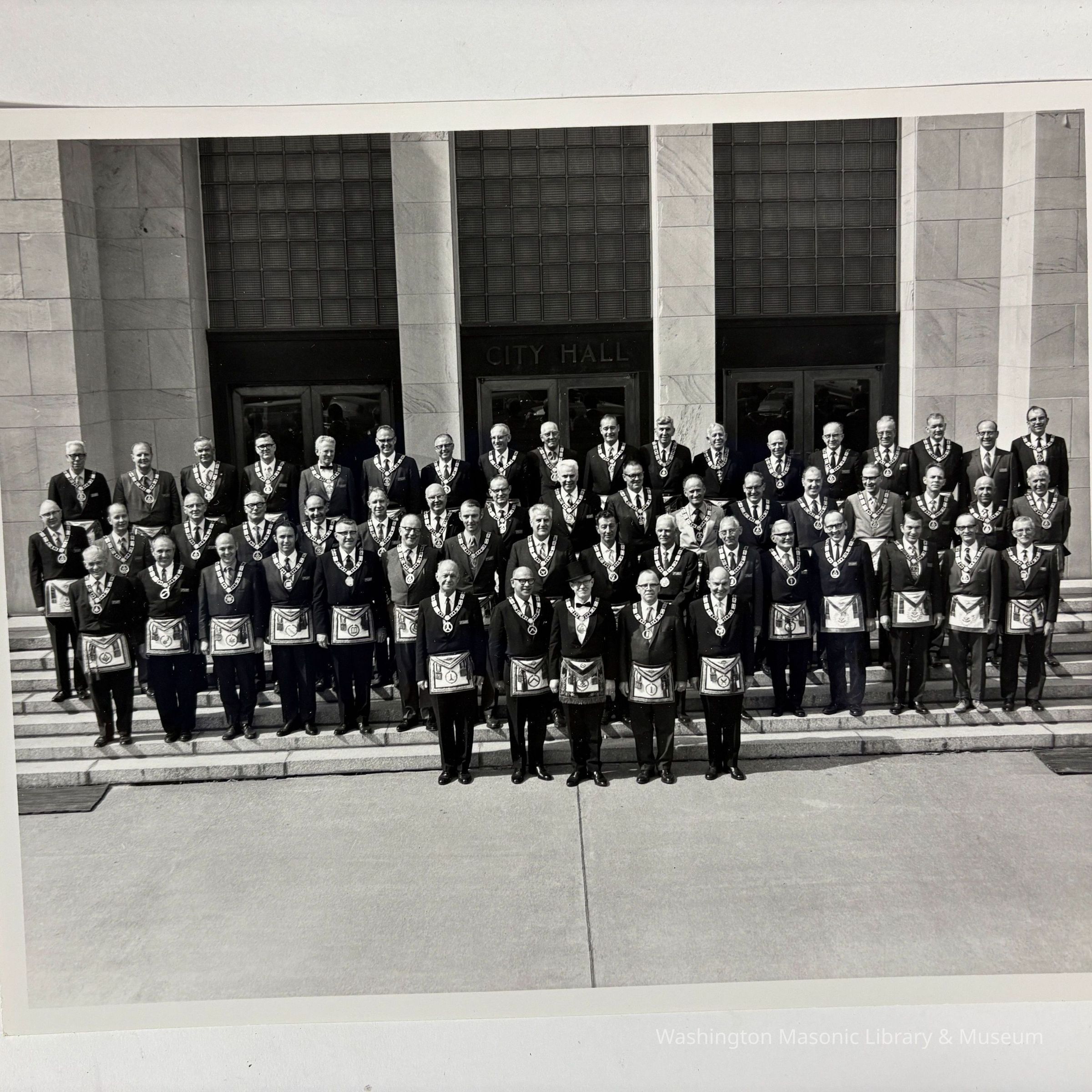 Photograph: Grand Lodge standing in front of Bellingham City Hall (c. 1971). Taken during the 114th Annual Communication. Likely belonged to Francis M. Richardson, Grand Historian that year.