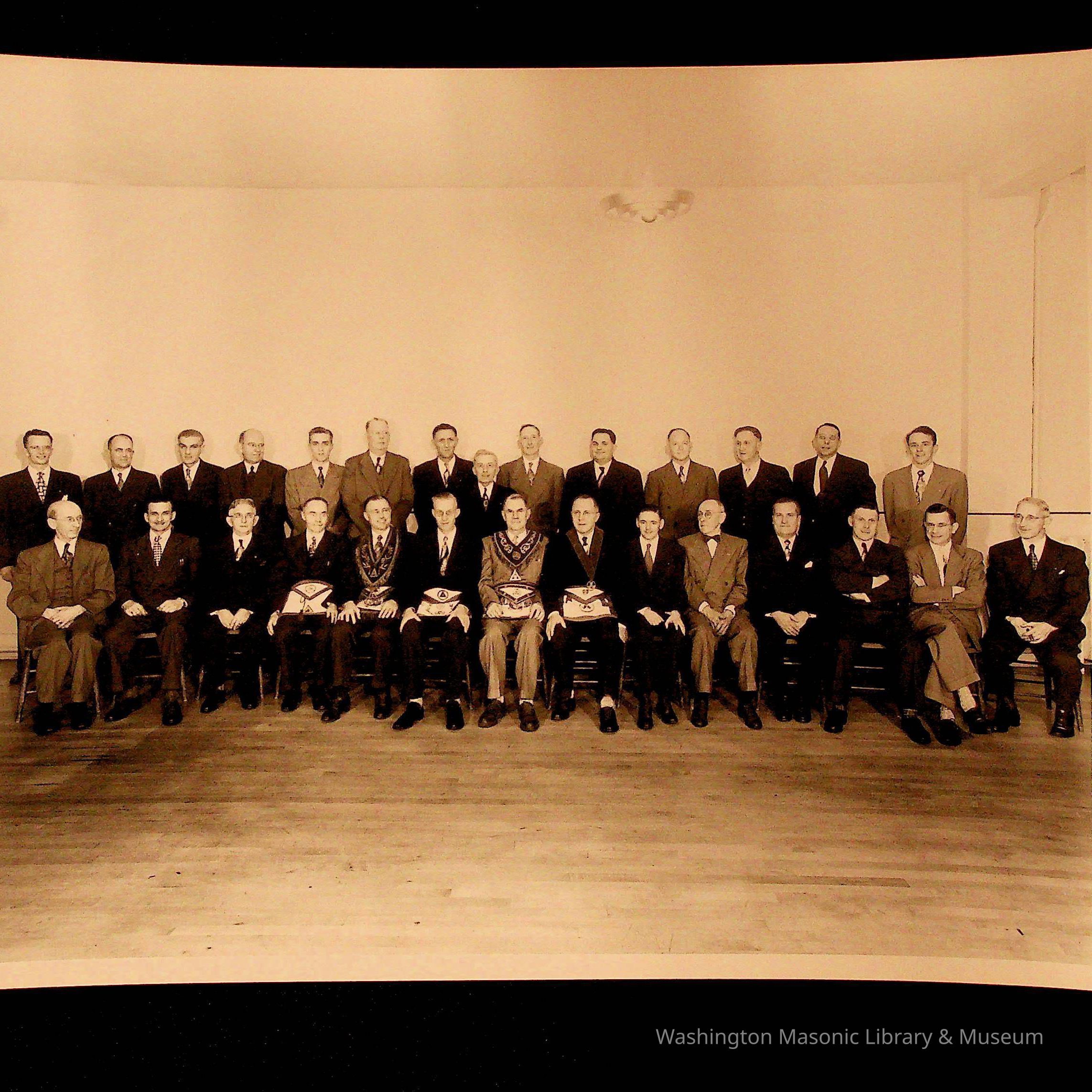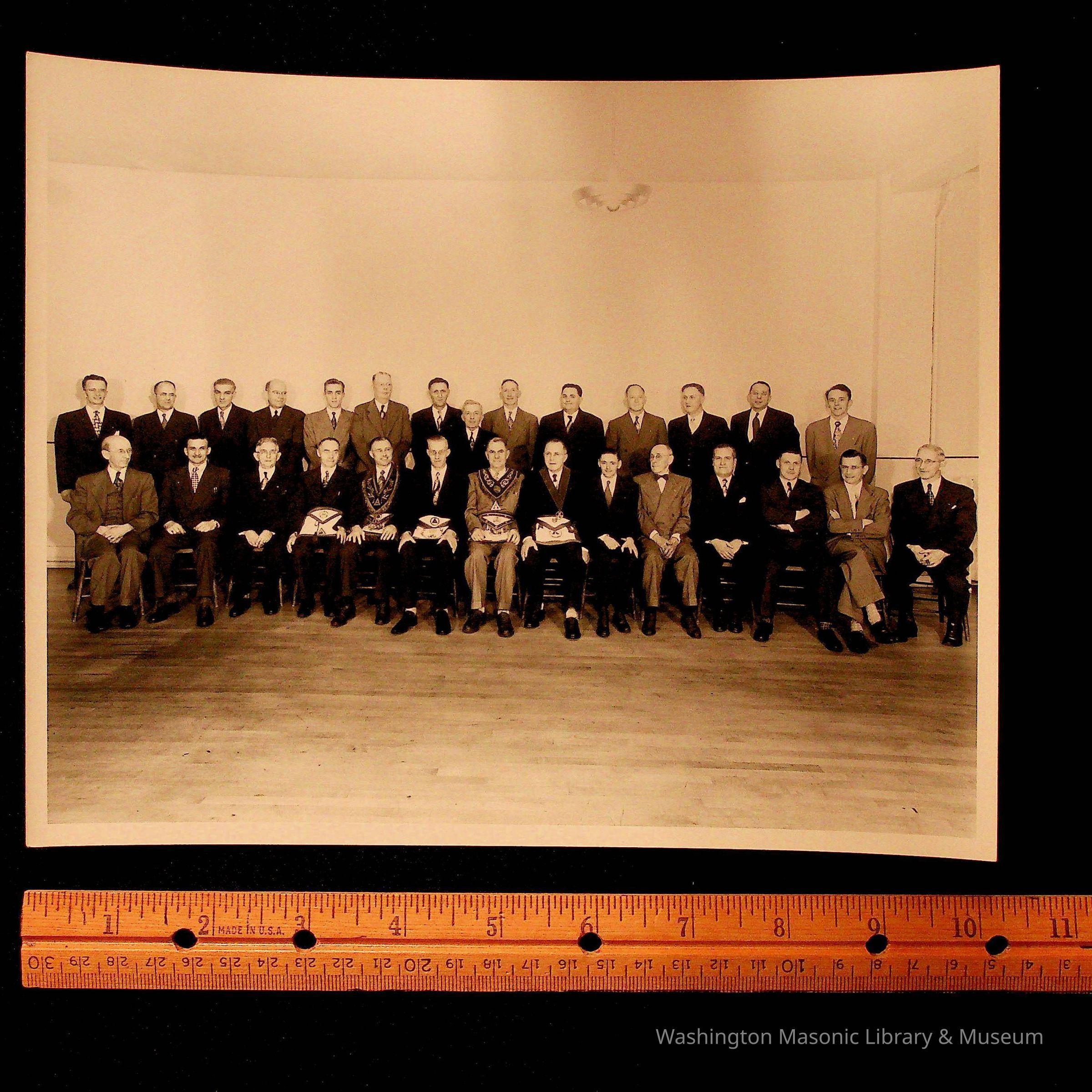 Photograph: In envelope. Masons seated and standing for posed picture. Envelope says "class of 1950". Found in photo with other photographs, various. (Other photos are also numbered 2023.97)