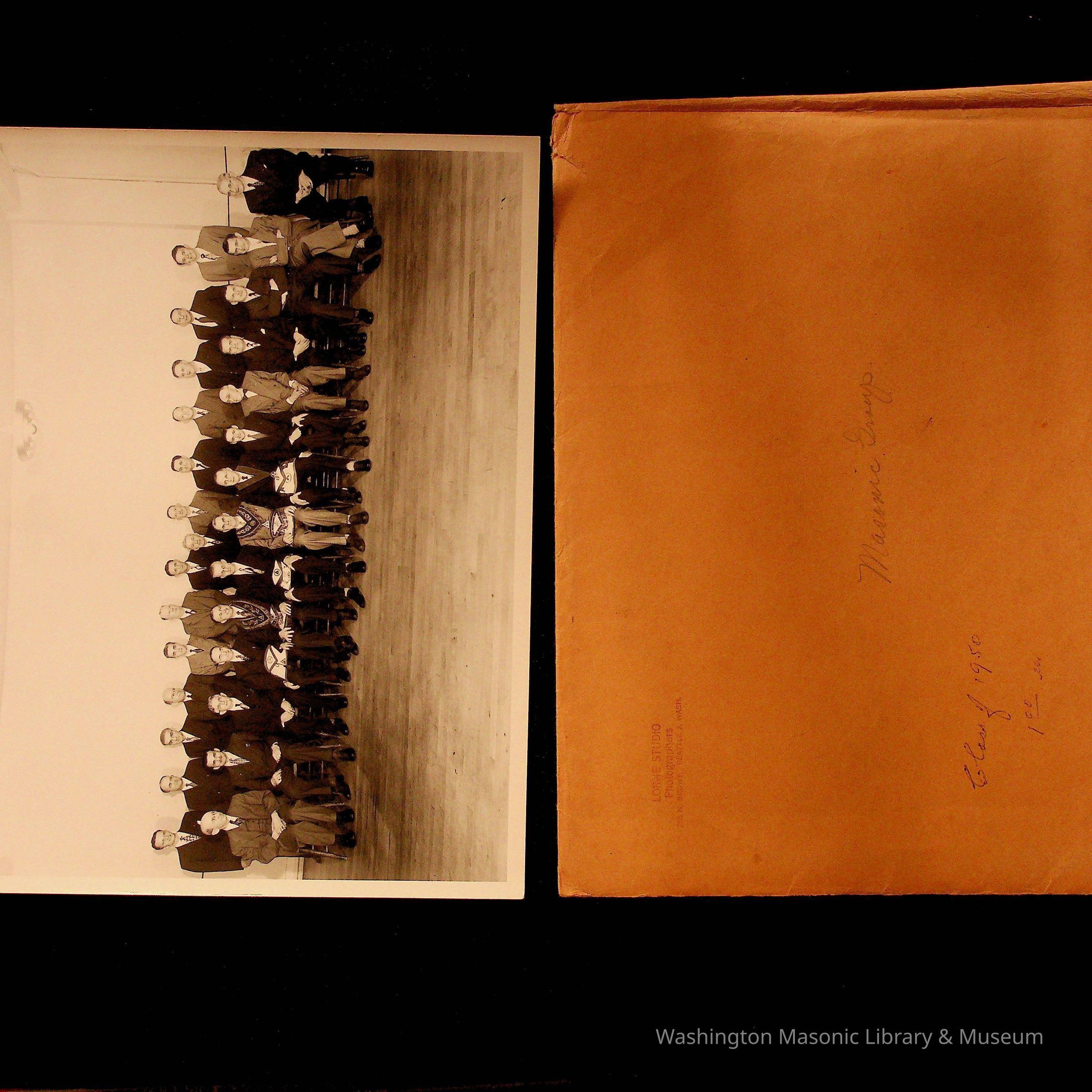 Photograph: In envelope. Masons seated and standing for posed picture. Envelope says "class of 1950". Found in photo with other photographs, various.Entry/Object ID