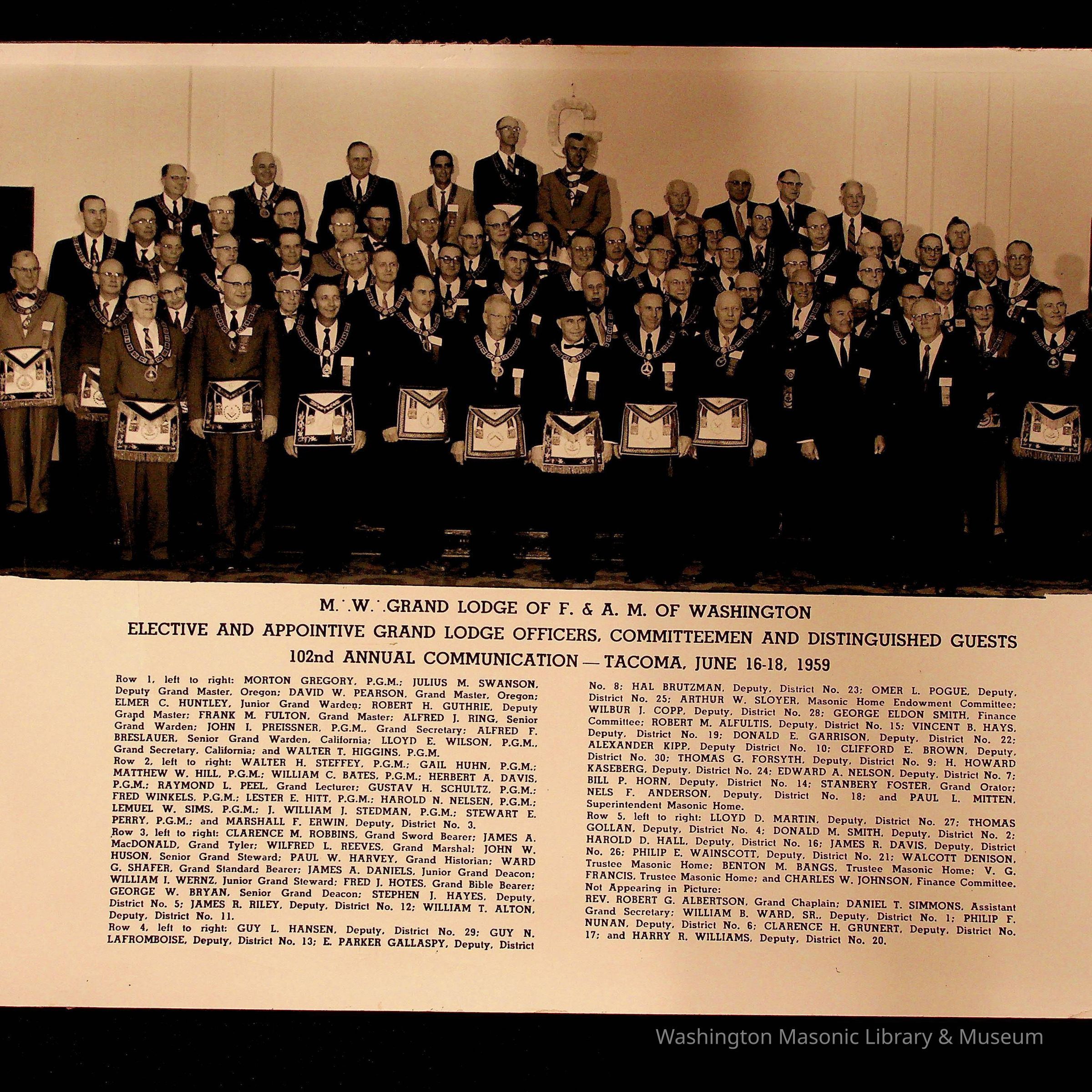 Photograph: MW Grand Lodge of Washington, Elective and Appointive grand Lodge Officers, Annual Communication, 1959. Found in photo with other photographs, various.Collection