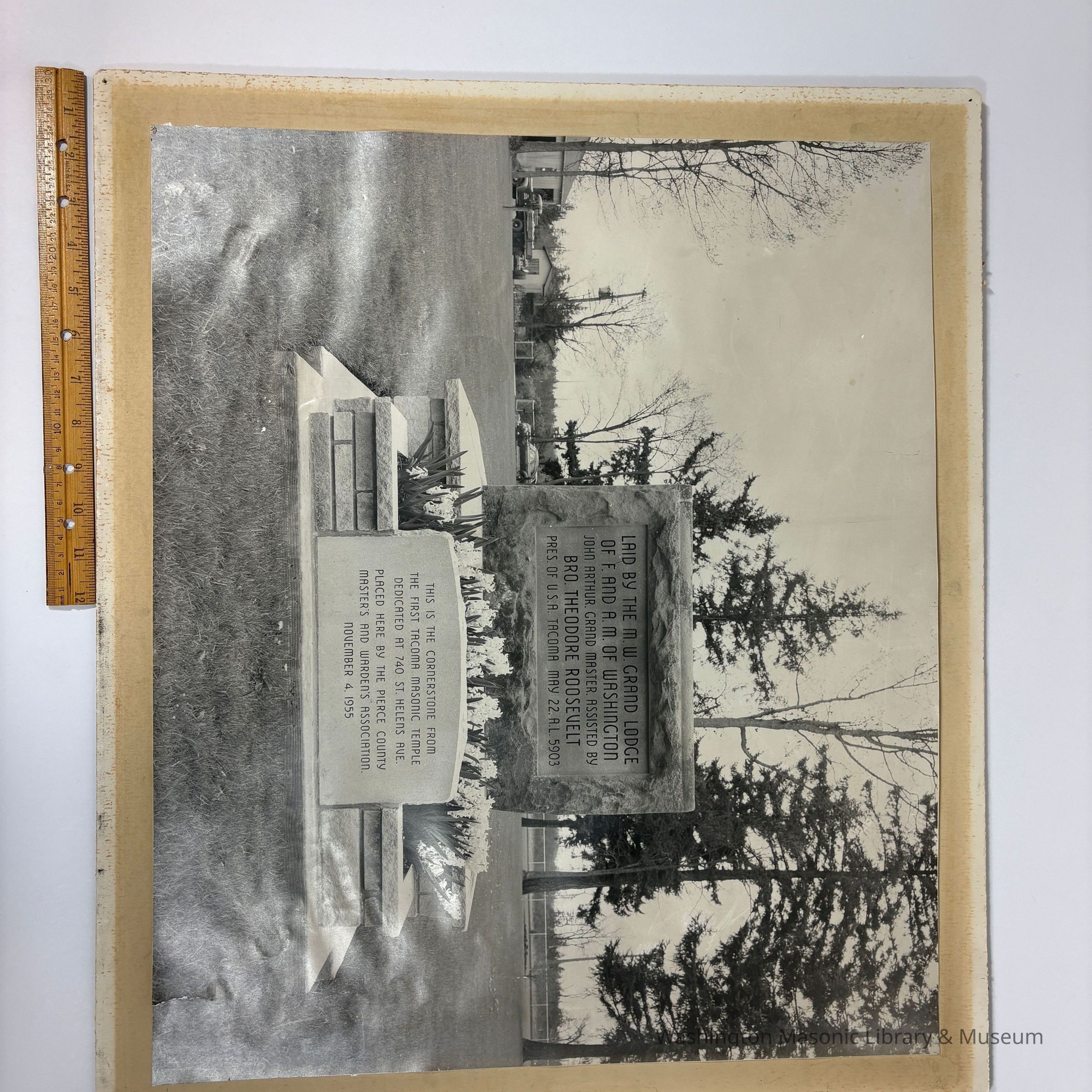 Photograph: On Matboard. Of the Cornerstone laid by President Theodore Roosevelt in Tacoma in 1903. Cornerstone later removed to the New Tacoma Cemetery in 1953.