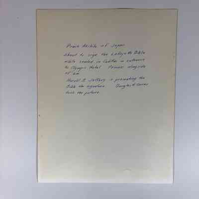 Photograph: Prince Akihito of Japan signing Lafayette Lodge No. 241's Bible (1960)Entry/Object ID