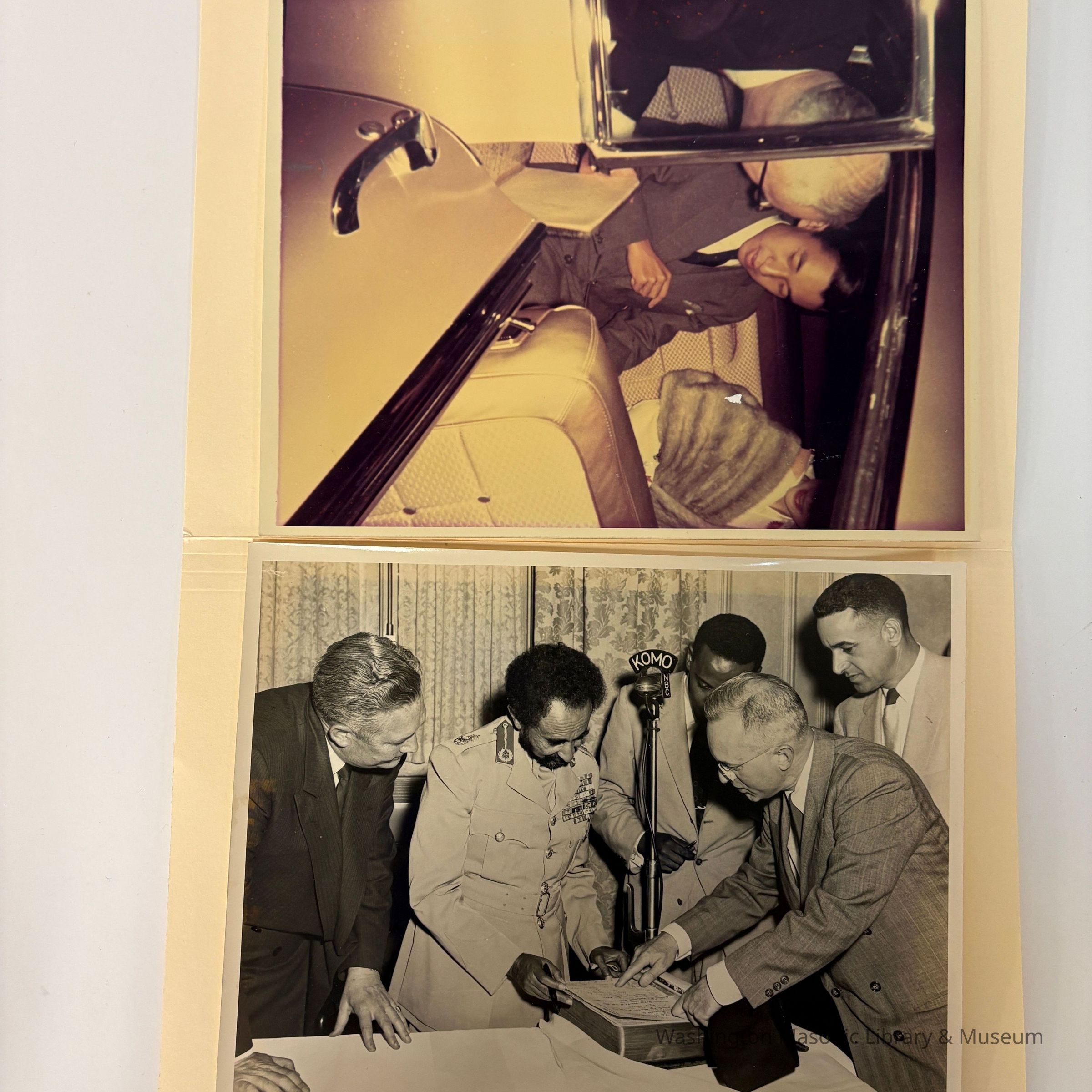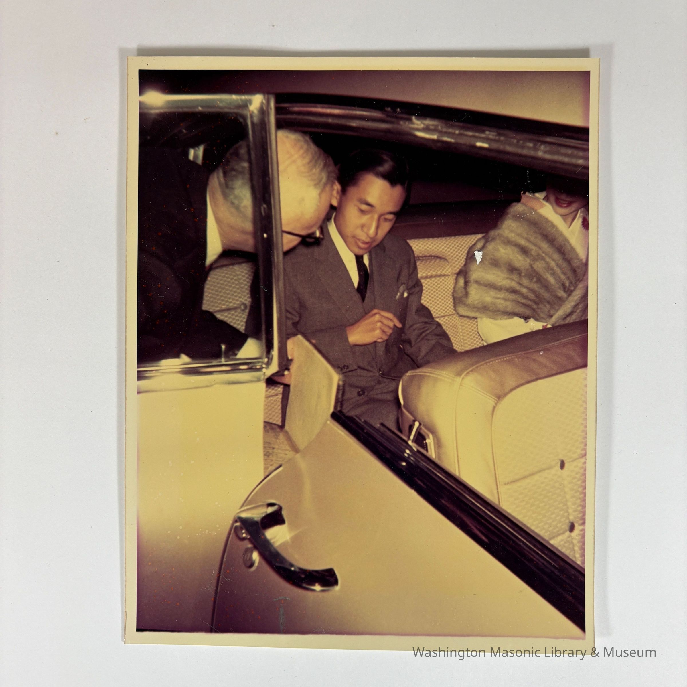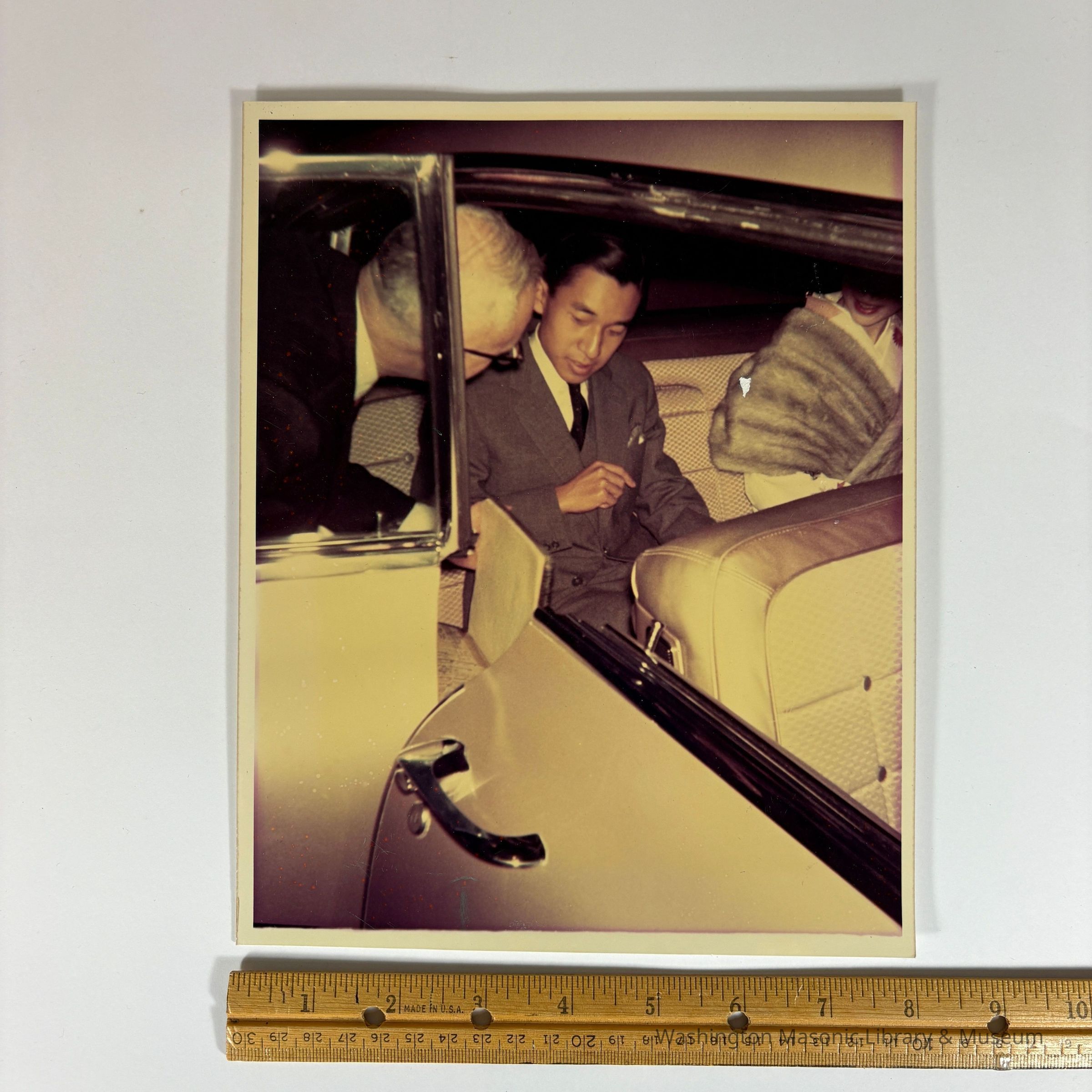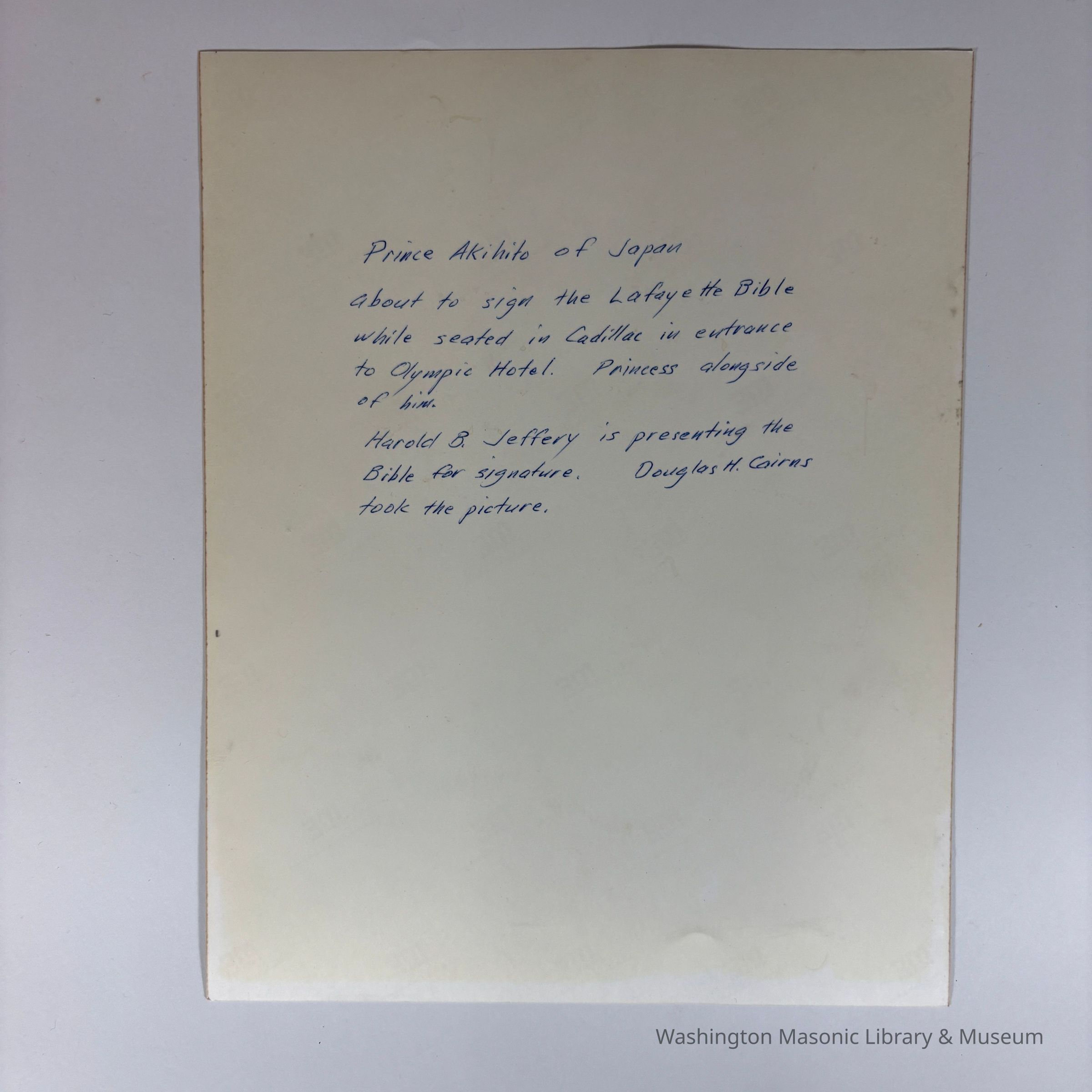 On the back is written: " Prince Akihito of Japan about to sign the Lafayette Bible while seated in a Cadillac in entrance to Olympic Hotel. Princess alongside of him. Harold B. Jeffery is presenting the Bible for signature. Douglas H. Cairns took the picture."Collection
