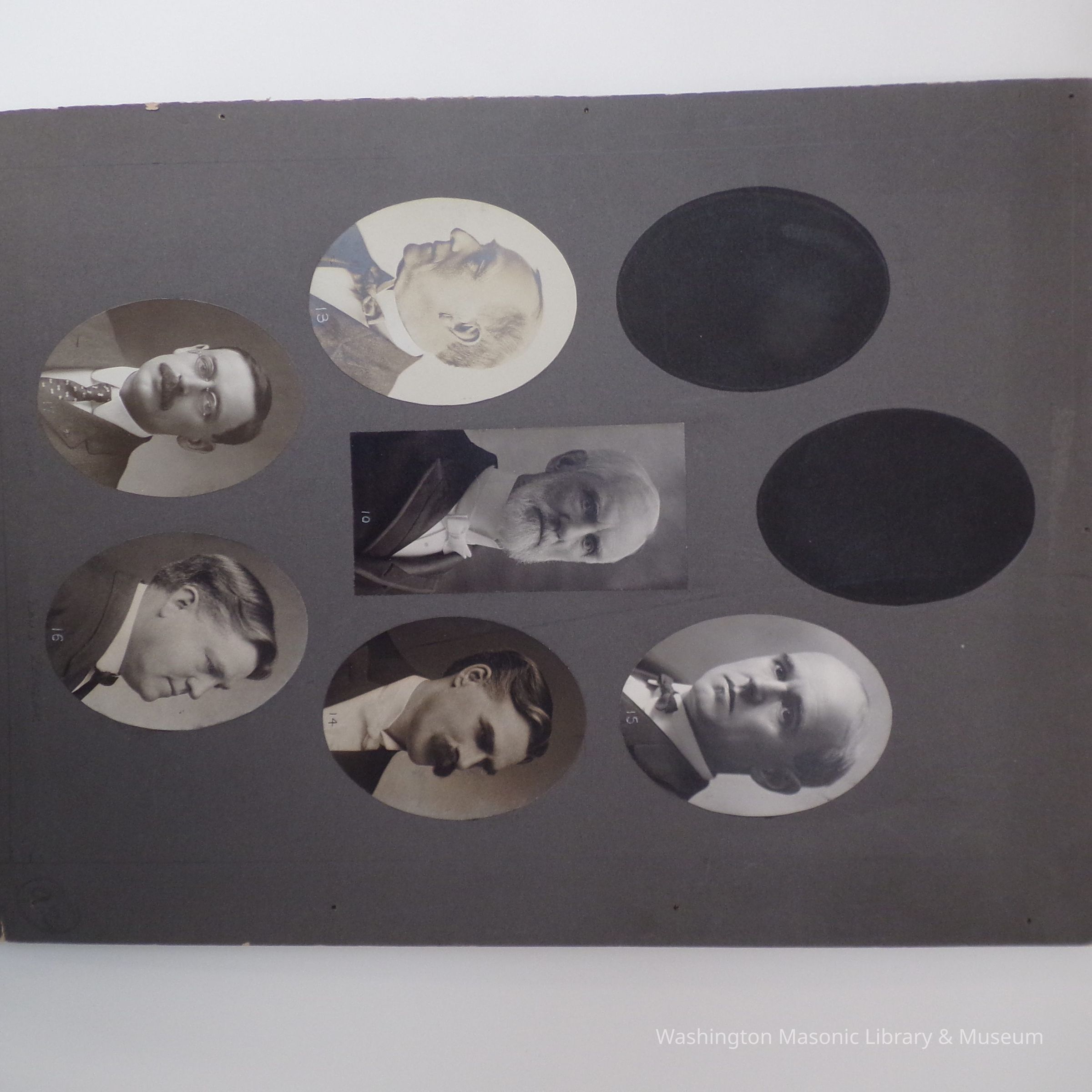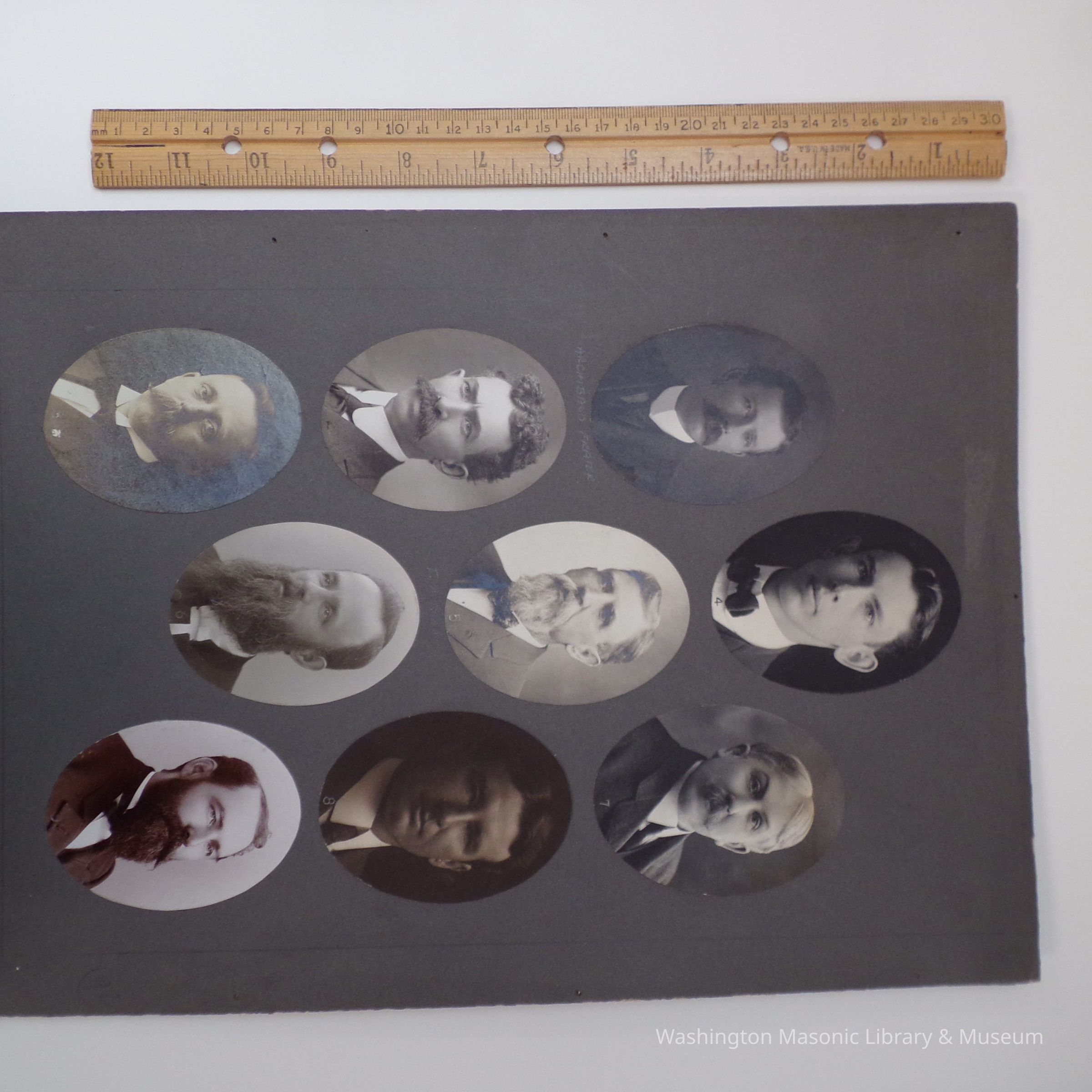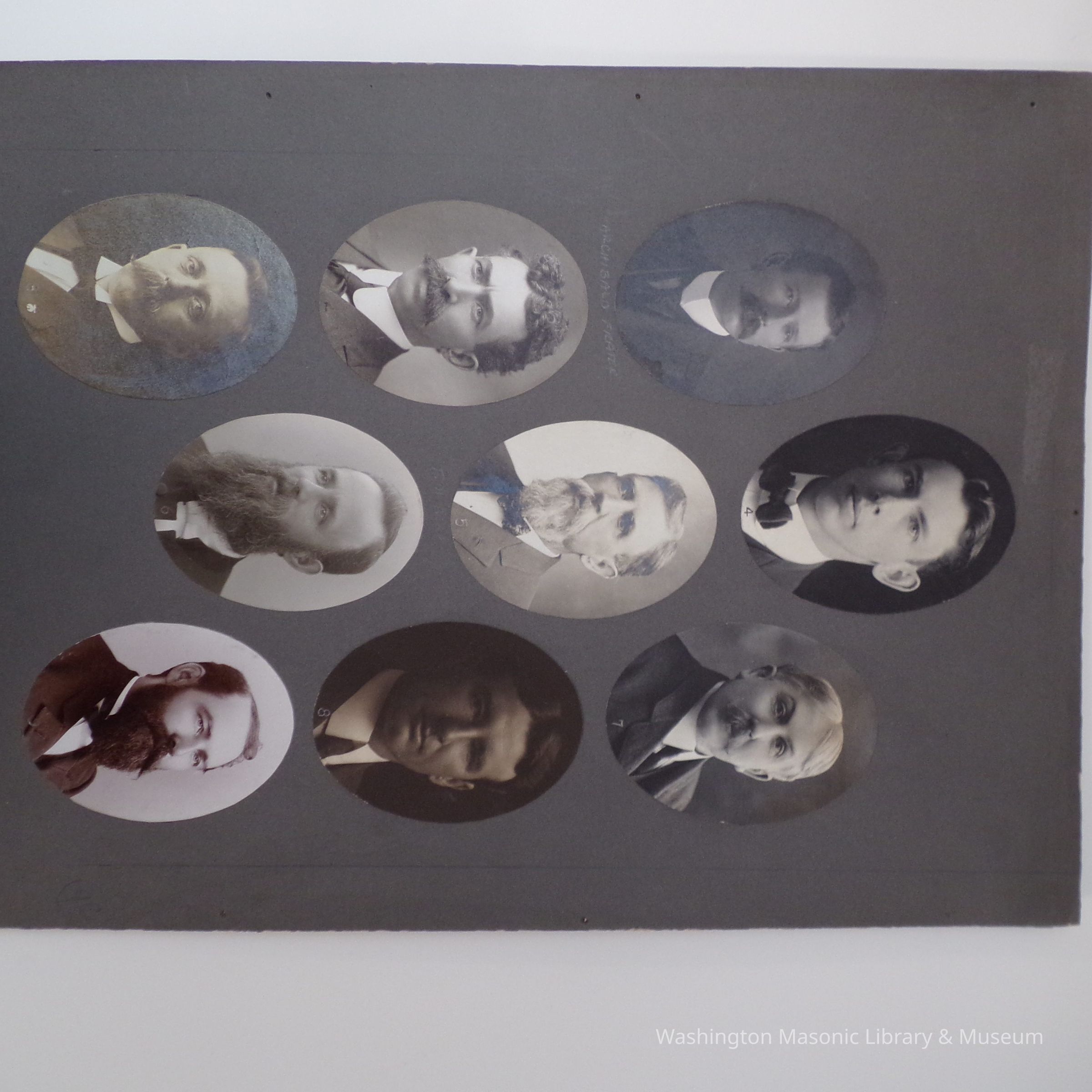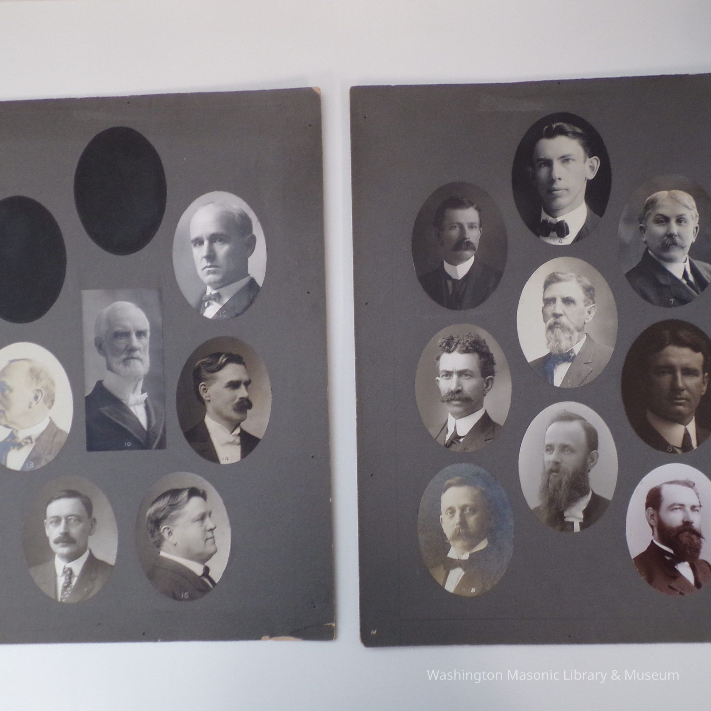 2 photo boards: photos of unknown masons ca. 1900s. Names written in pencil under four photographs.