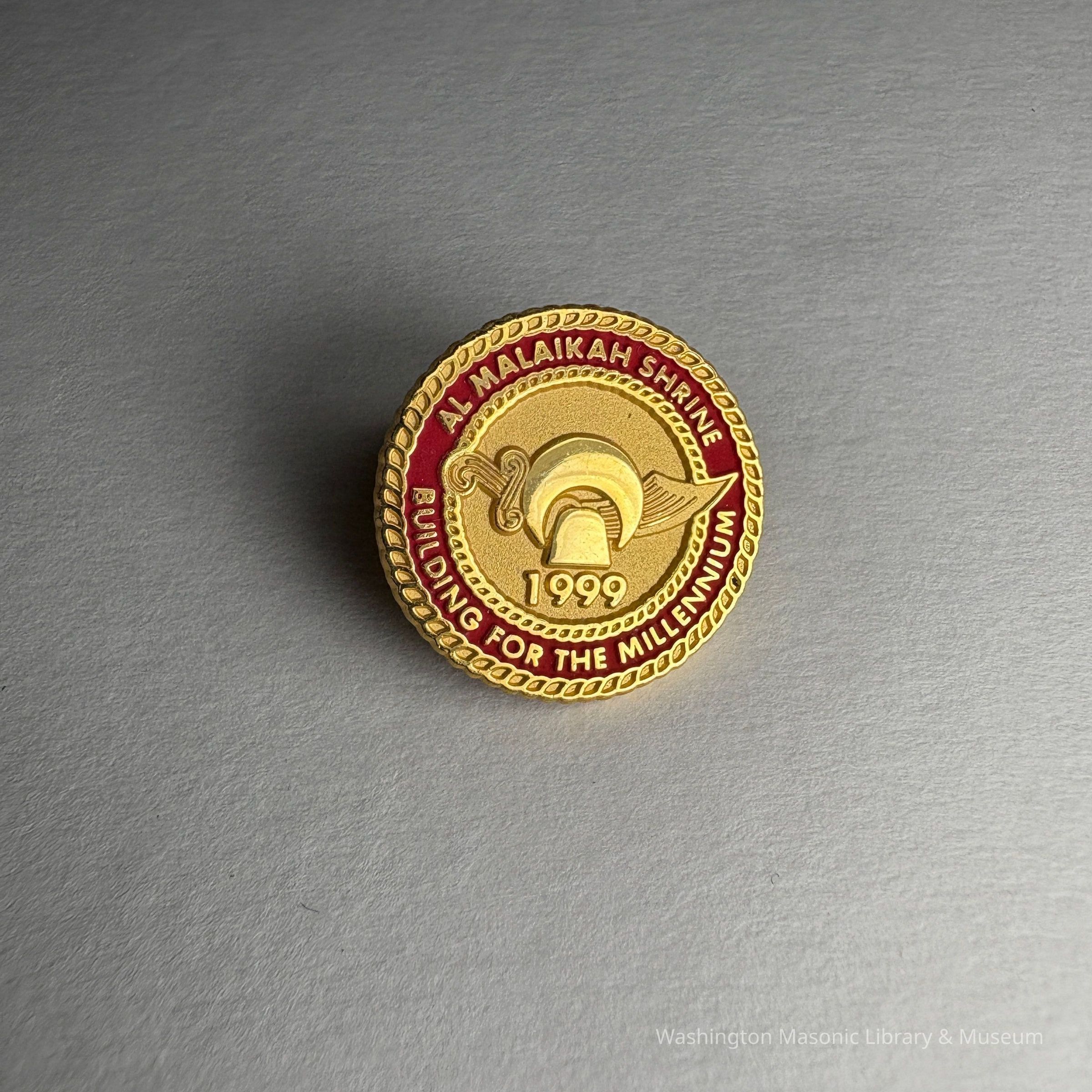 Pin: Circular. Gold with red detailing. "Al Malaikah Shrine/Building for the Millenium" Belonged to PGM James O. Wood (1999)Collection