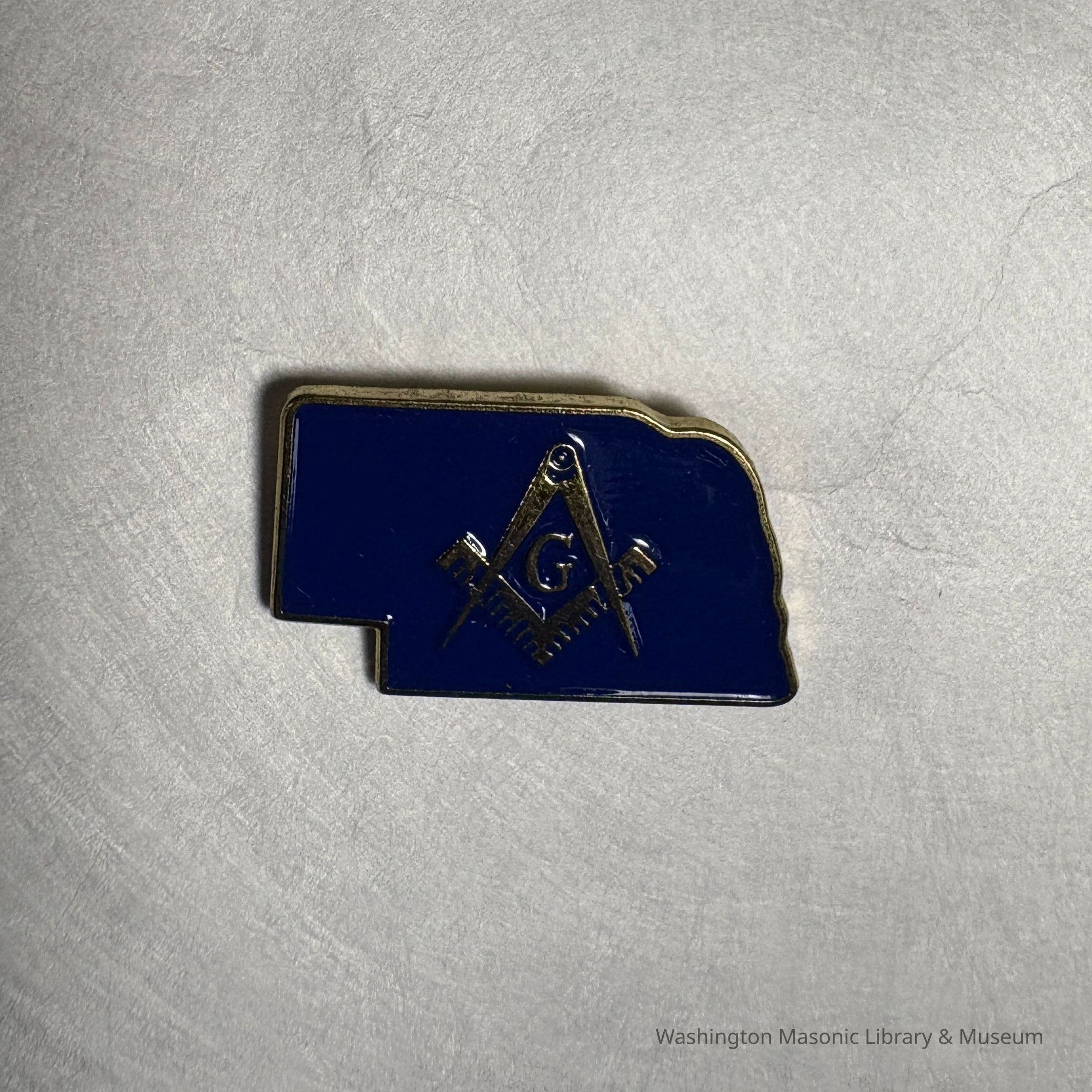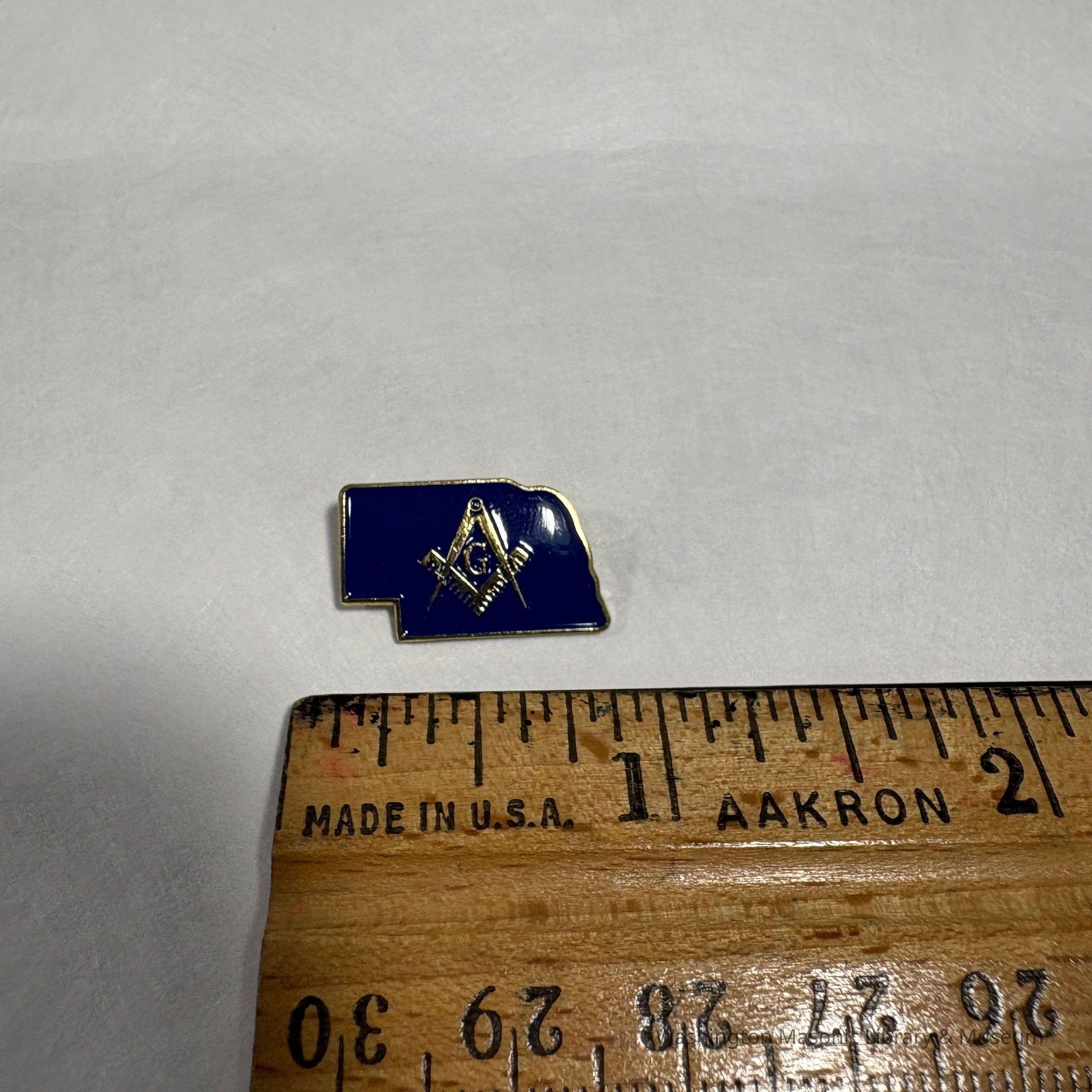Pin: Blue. In the shape of Nebraska, with Square and Compass. Presumably collected by PGM Sam Roberts during his year as Grand Master.Collection