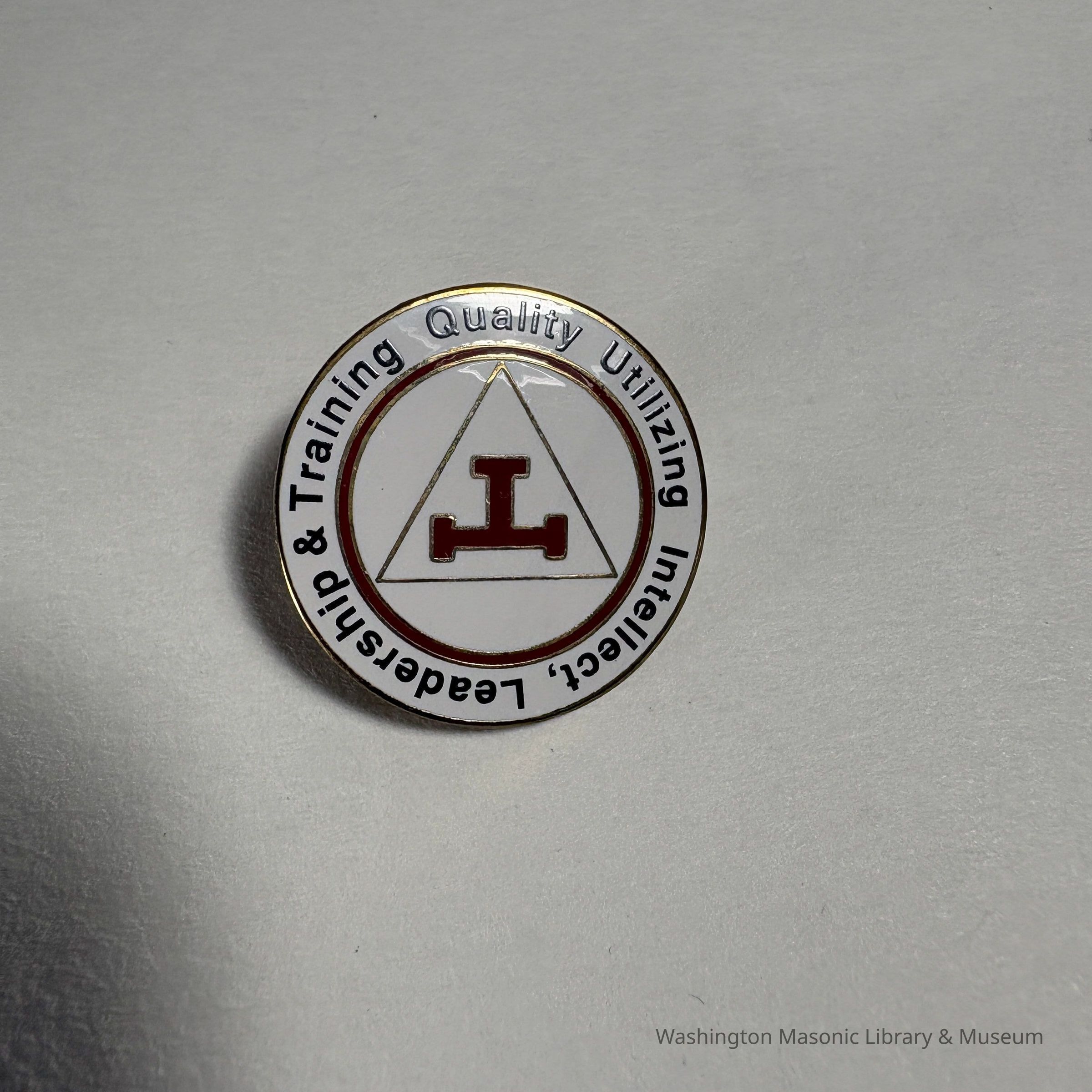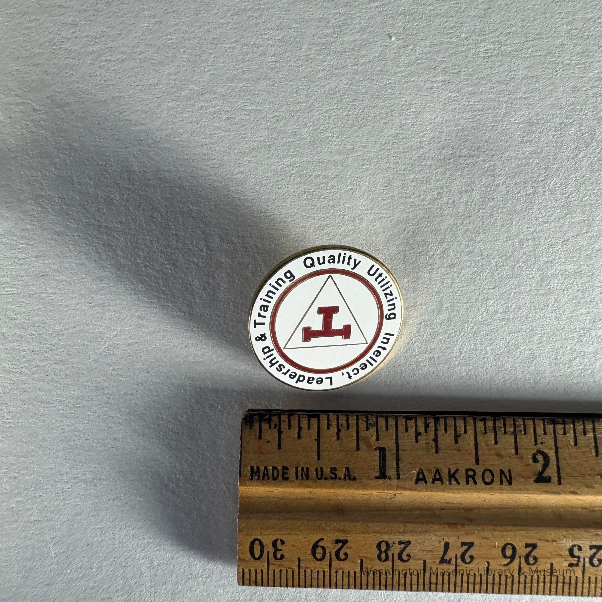 Pin: Circular. White and red with black lettering. R.A.M. "Quality Utilizing Intellect, Leadership & Training" Donated by PGM James O. Wood (c.1999)Collection
