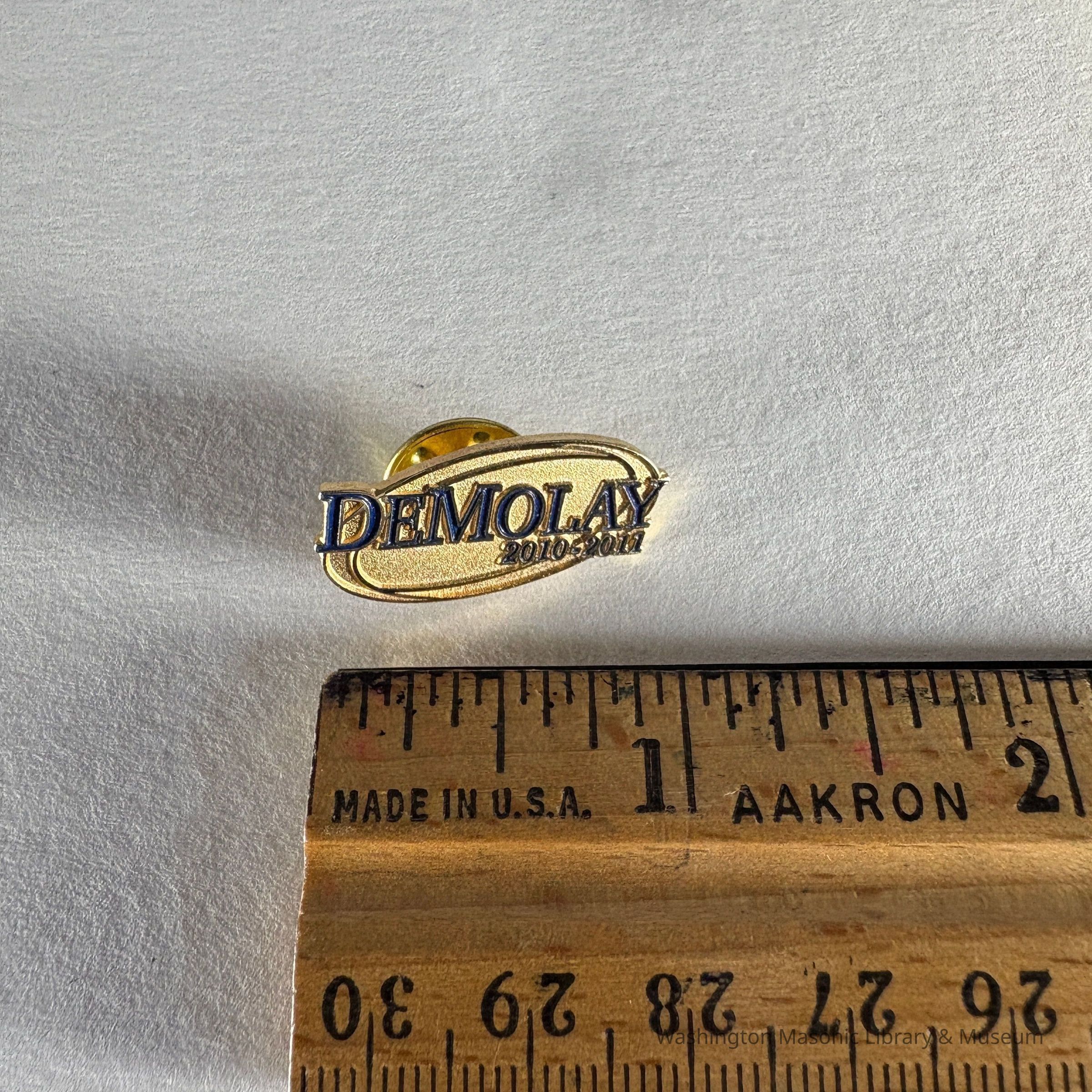 Pin: Gold with black lettering. "Demolay/2010-2011" Belonged to PGM James O. Wood (2011)Collection