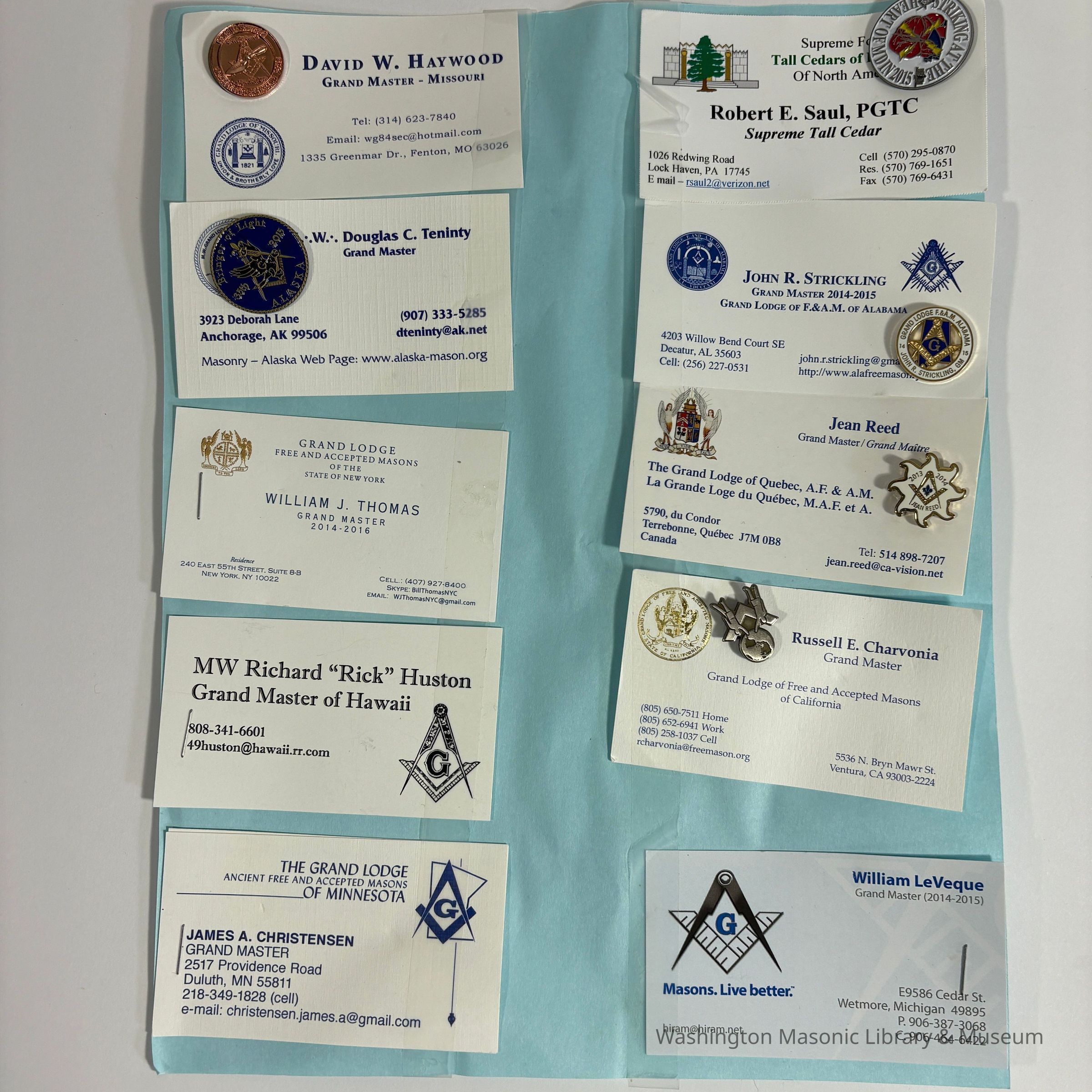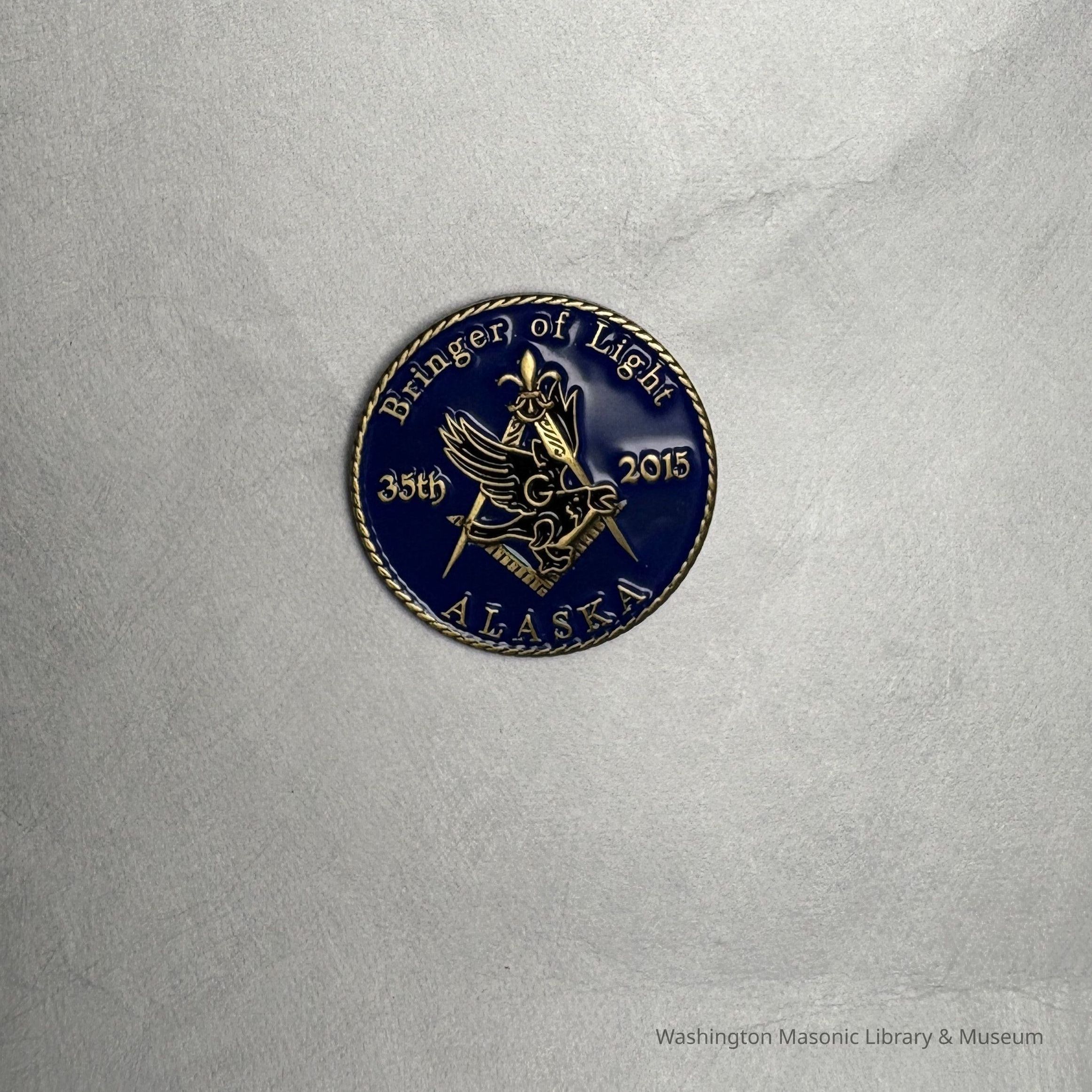 Pin: Blue and Gold. Square and compass and eagle. "Bringer of Light: 35th, 2015. Alaska". Presumably collected by PGM Sam Roberts during his year as Grand Master.Collection