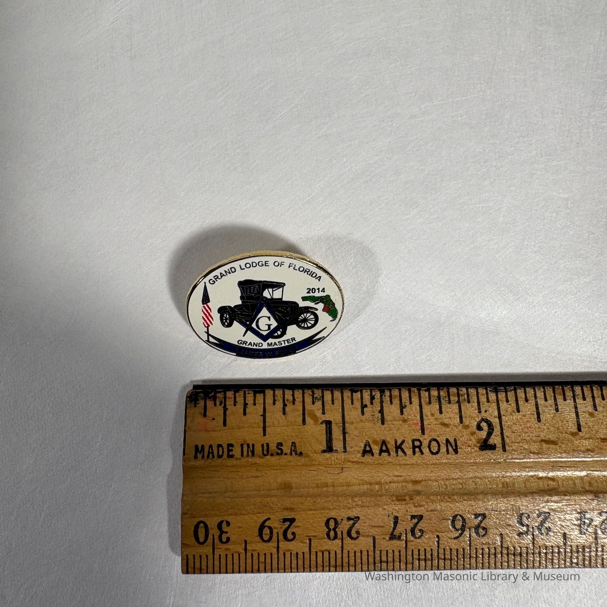 Pin: Oval, with a Ford automobile, square and compass, american flag, and state of florida outline. "Grand Lodge of Florida: Grand Master James W. Ford (2014)" Presumably collected by PGM Sam Roberts during his year as Grand Master.Collection