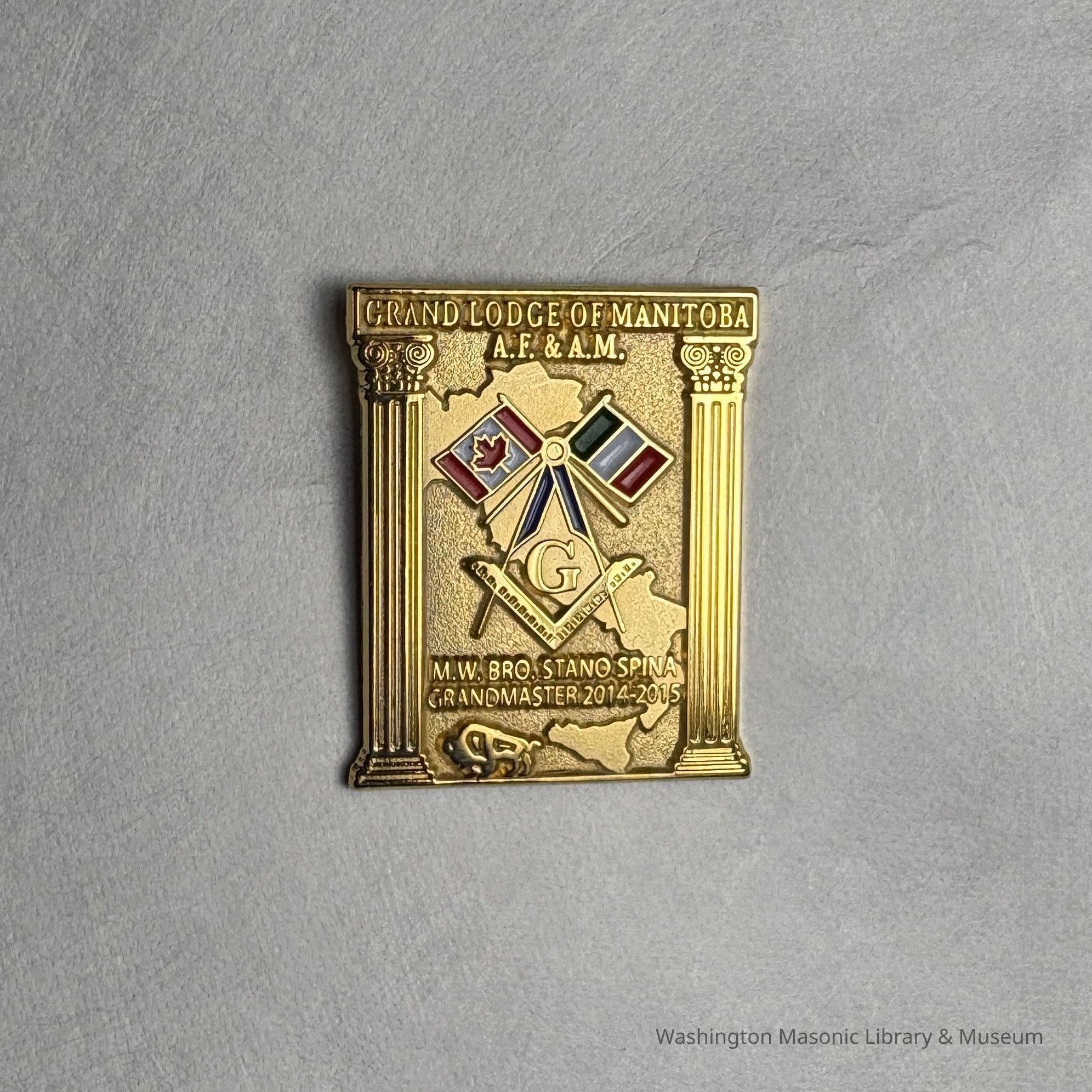 Pin: "Grand Lodge of Manitoba: MWB Stano Spina Grand Master (2014-2015)" Presumably collected by PGM Sam Roberts during his year as Grand Master.Entry/Object ID