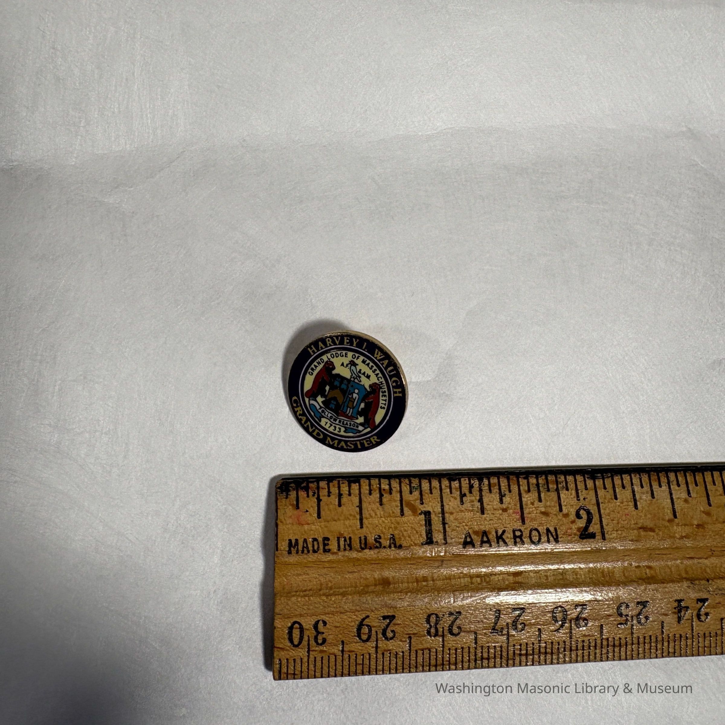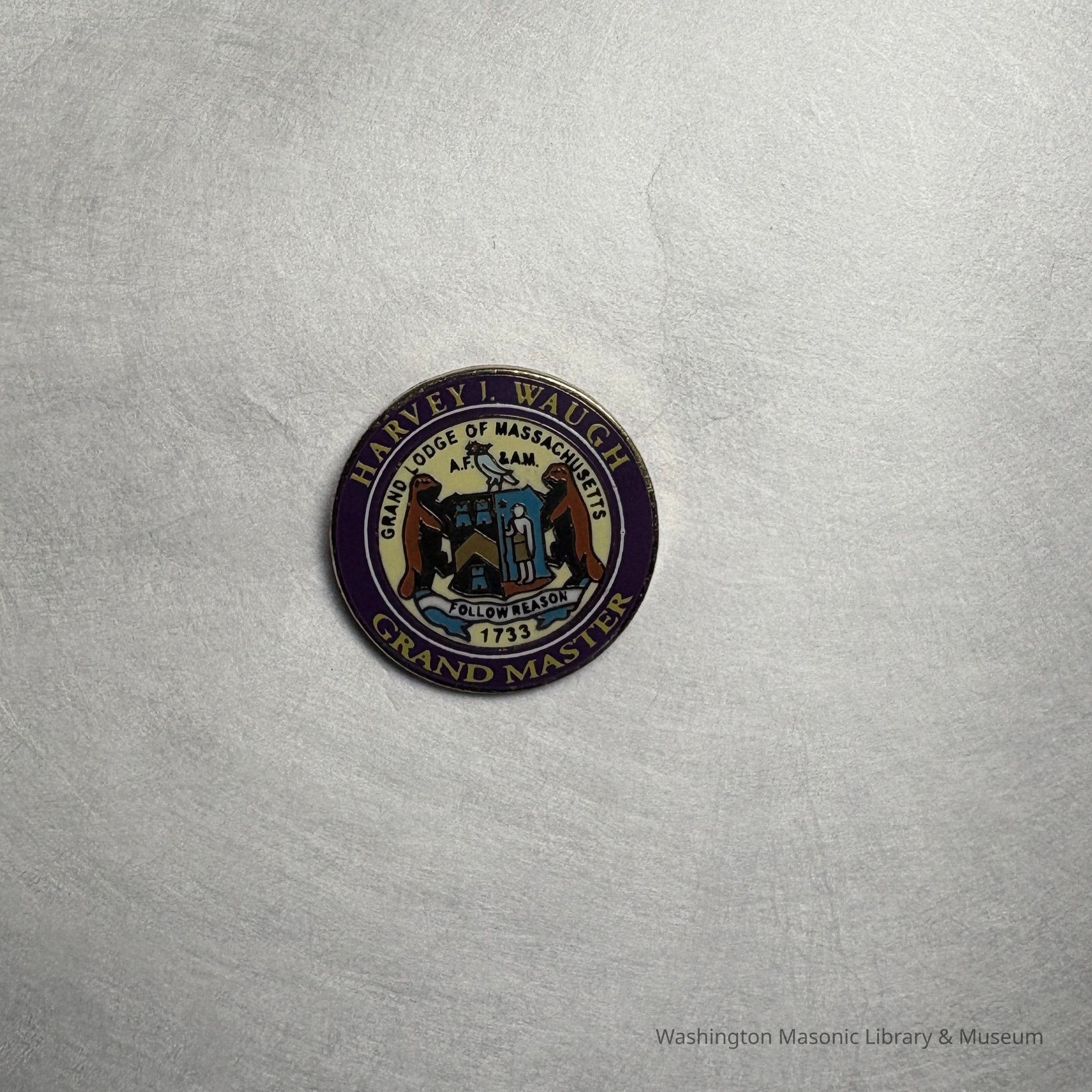 Pin: "Grand Lodge of Massachusetts: Harvey I. Waugh, Grand Master" Seal of Massachusetts. Presumably collected by PGM Sam Roberts during his year as Grand Master.Collection