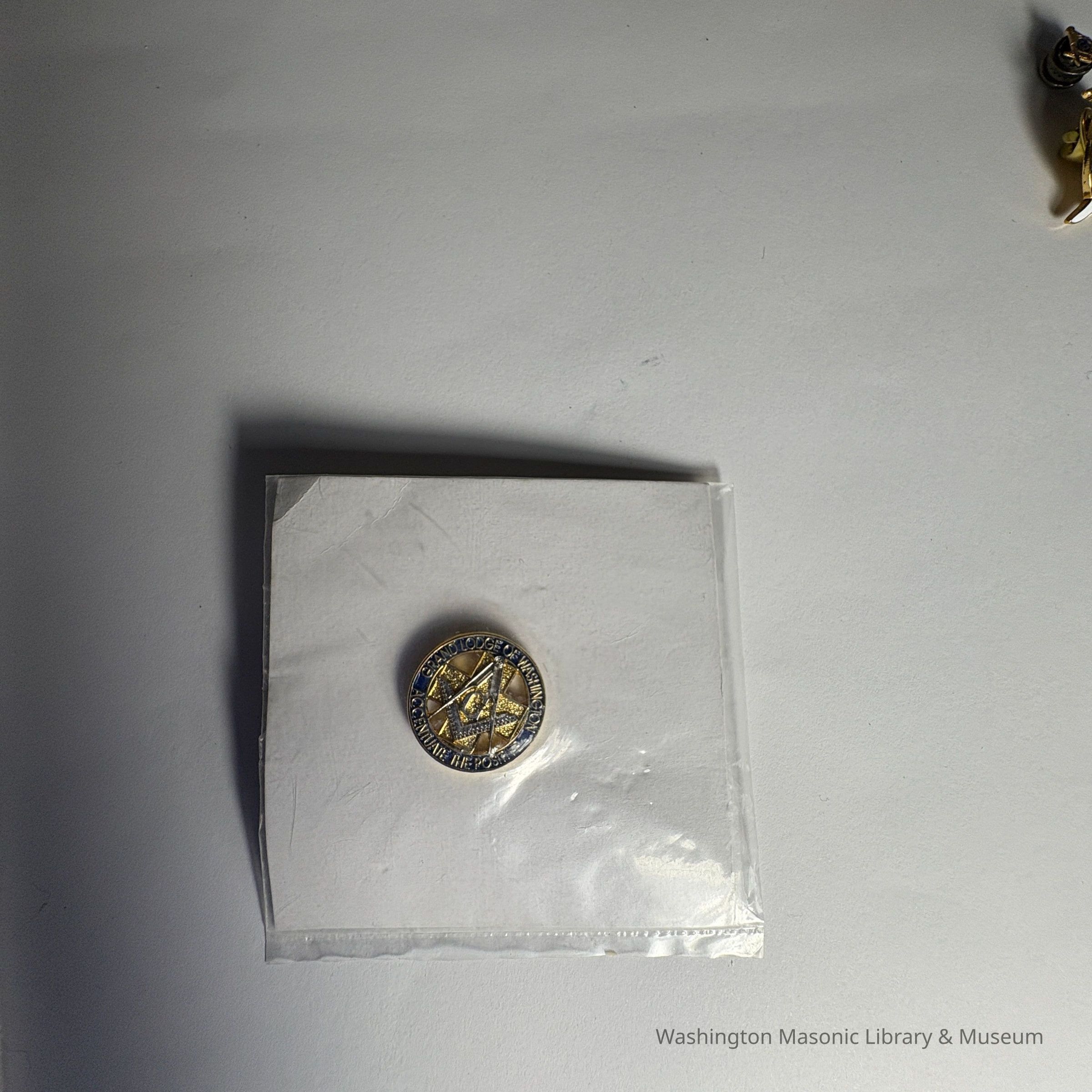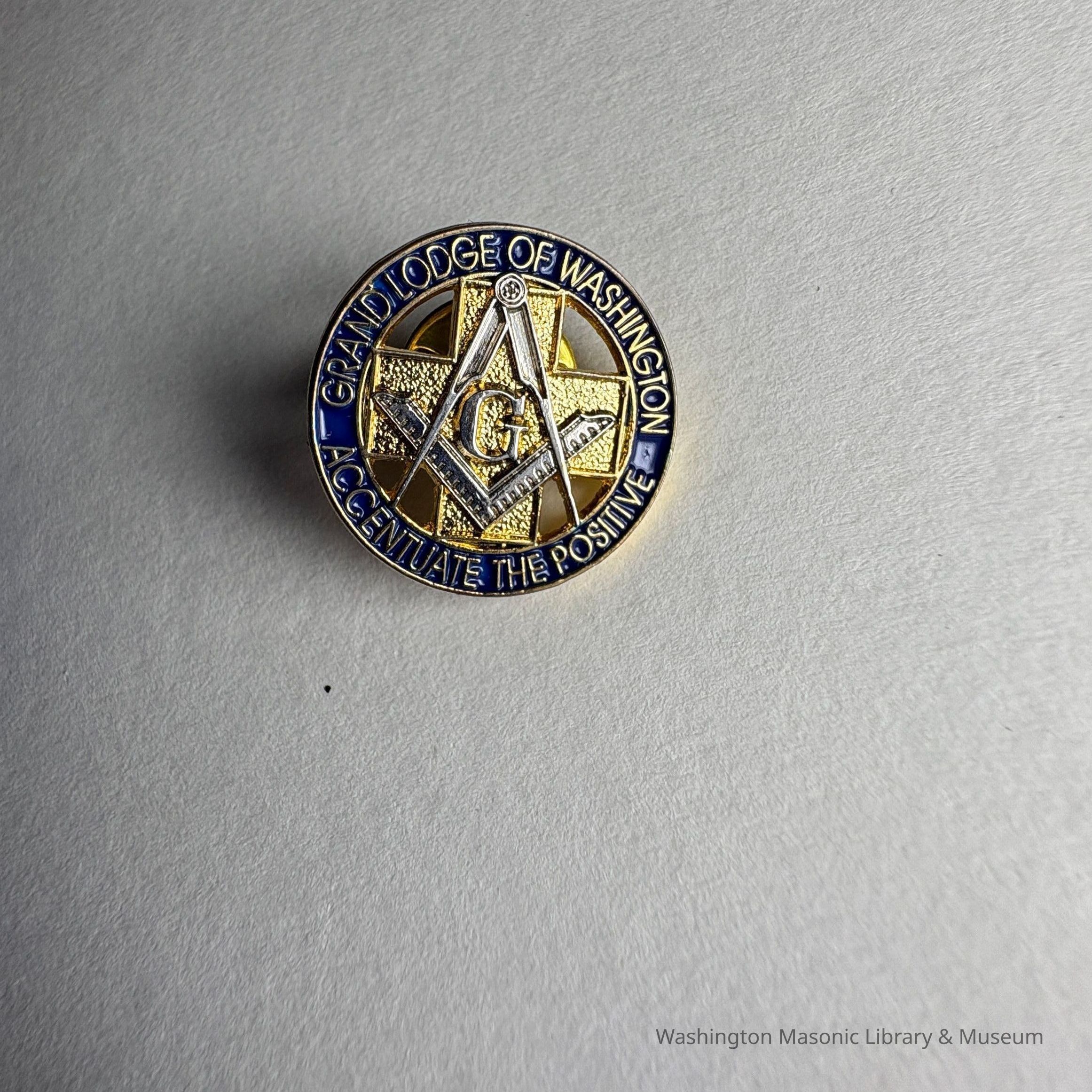 Pin: "Grand Lodge of Washington/Accentuate the Positive." This pin was given out by Grand Master Wayne Irvine Smith during his year (2007-2008). Found in a cash of pins donated by PGM James O. Wood.Collection