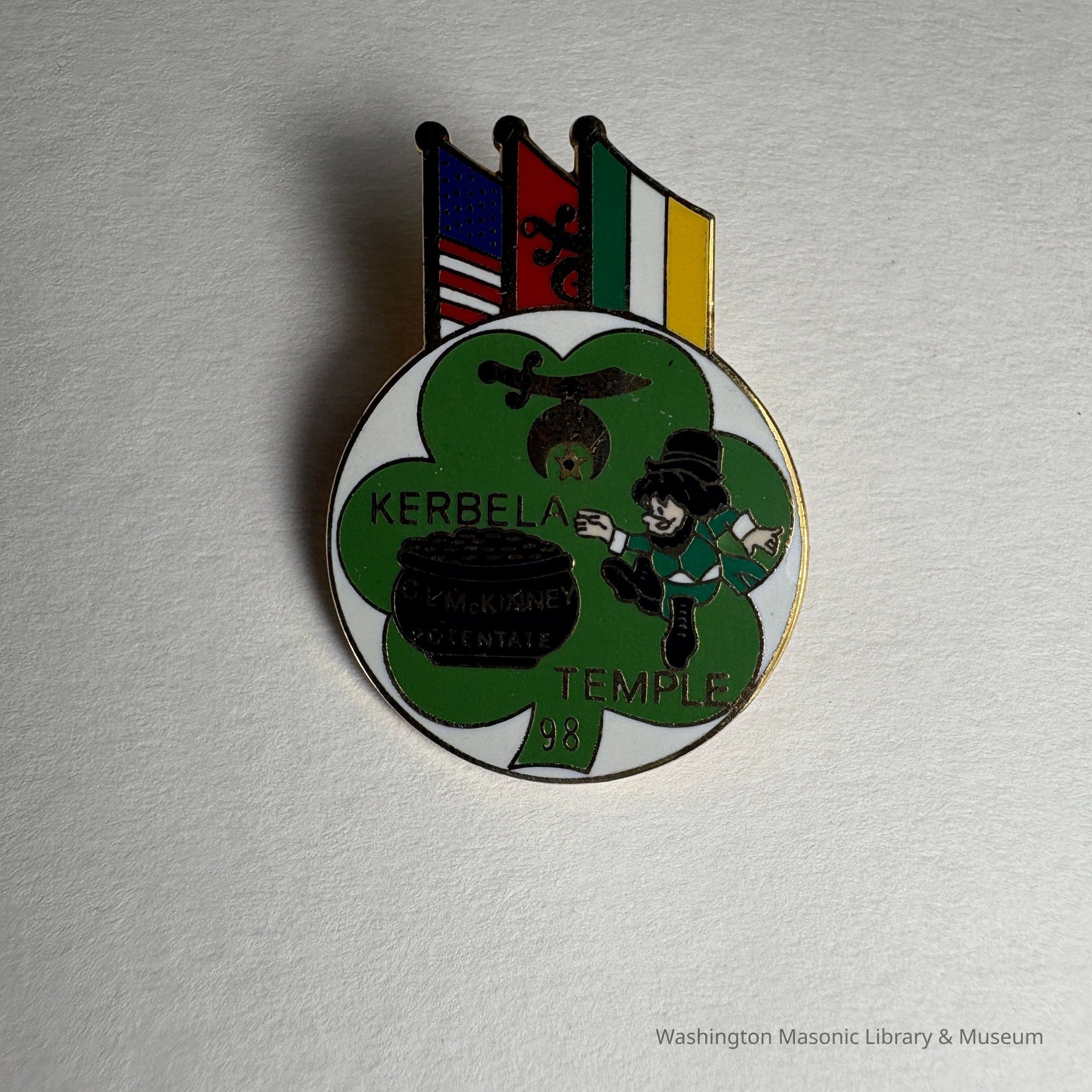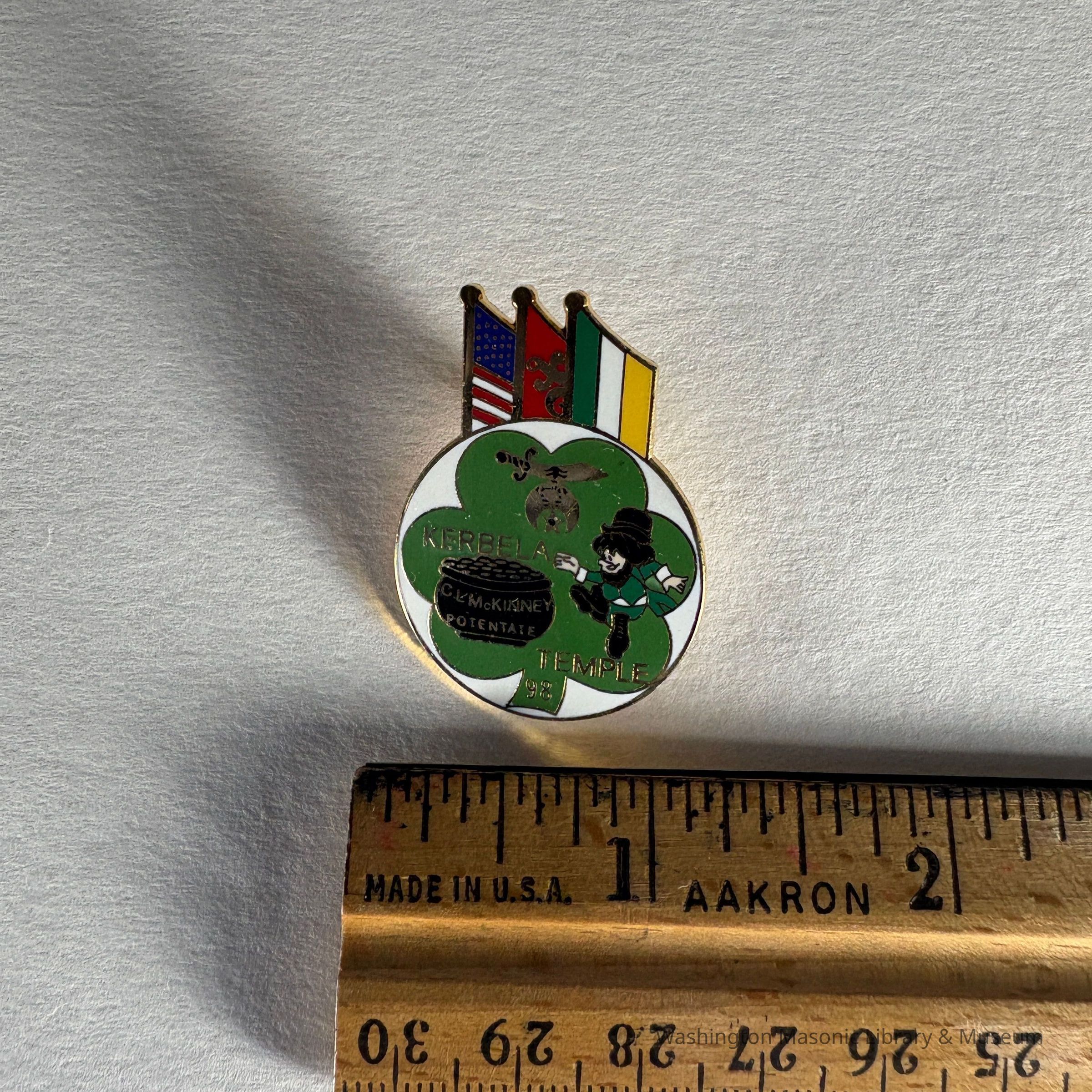Pin: Multicolored. Three Leaf clover, pot of gold, lepracaun, American flag, Shriner flag, Irish flag. "Kerbela Temple 98/C.L. McKinney Potentate" Donated by PGM James O. Wood (1998)Collection