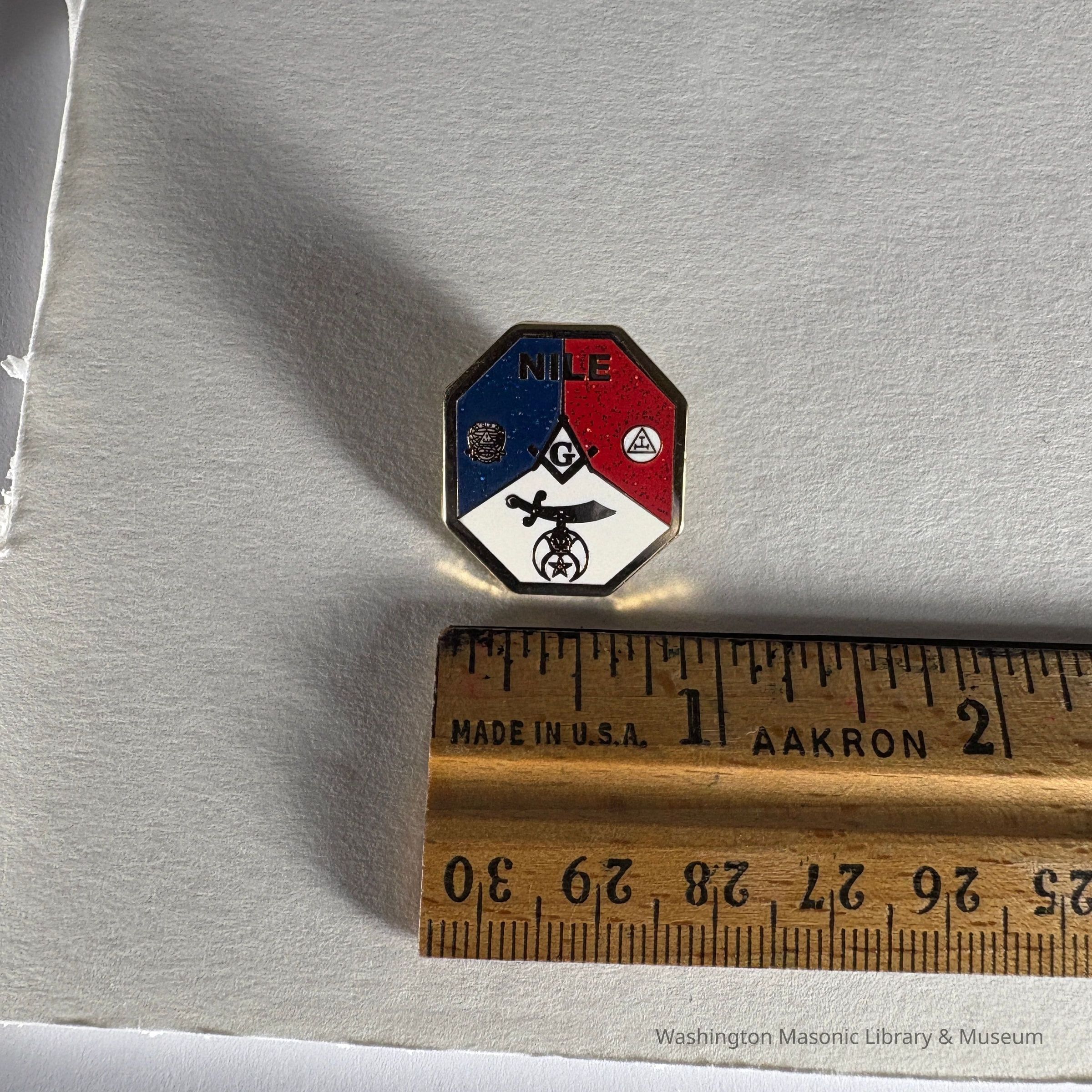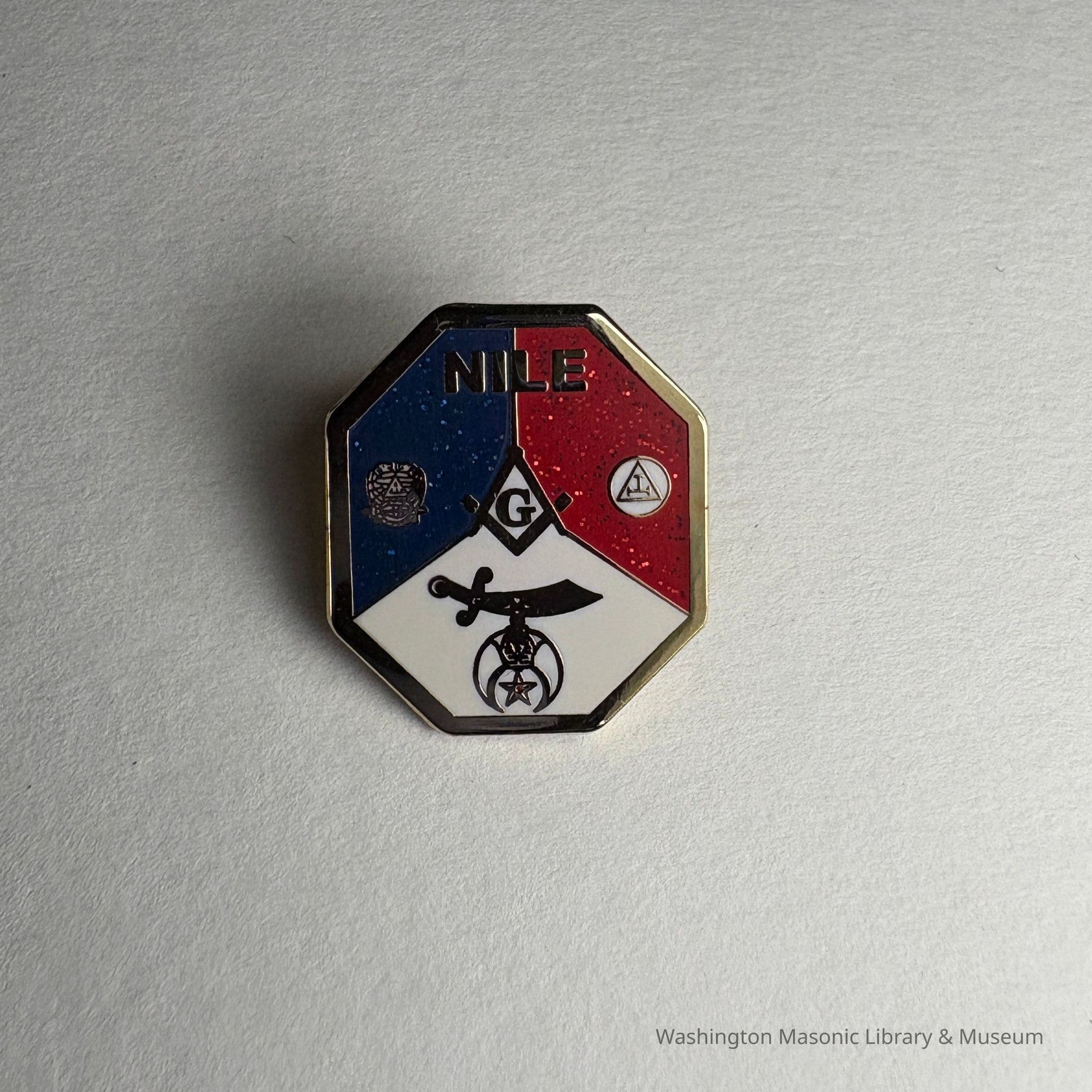 Pin: Red, Blue, and white with gold trim. Nile Shrine. Shrine symbols, R.A.M. symbols, and square and compass. Donated by PGM James O. Wood (c.1999)Collection
