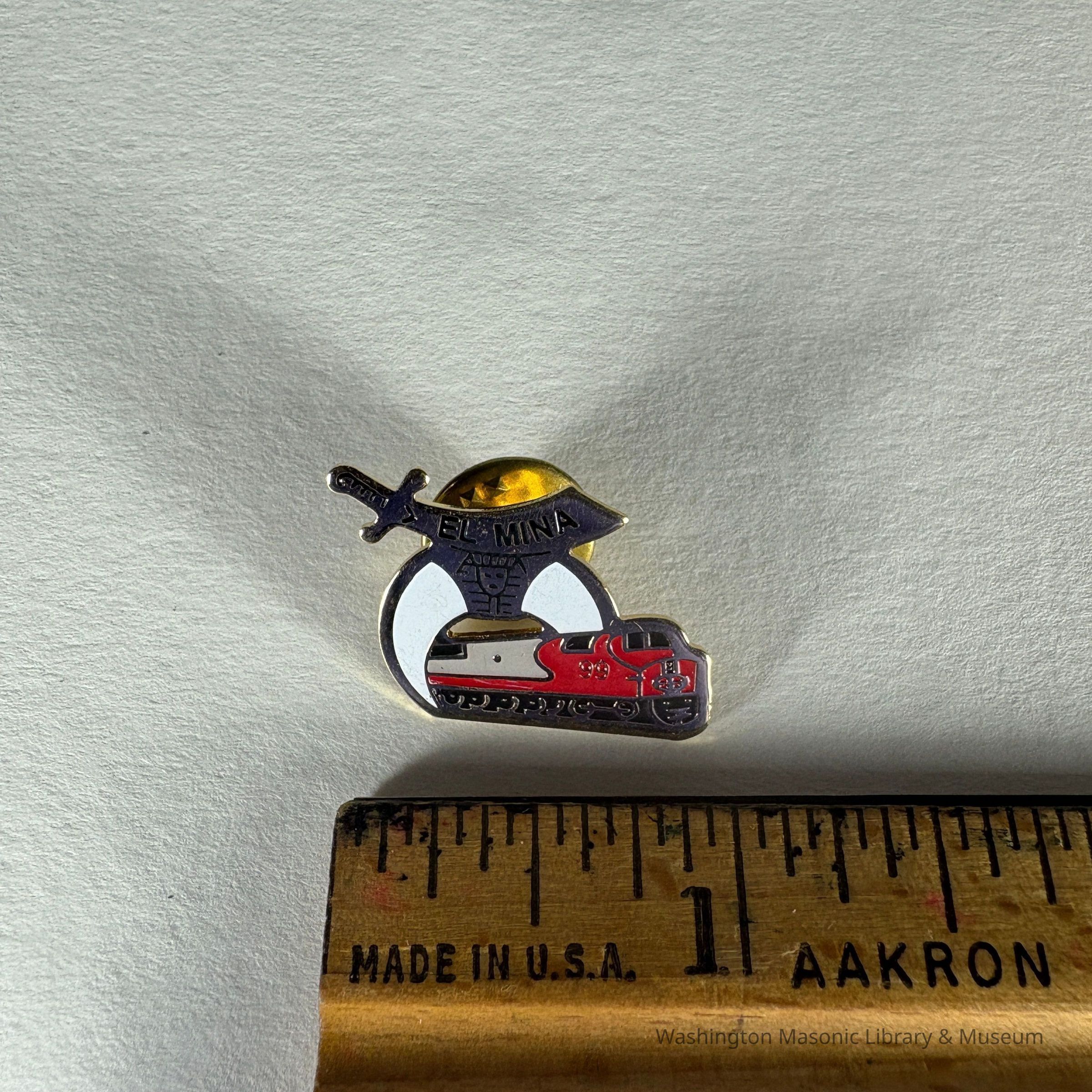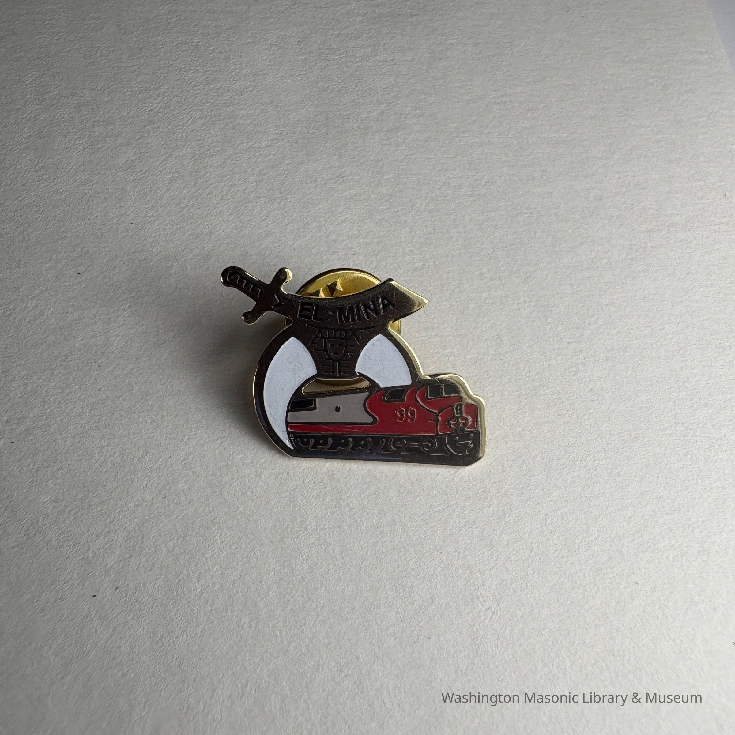Pin: red, gold and white with black lettering. Scimitar, crescent, train. "El Mina/99" Donated by PGM James O. Wood. (1999)Collection