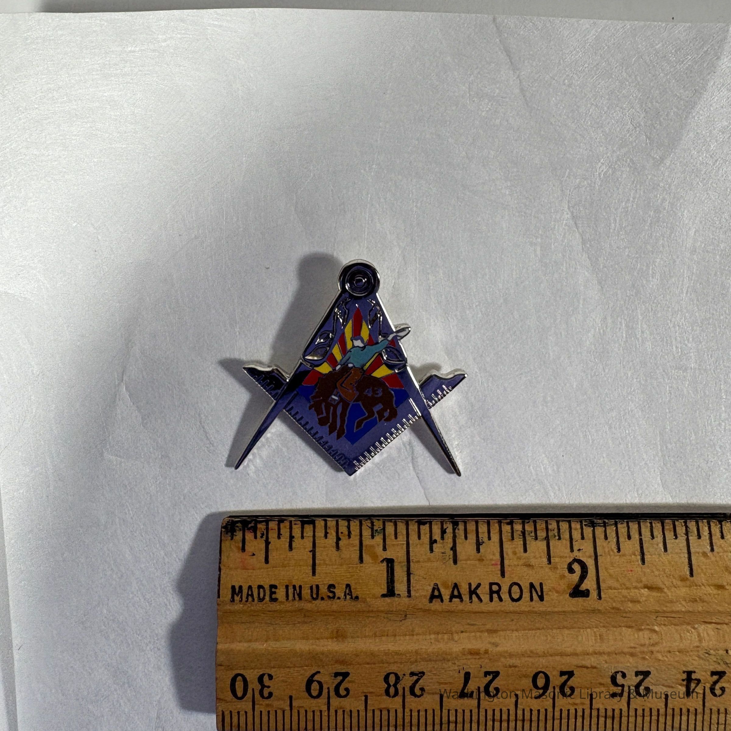 Pin: In the Shape of the Square and Compass. Arizona flag in the background. Rider on a bucking horse branded with "43".