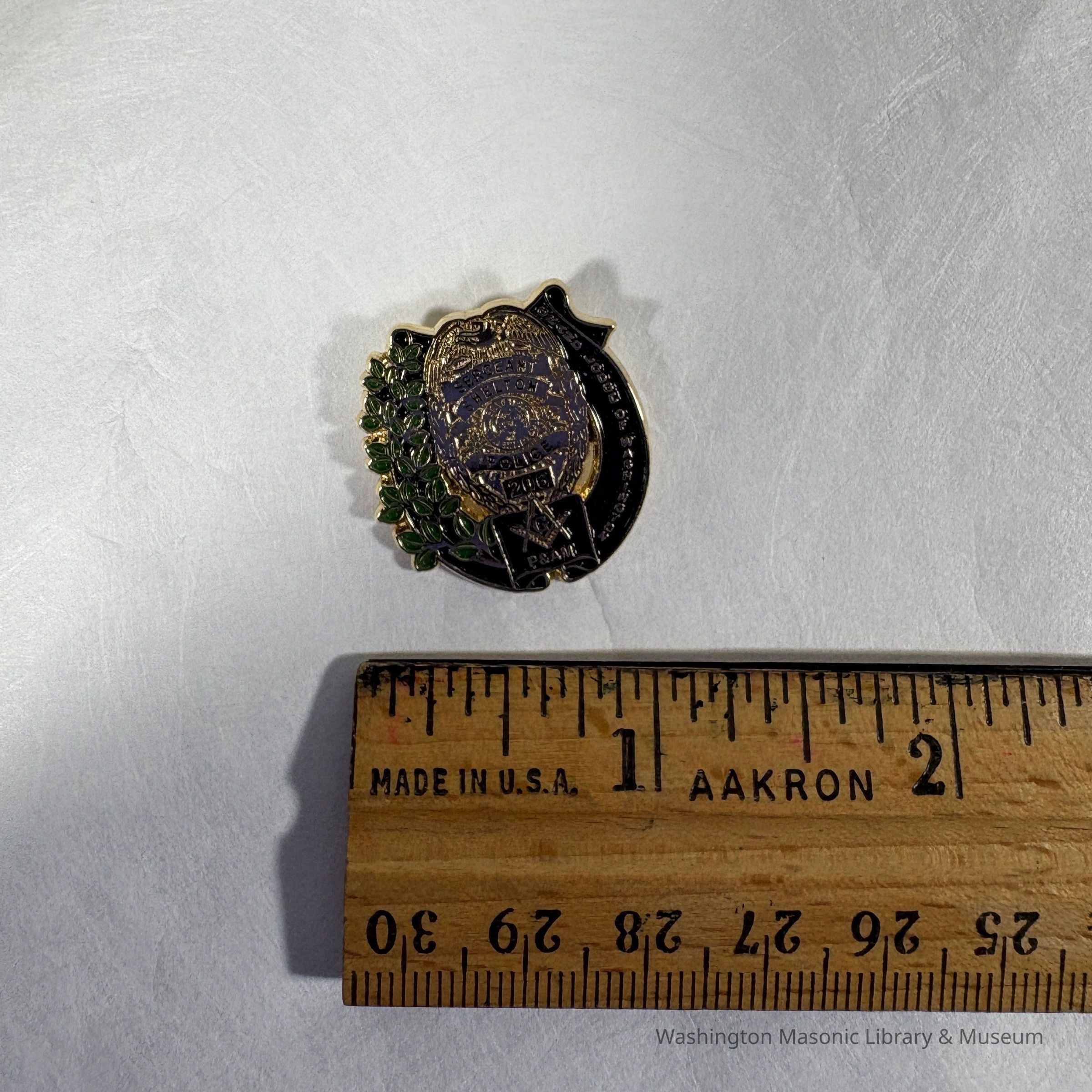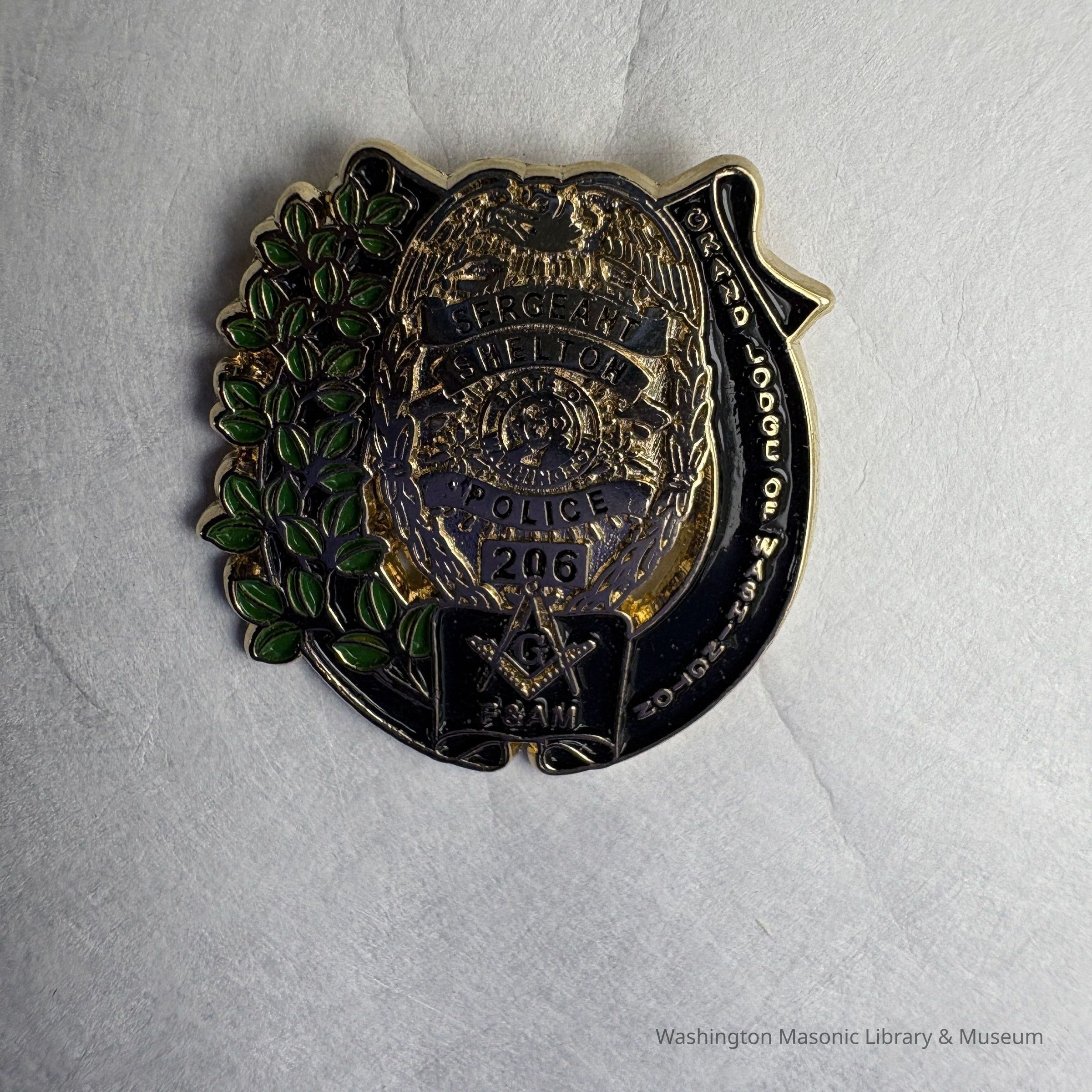 Pin: Gold with Black and Green. A Police Sergeant Badge. "Sergeant Shelton/Police/206/F&AM". (2011)