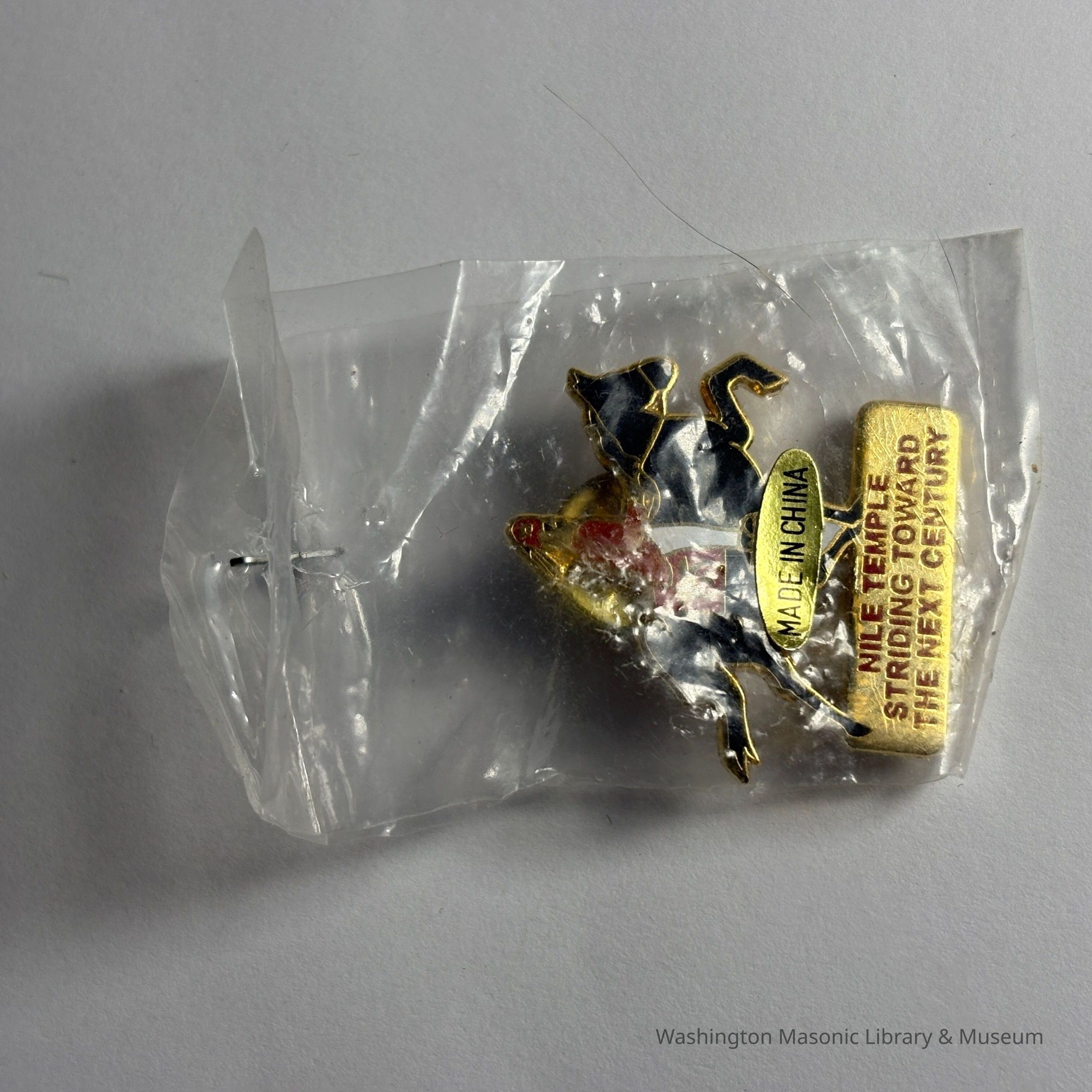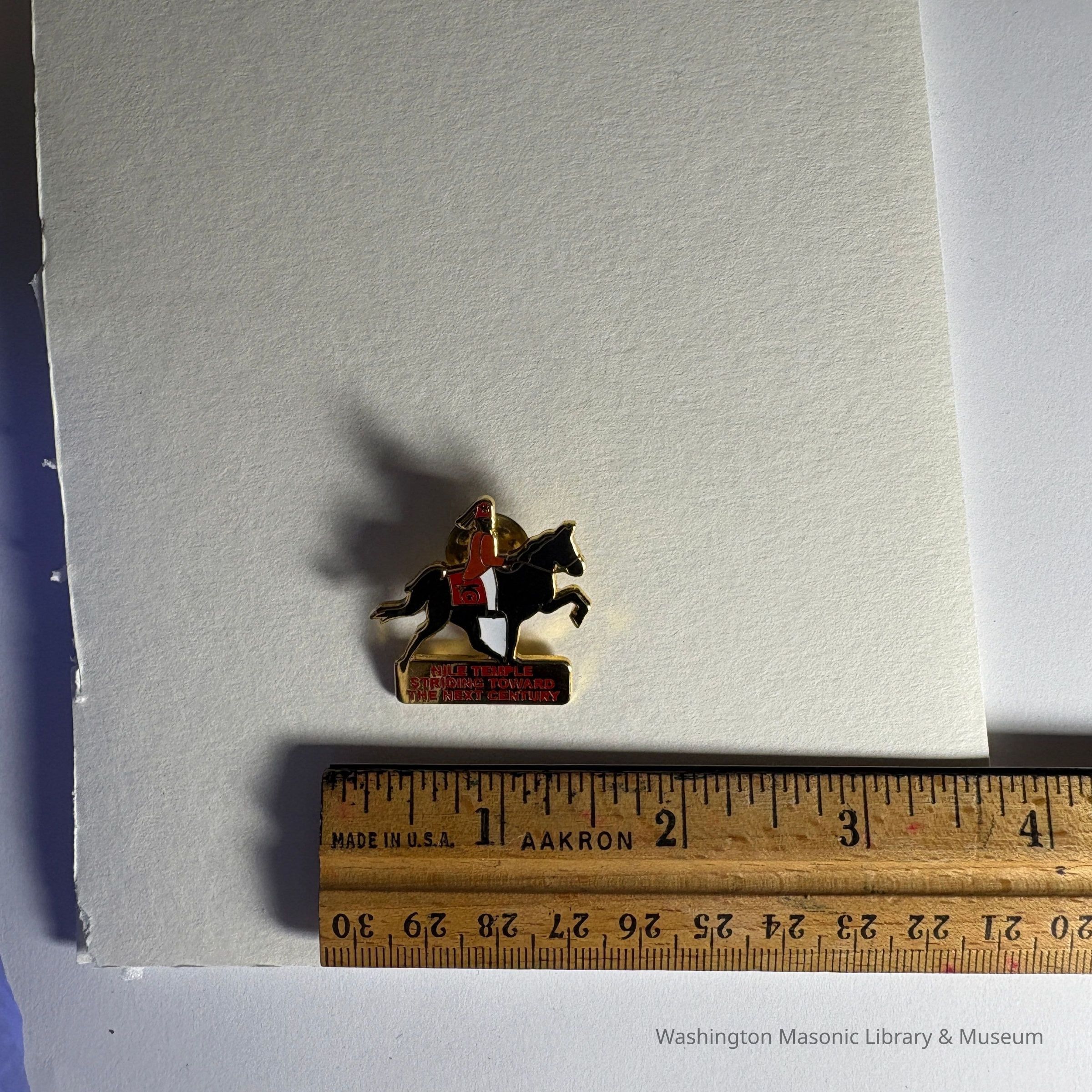 Pin: Shriner riding a black horse. "Nile Temple/Striding Toward/The Next Century" Belonged to by PGM James O. Wood.Entry/Object ID