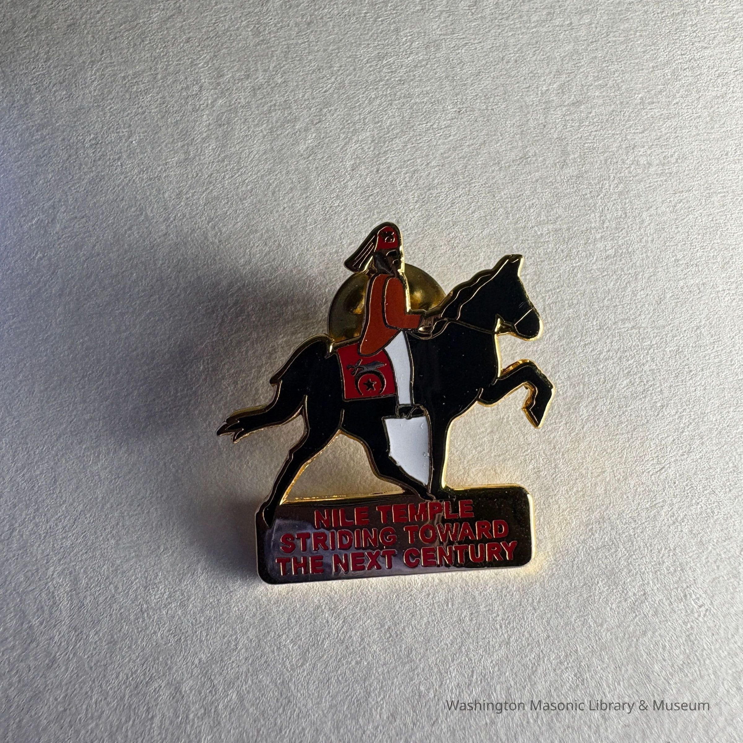 Pin: Shriner riding a black horse. "Nile Temple/Striding Toward/The Next Century" Found in a cash of pins donated by PGM James O. Wood.Collection