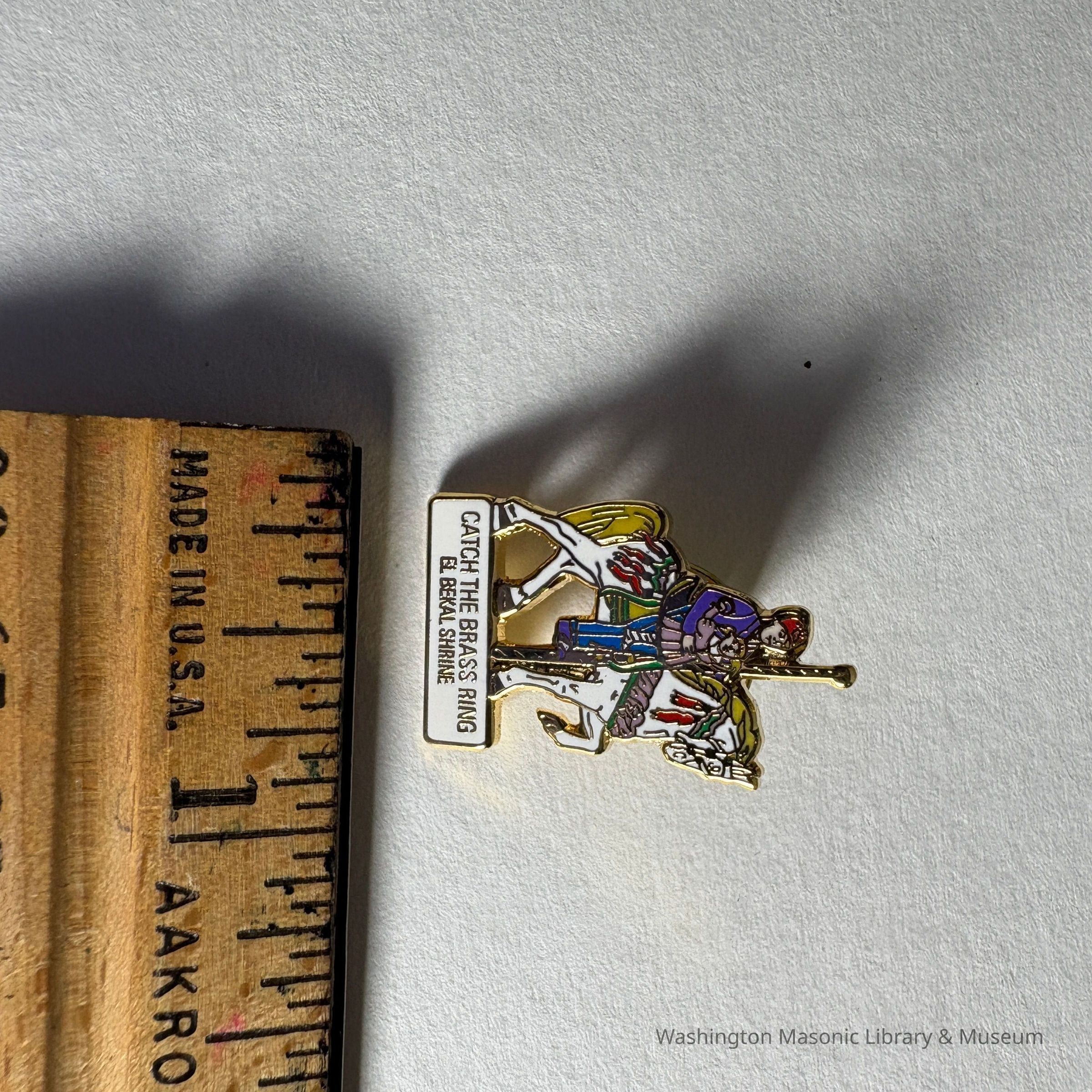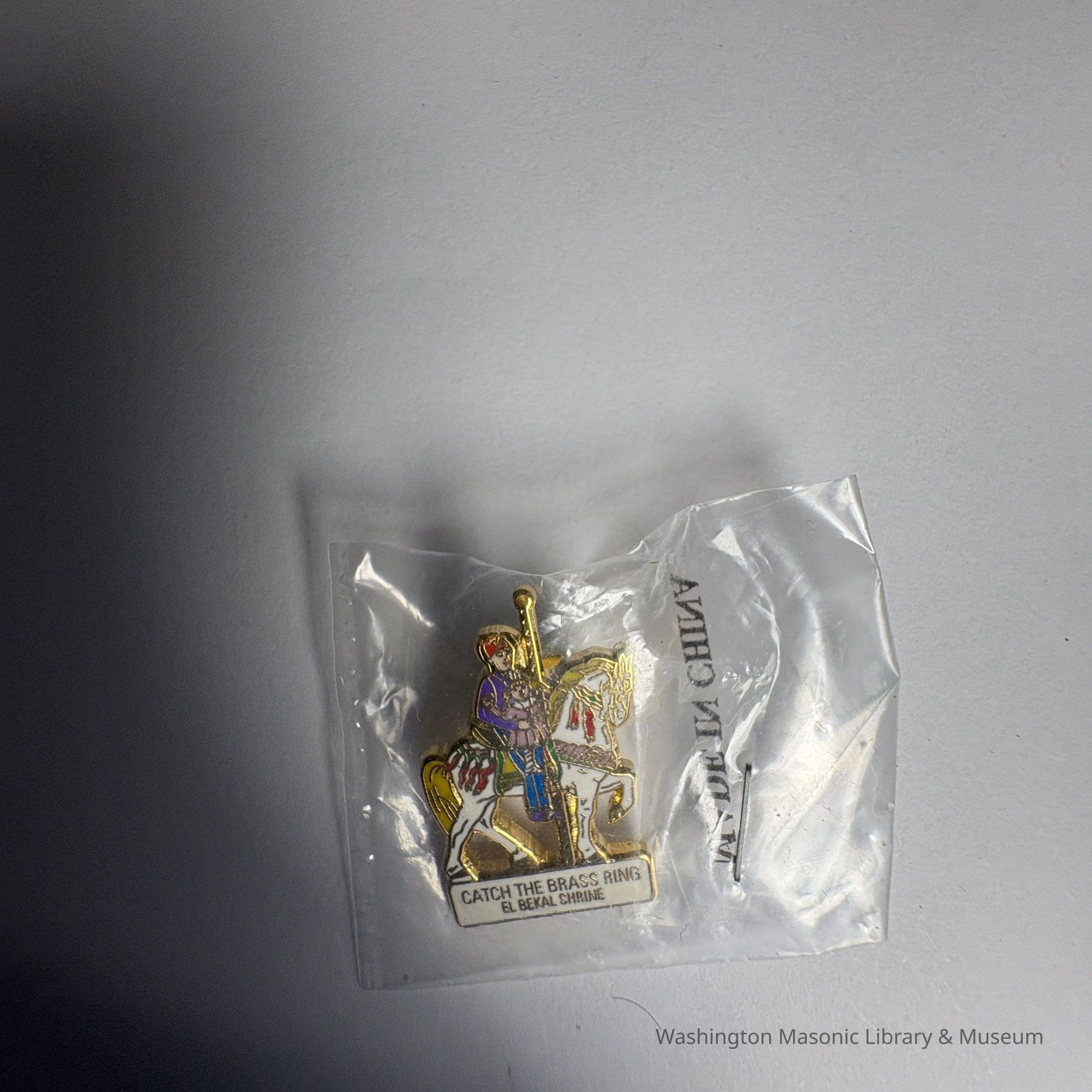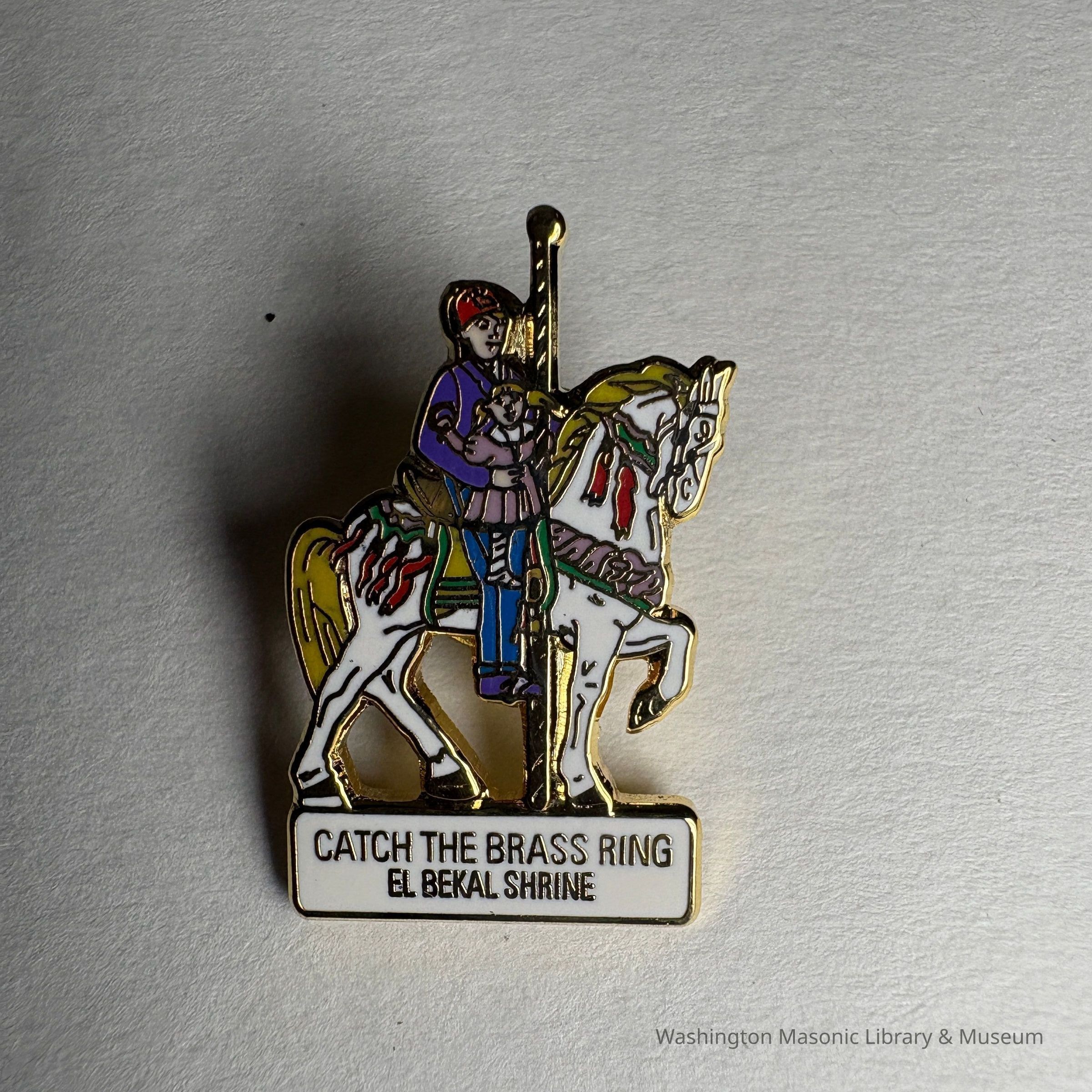 Pin: Shriner riding a white carasoul horse. "Catch the Brass Ring/ El Bekal Shrine" Belonged to PGM James O. Wood.Entry/Object ID