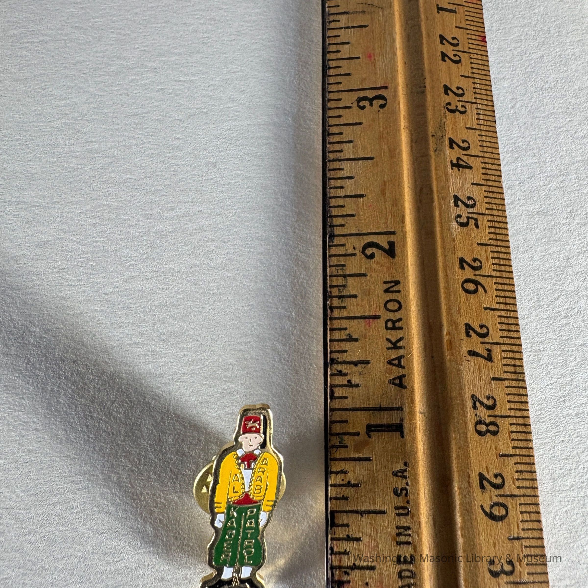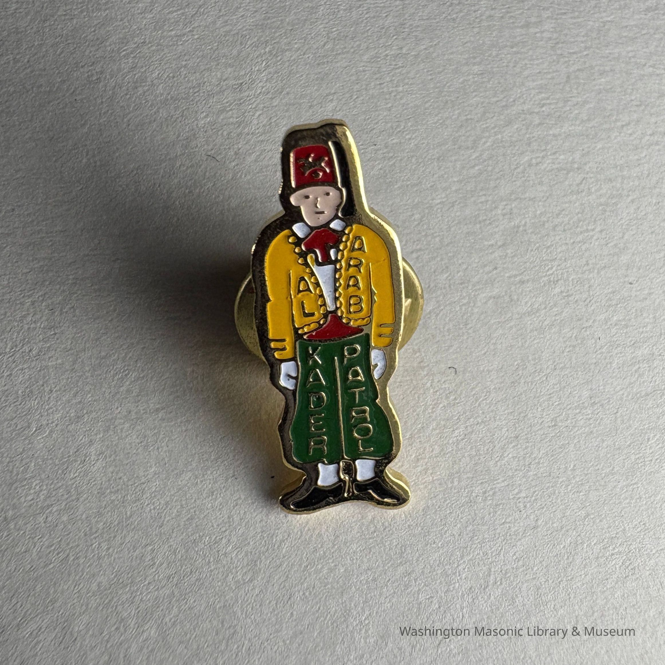 Pin: Yellow, red, white, and green. Shriner wearing a fez. "Al Kader Arab Patrol" Donated by PGM James O. Wood (c.1999)Collection