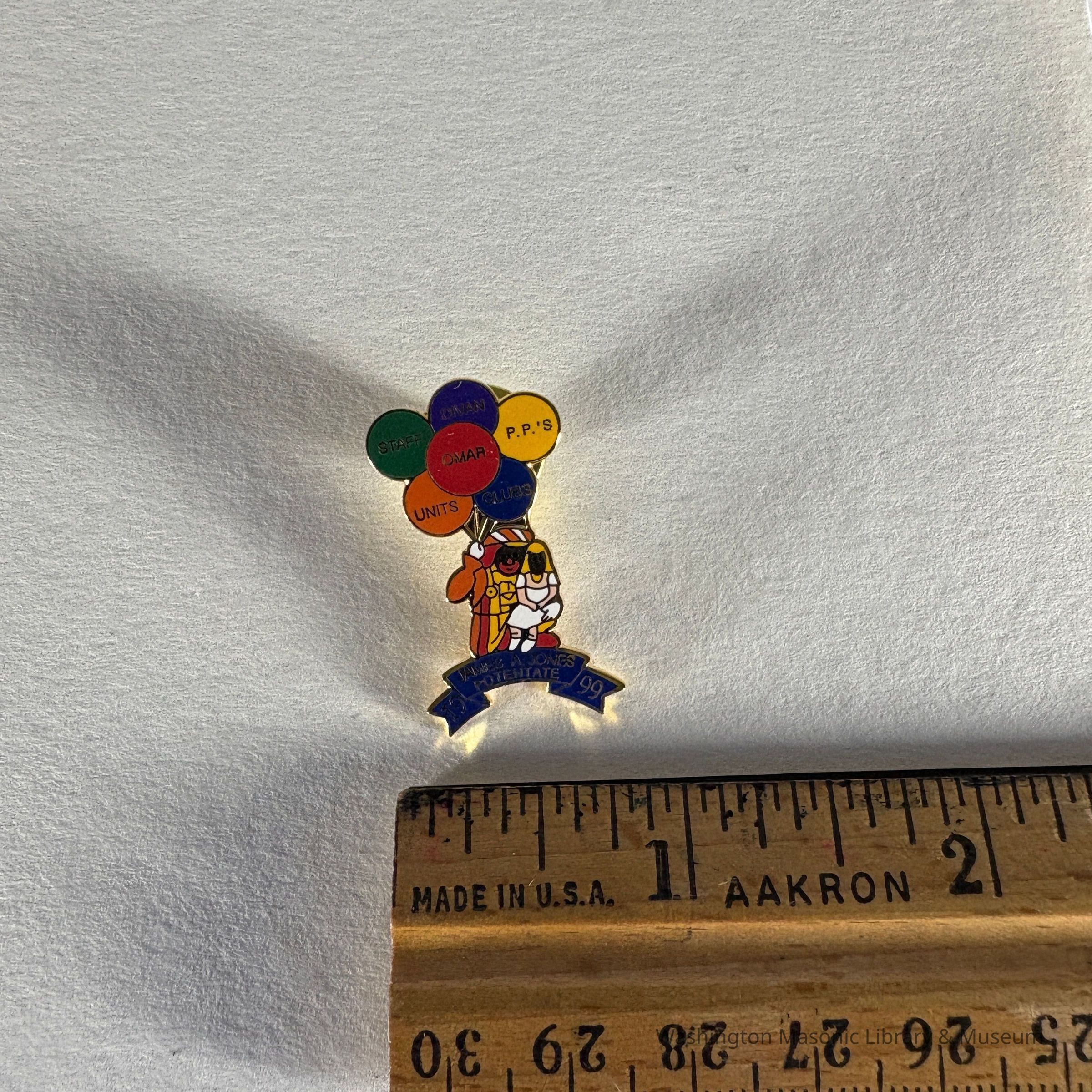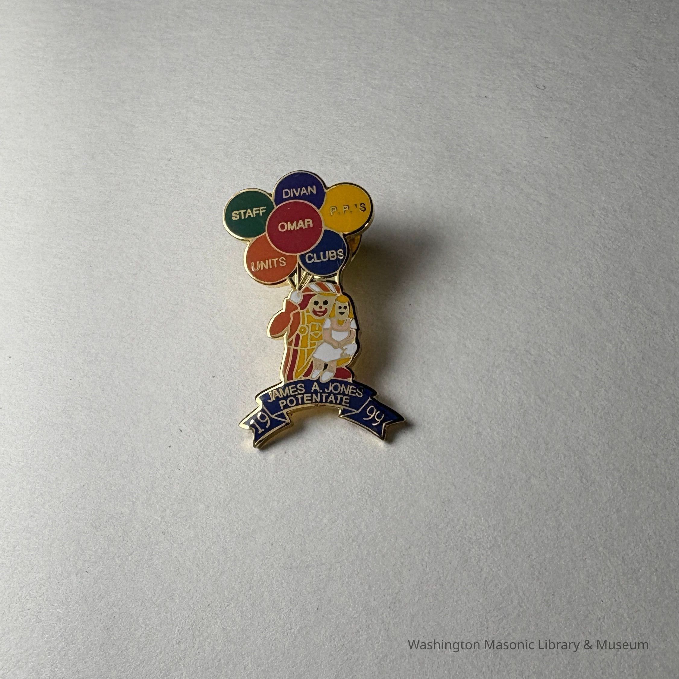 Pin: Shriner holding six balloons of different colors, and child on lap. Each balloon says a different word:"staff/ divian/ P.P.'s/Omar/ Units/ Clubs" Below the shriner is written: "James A. Jones/ Potentate/ 1999" Donated by PGM James O. Wood (1999)Collection