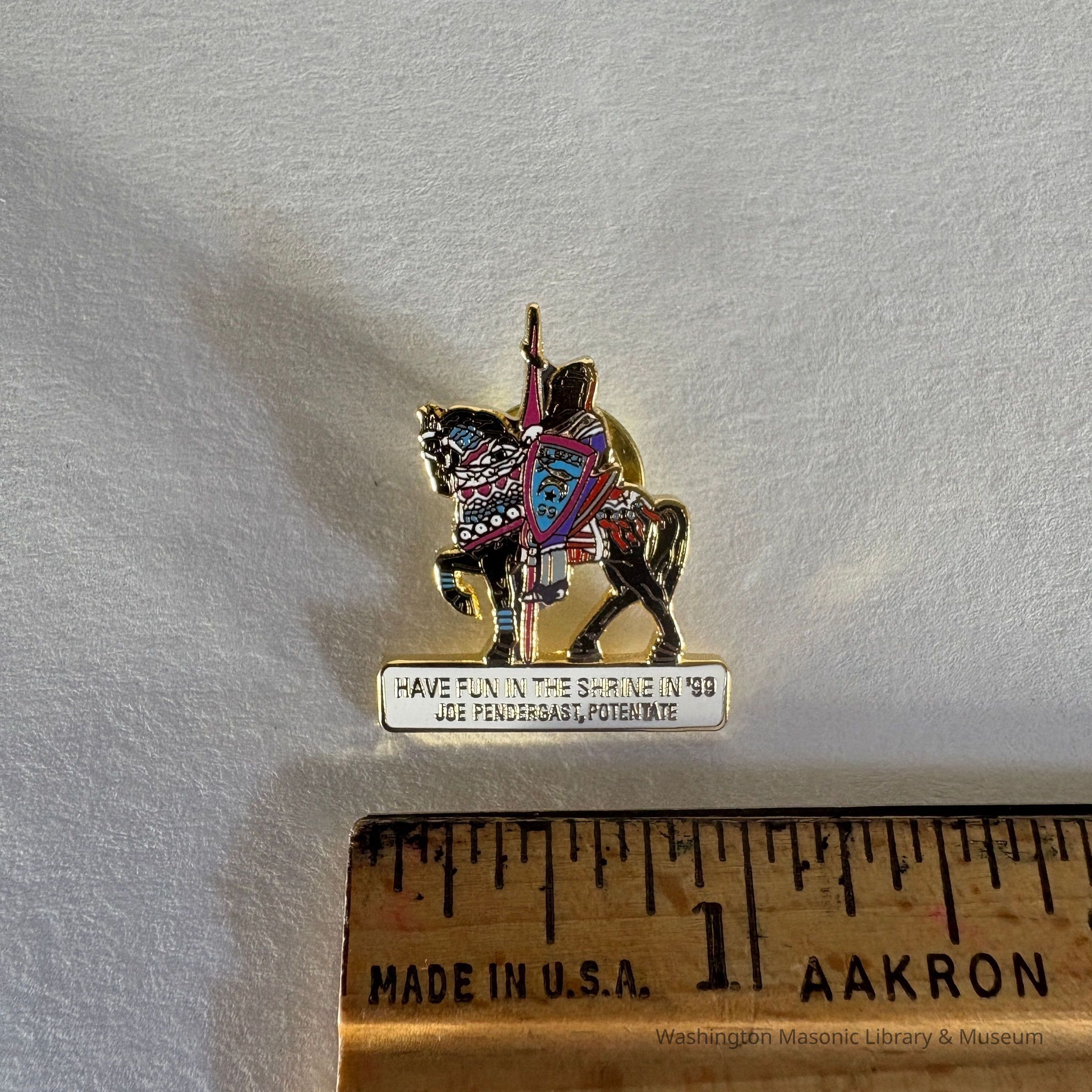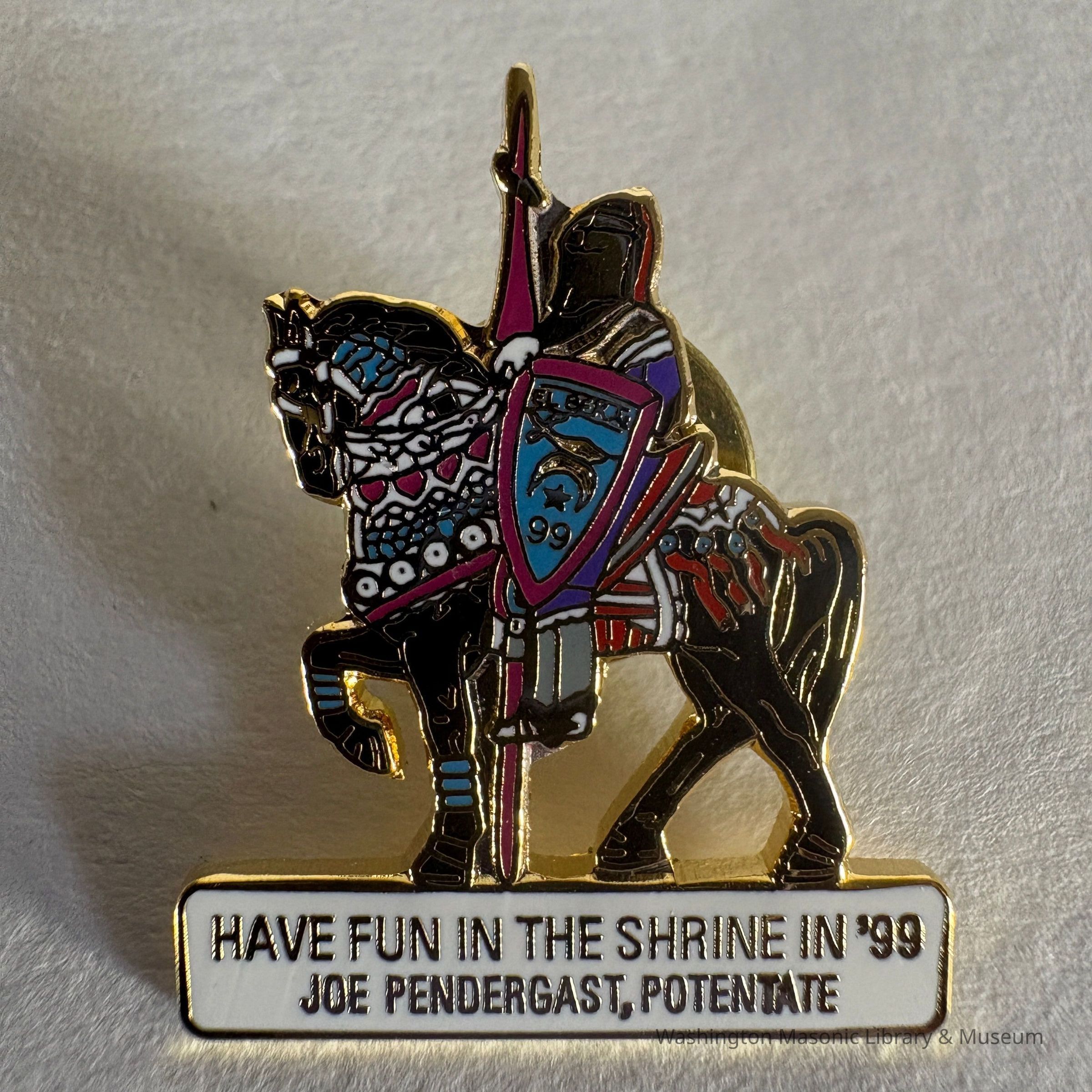 Pin: Shriner. Knight riding black horse facing right. "Have Fun in the Shrine in '99/ Joe Pendergast, Potentate" Donated by PGM James O. Wood. (1999)Collection