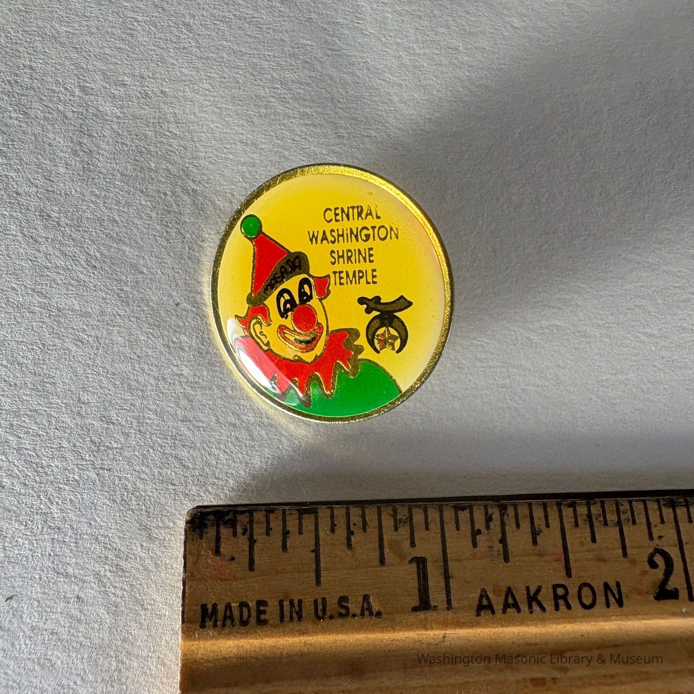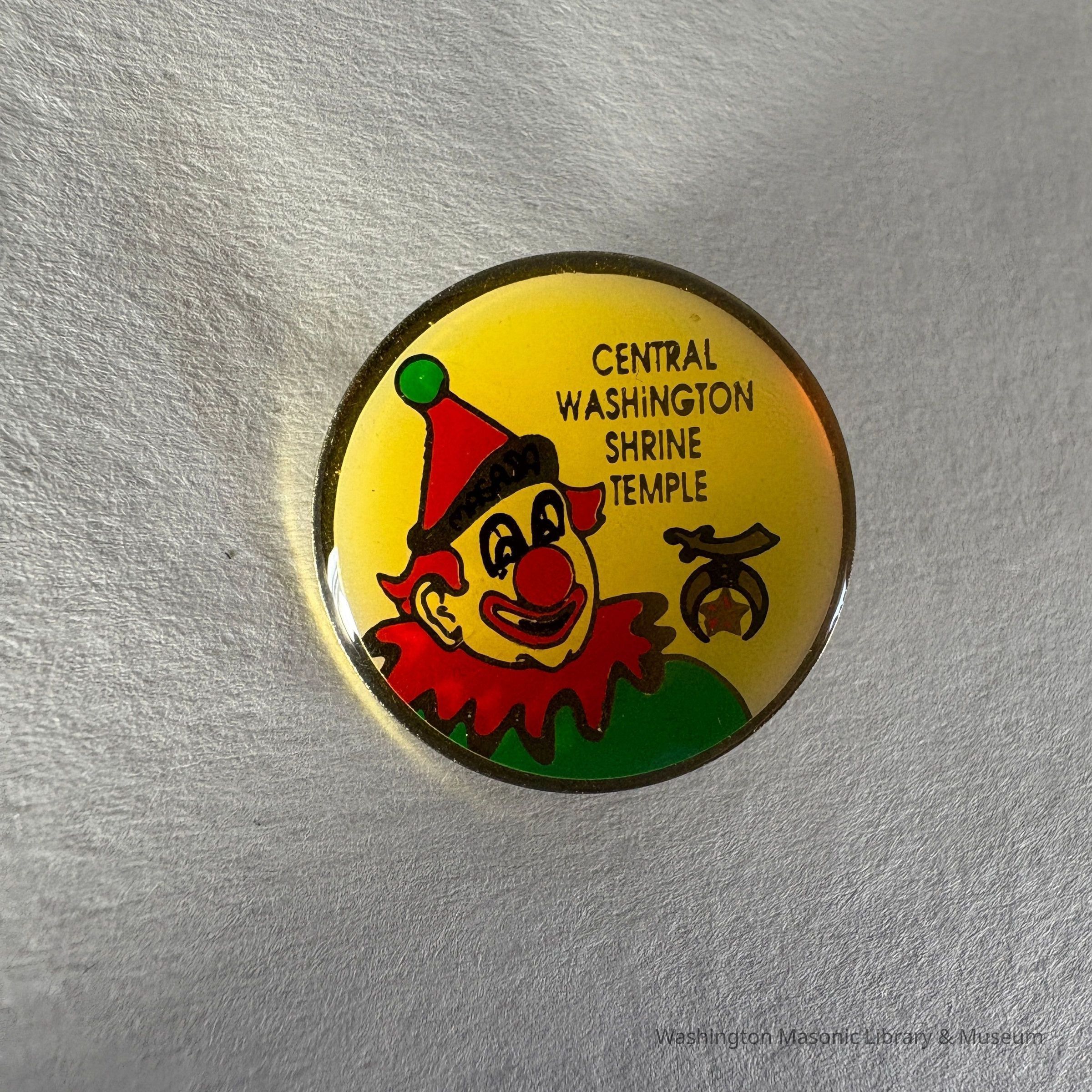 Pin: Round. Yellow background with clown. "Masada/ Central Washington Shrine Temple" Donated by PGM James O. Wood (c.1999)Collection