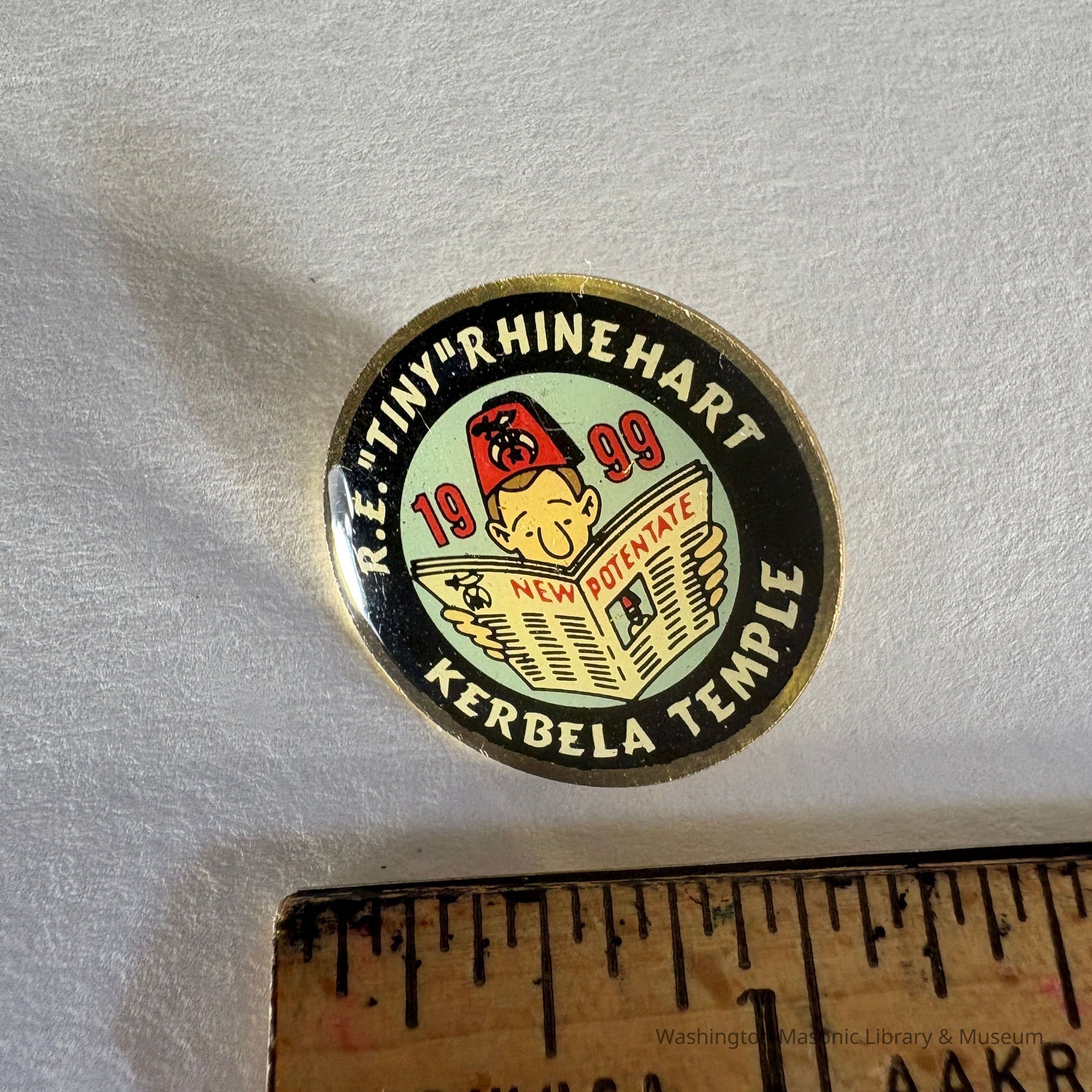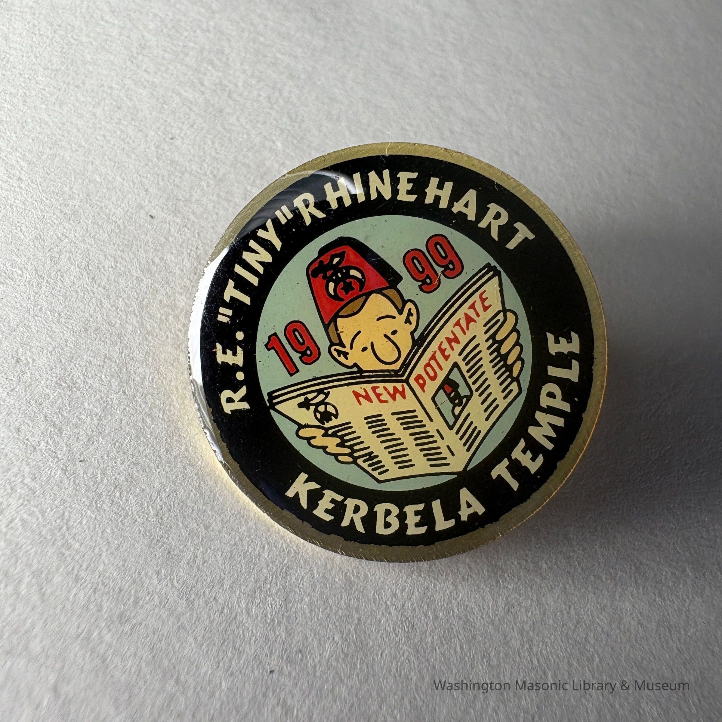 Pin: Shriner. Circular. Man wearing a fez reading a newspaper titled "New Potentate". "R.E. "Tiny" Rhinehart/Kerbela Temple" Donated by PGM James O. Wood (1999)Collection