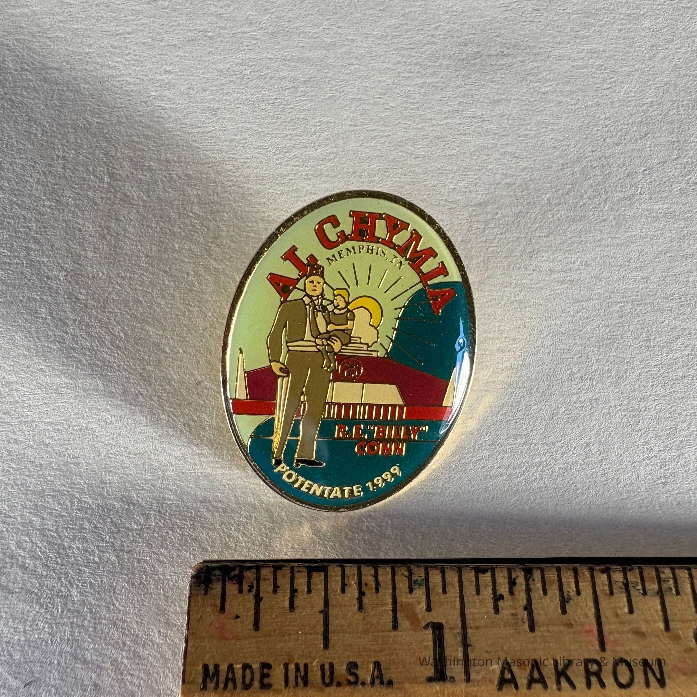 Pin: Shriner. Shriner holding child. building and sun rays in the background. "Al Chymia/ R.E. "Billy" Conn/ Potentate 1999" Donated by PGM James O. Wood (1999)Entry/Object ID
