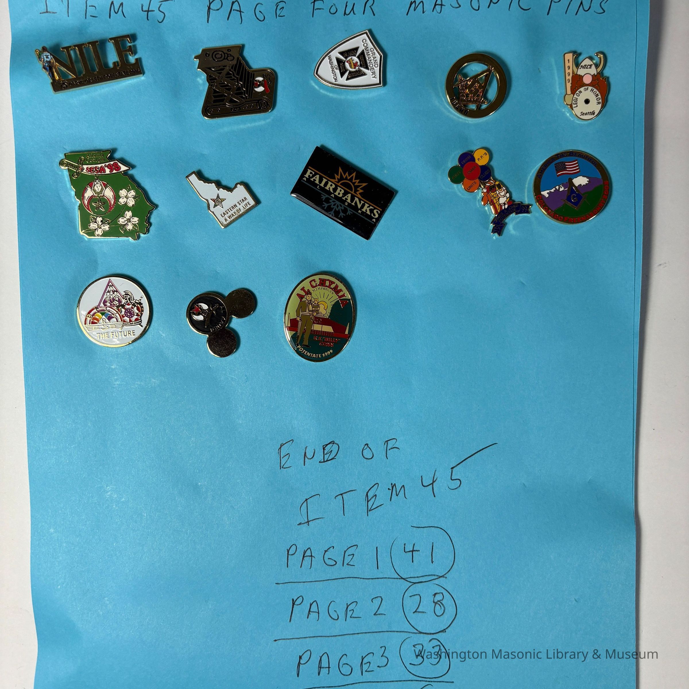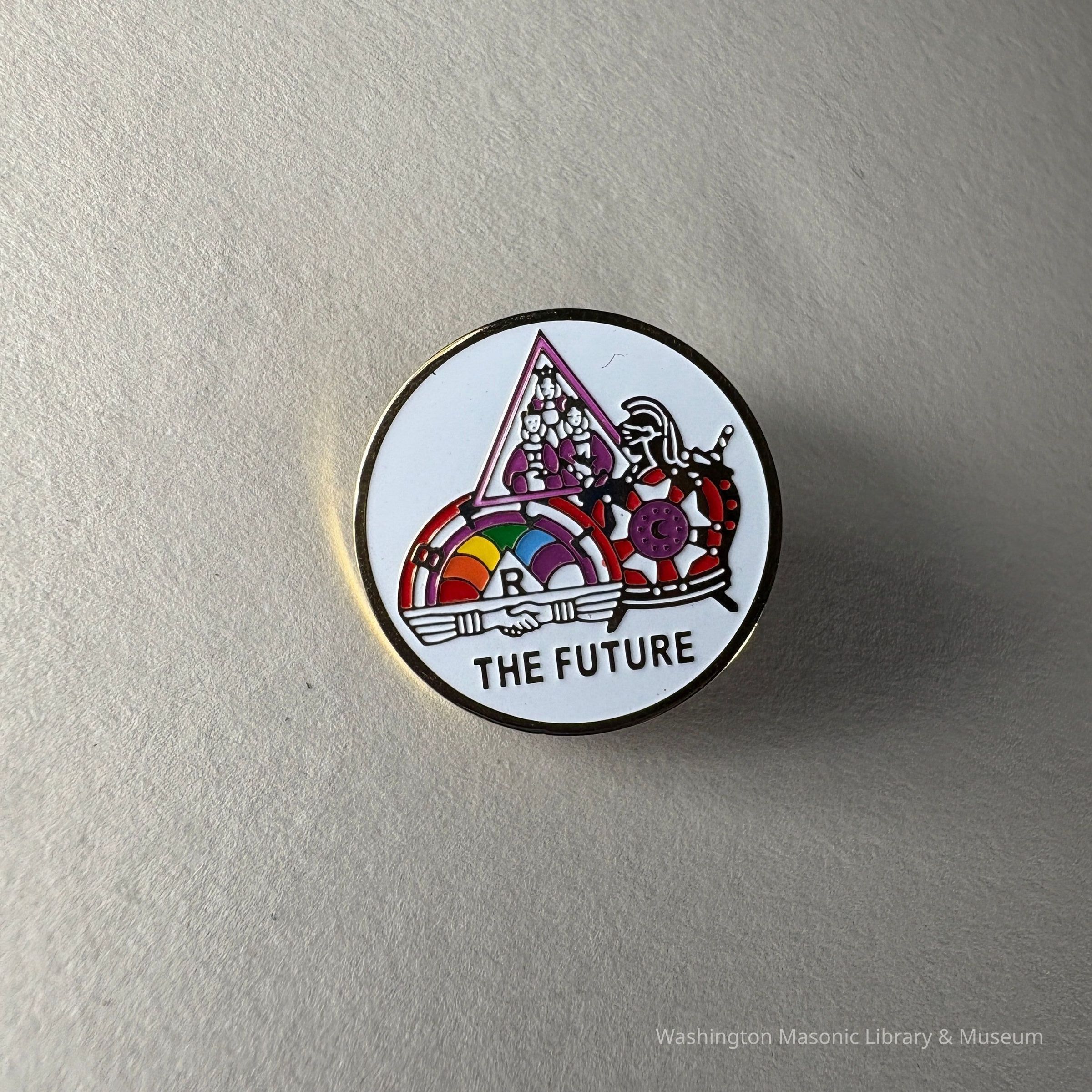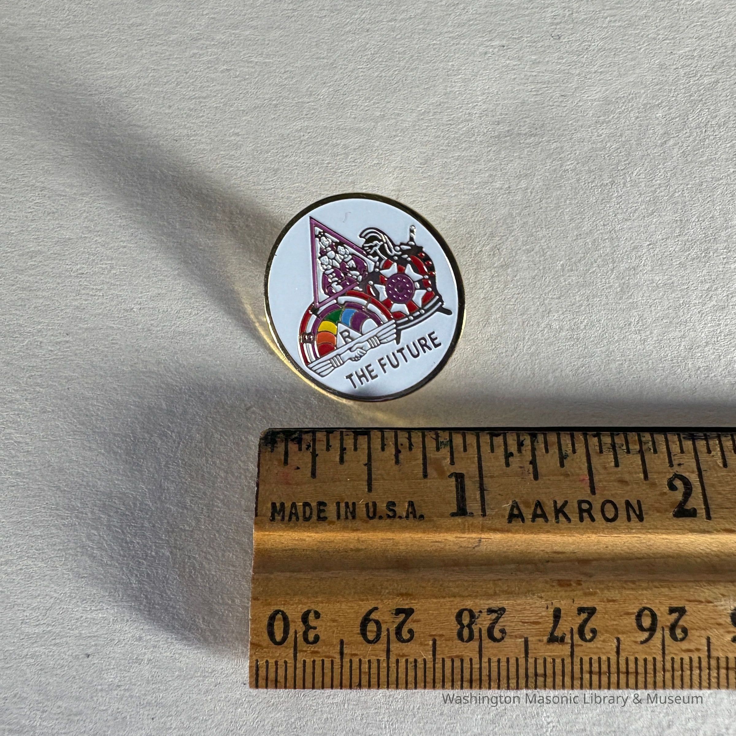 Pin: Circular. White. Symbols of all three youth groups: Rainbow Girls, DeMolay, and Job's Daughters. "The Future" Donated by PGM James O. Wood (c.1999)Collection