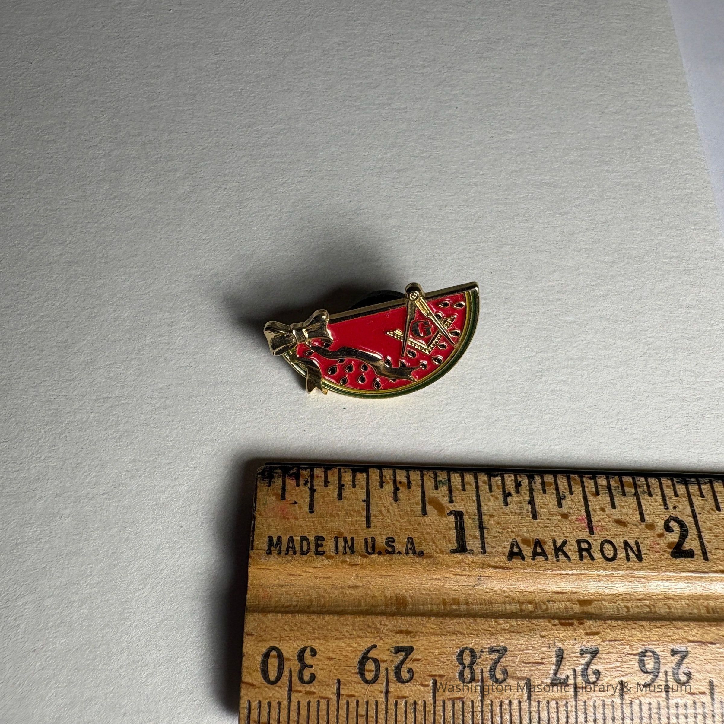 Pin: Watermelon half with square and compass. Found in a cash of pins donated by PGM James O. Wood (c. 1999)Entry/Object ID