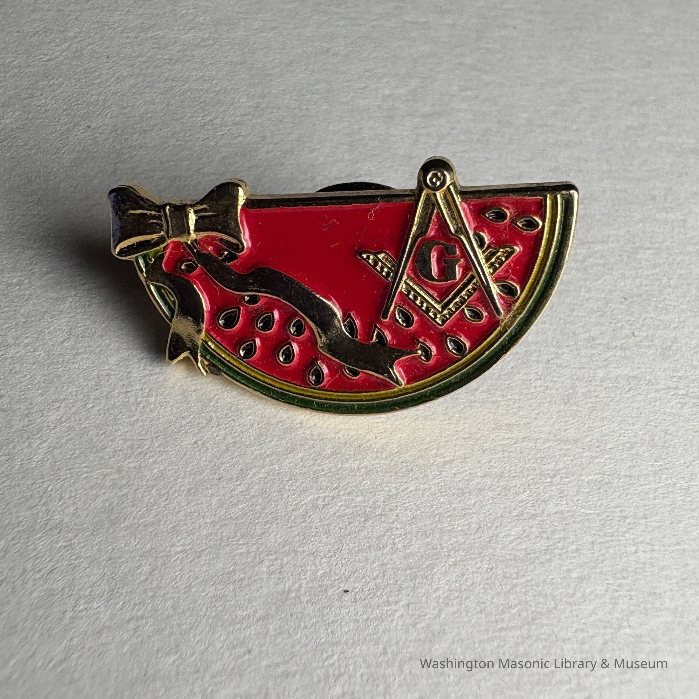 Pin: Watermelon half with a bow on the left and square and compass on right. Found in a cash of pins donated by PGM James O. Wood.Collection