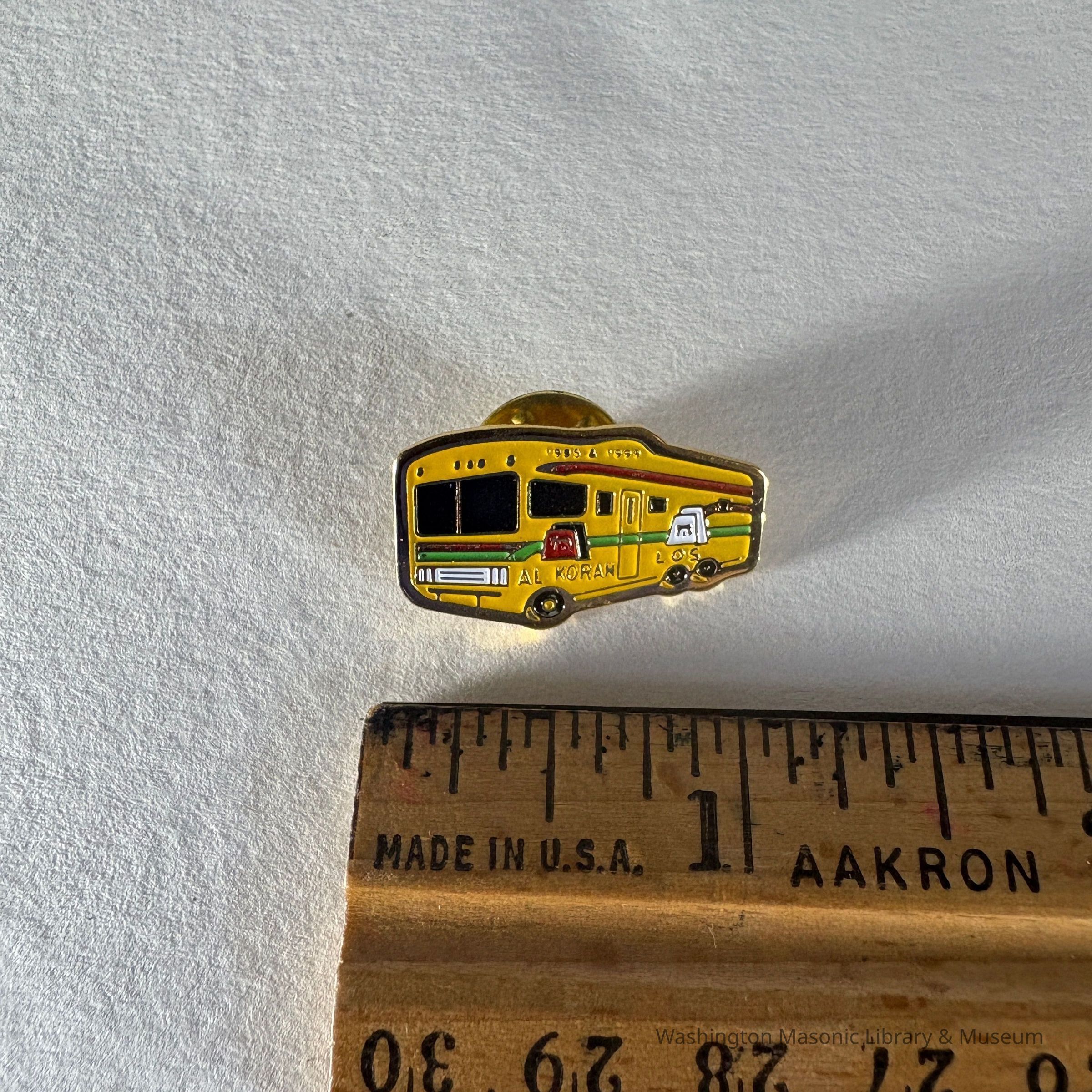 Pin: Yellow bus facing left. "1995 & 1999/ Al Koran/Los" Donated by PGM James O. Wood. (1999)Entry/Object ID