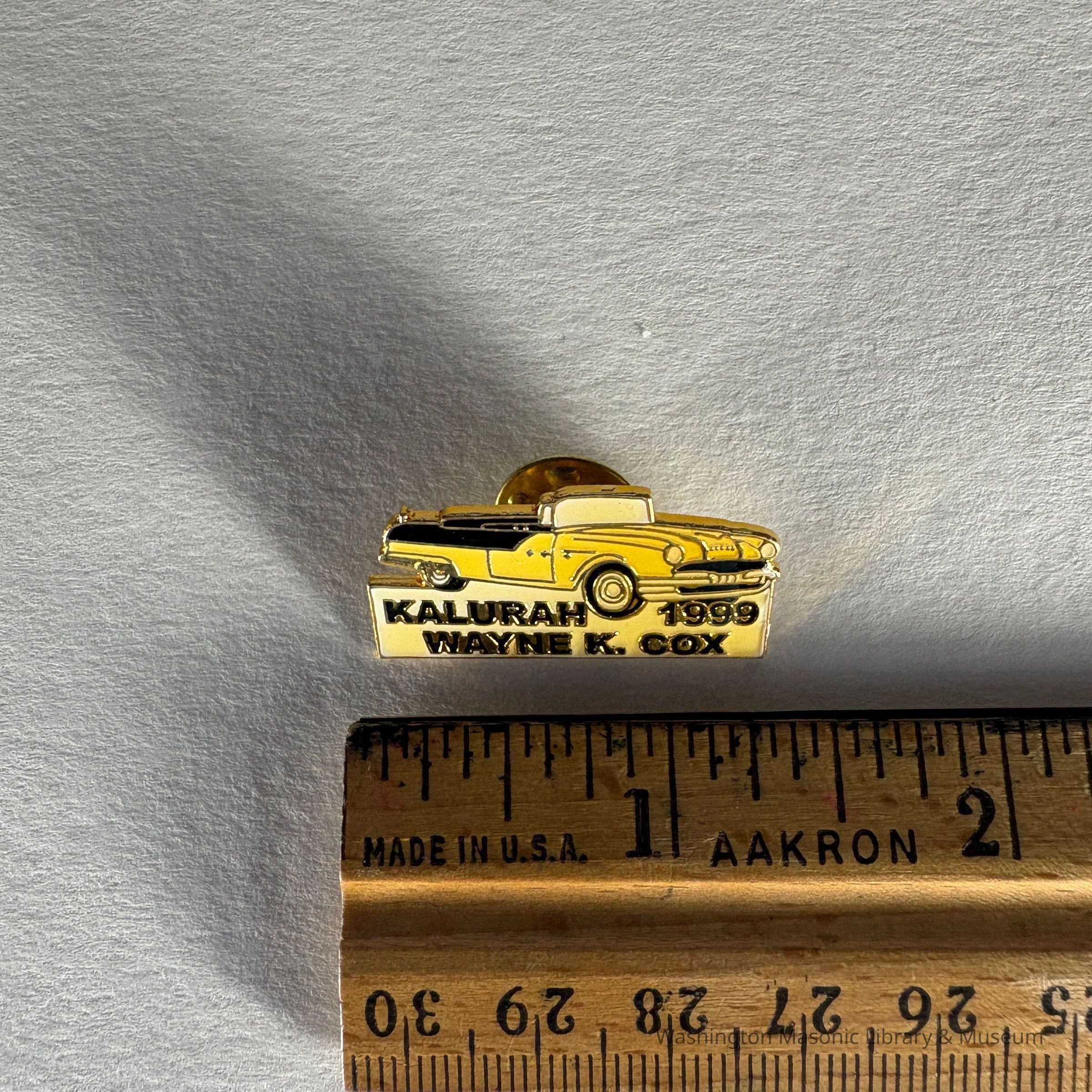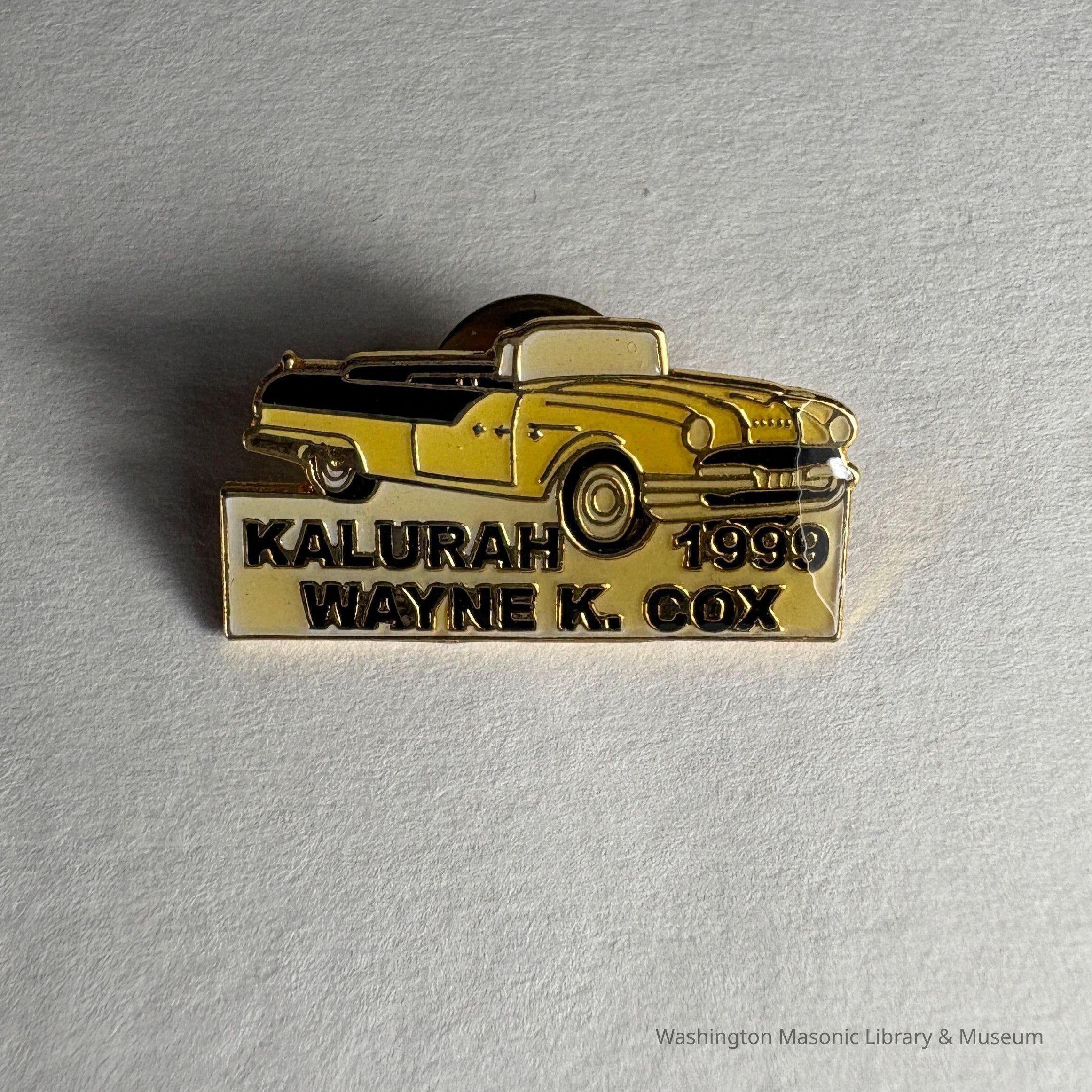 Pin: Yellow and Black. Yellow Car. "Kalurah 1999/ Wayne K. Cox" Donated by PGM James O. Wood (1999)Collection