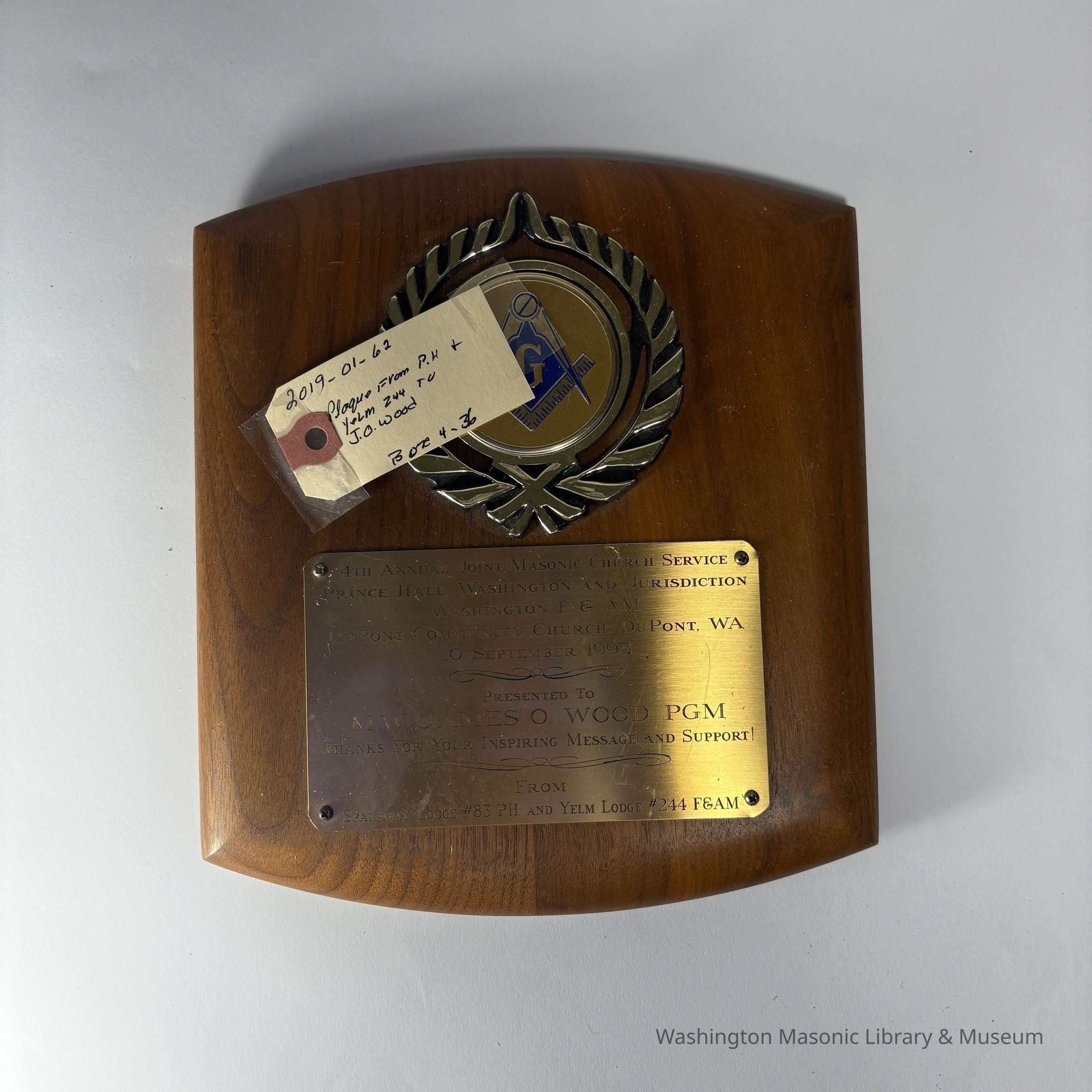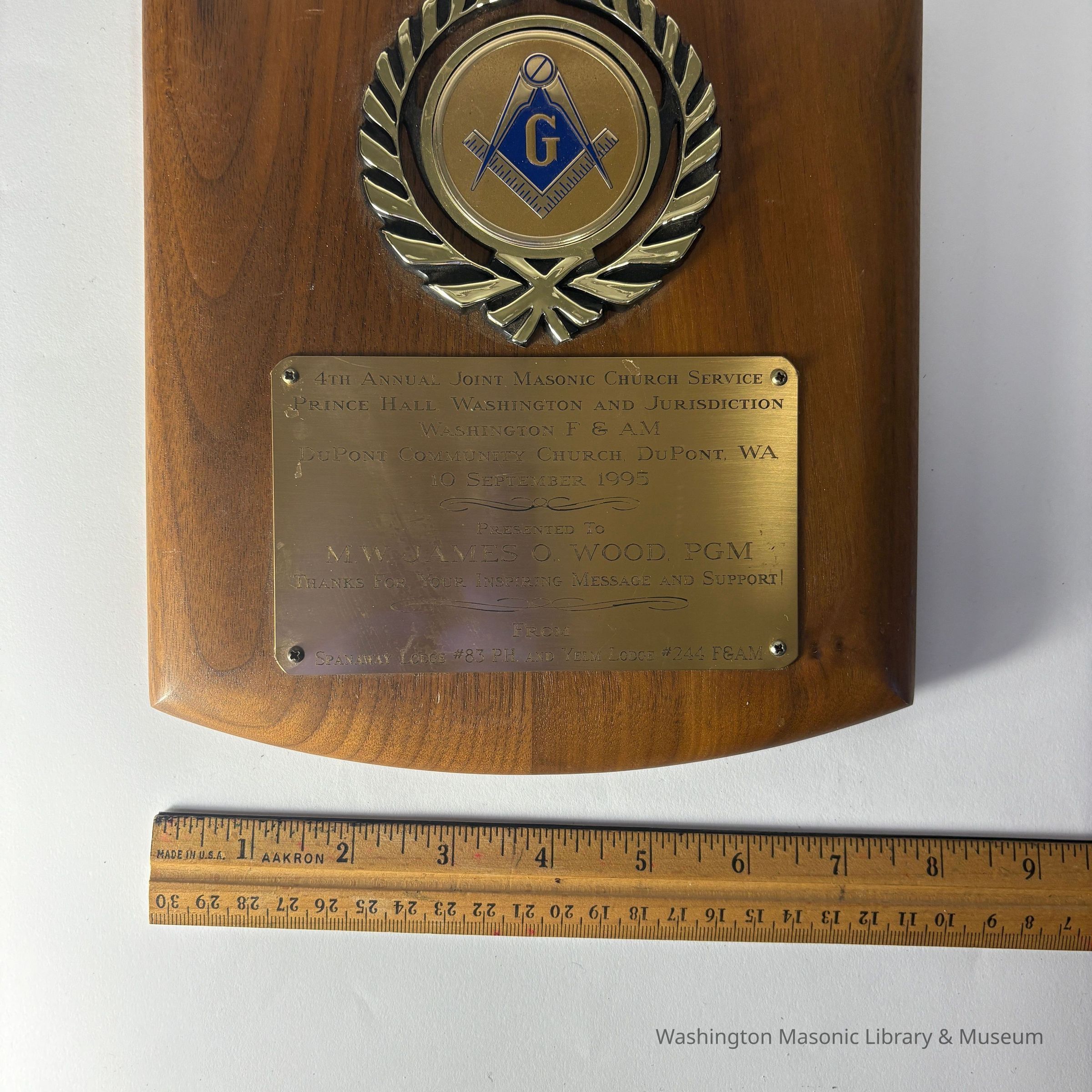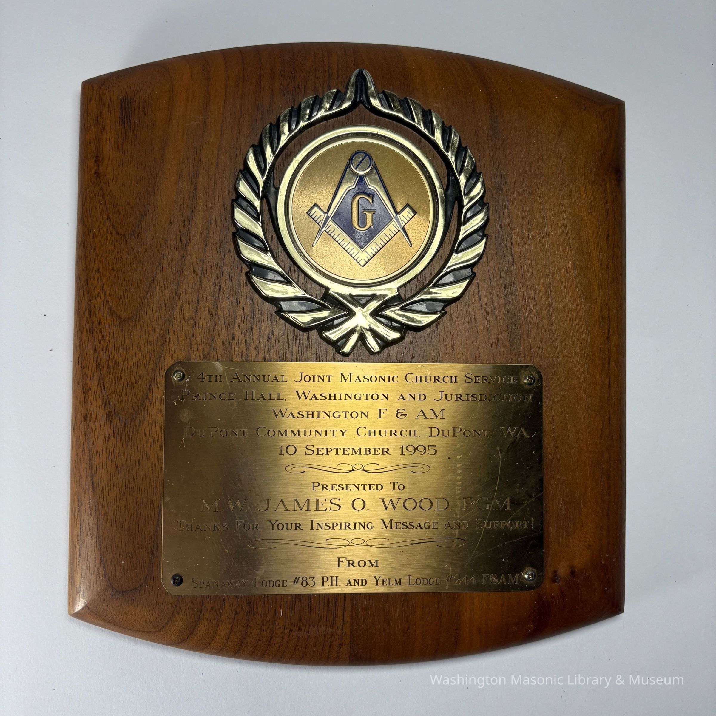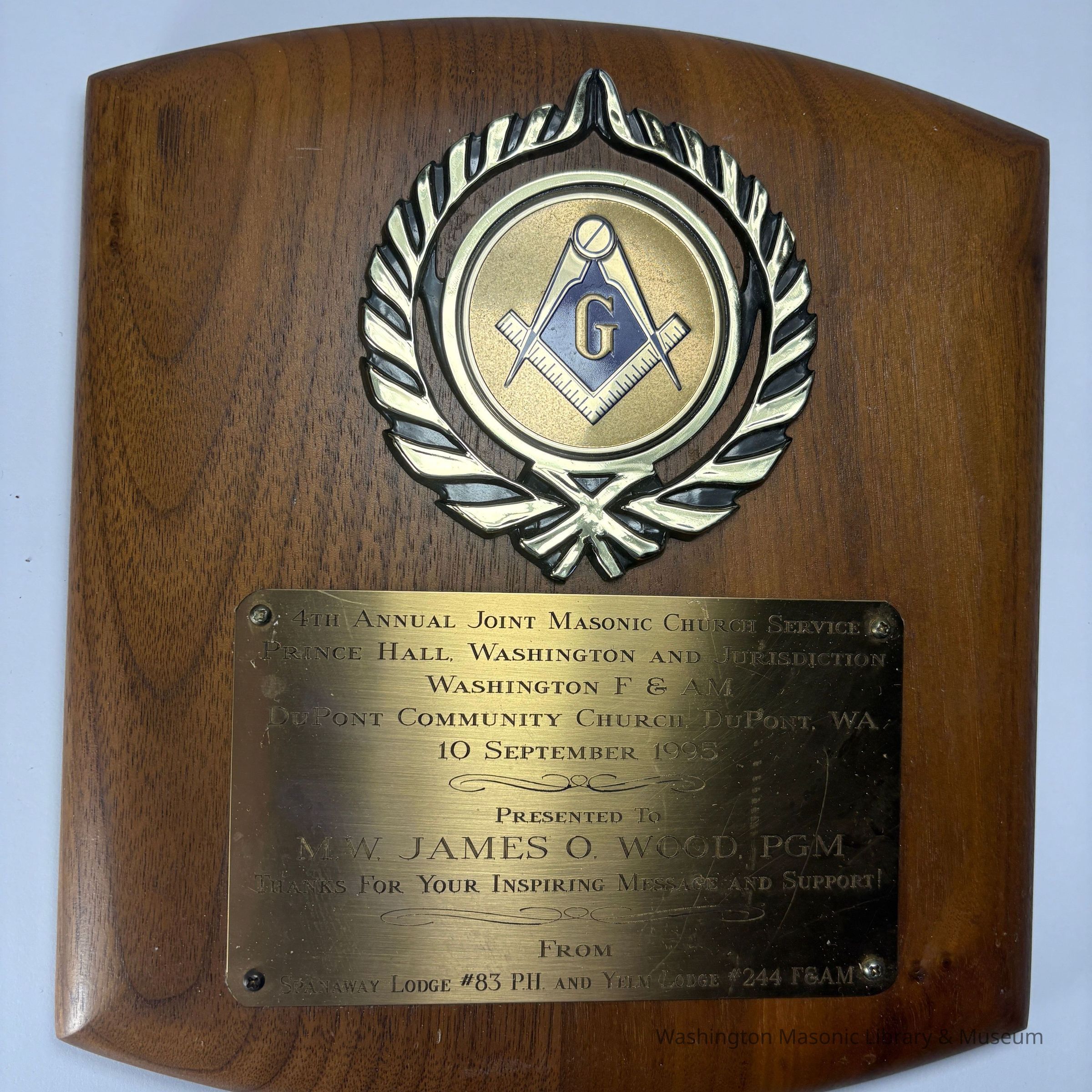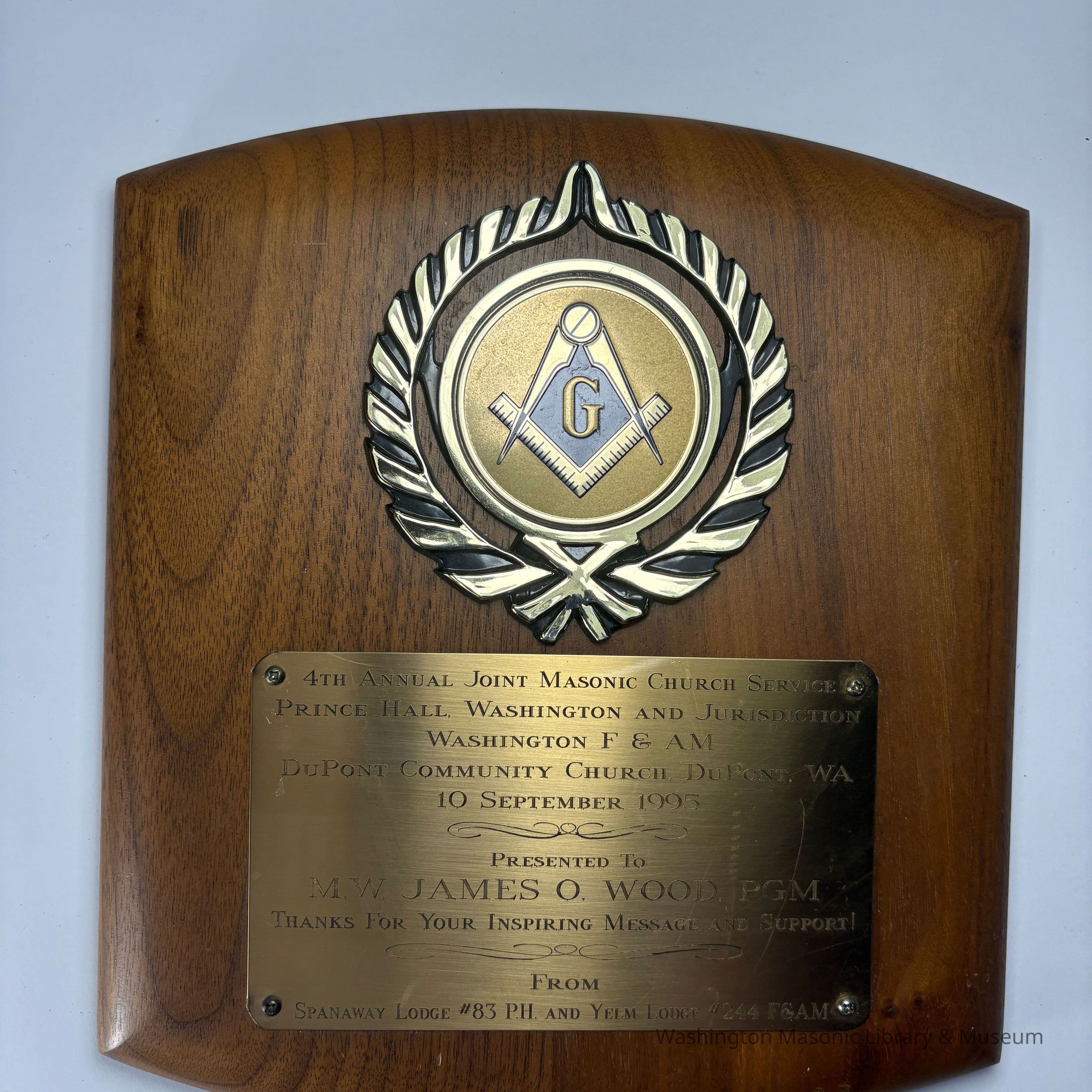 Plaque: "4th Annual Joint Masonic Church Service, Prince Hall Washington and Jurisdiction of Washington F&AM/ DuPont Community Church, DuPont, WA/September 10, 1995/Presented to MW James O. Wood, PGM/Thanks for your inspiring message and support/ From Spanaway Lodge #83 P.H. and Yelm Lodge #244 F&AM"Collection