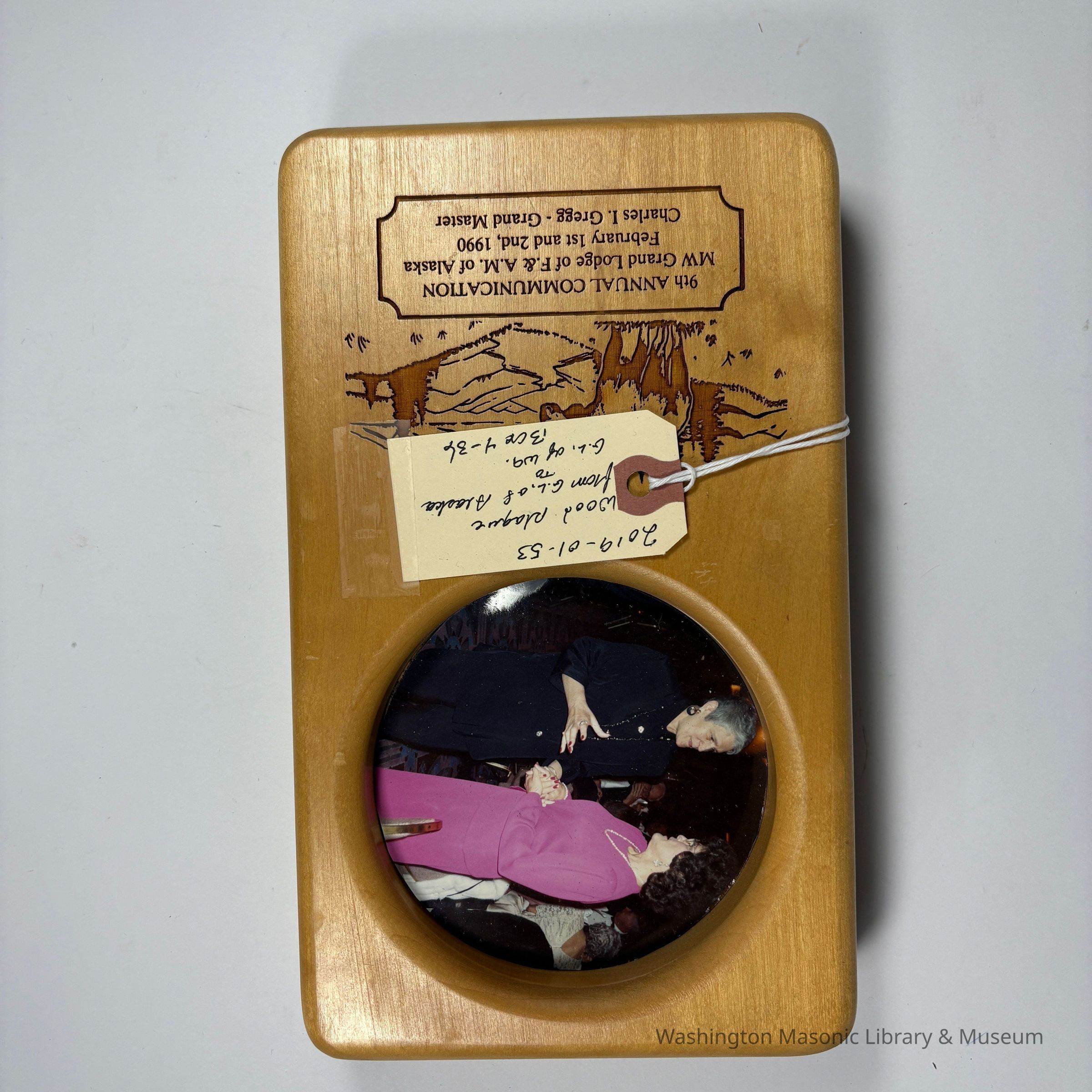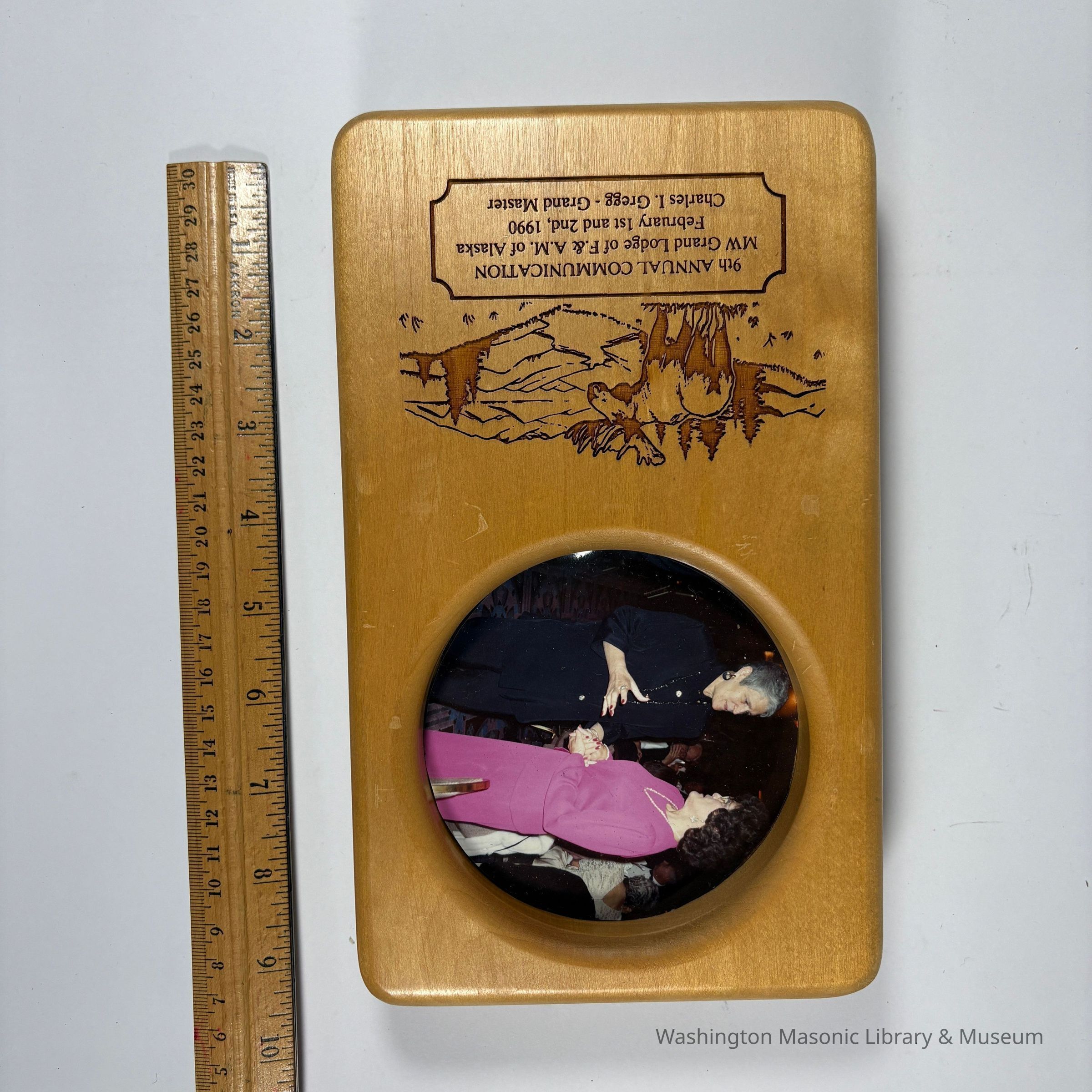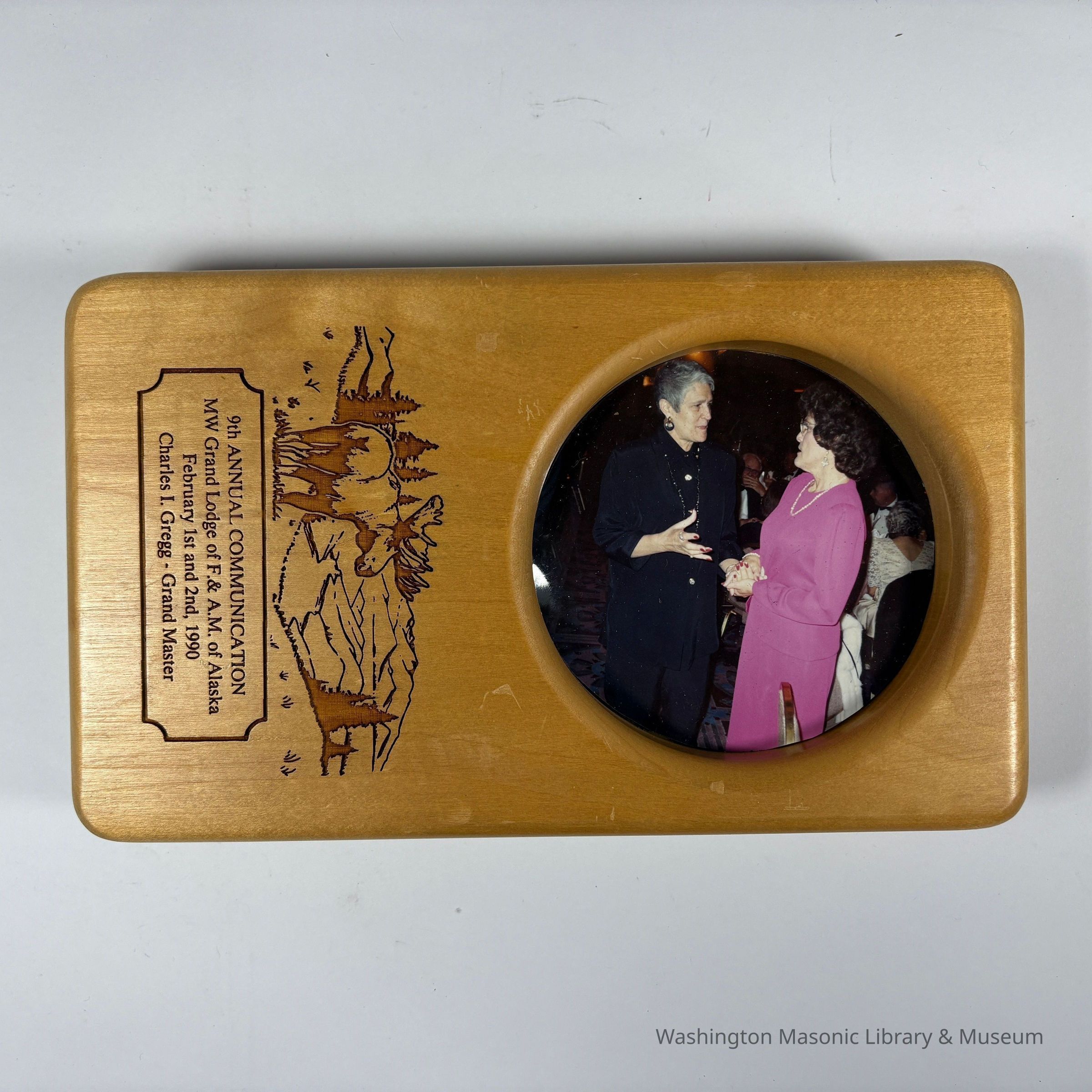 Plaque: Wood Plaque with picture of two women talking. 9th Annual Communication MW Grand Lodge of F&AM of Alaska, February 1st and 2nd, 1990. Charles I Gregg, Grand Master. Presumably a gift to PGM William Miller, who was Grand Master June 1989-June 1990.Collection
