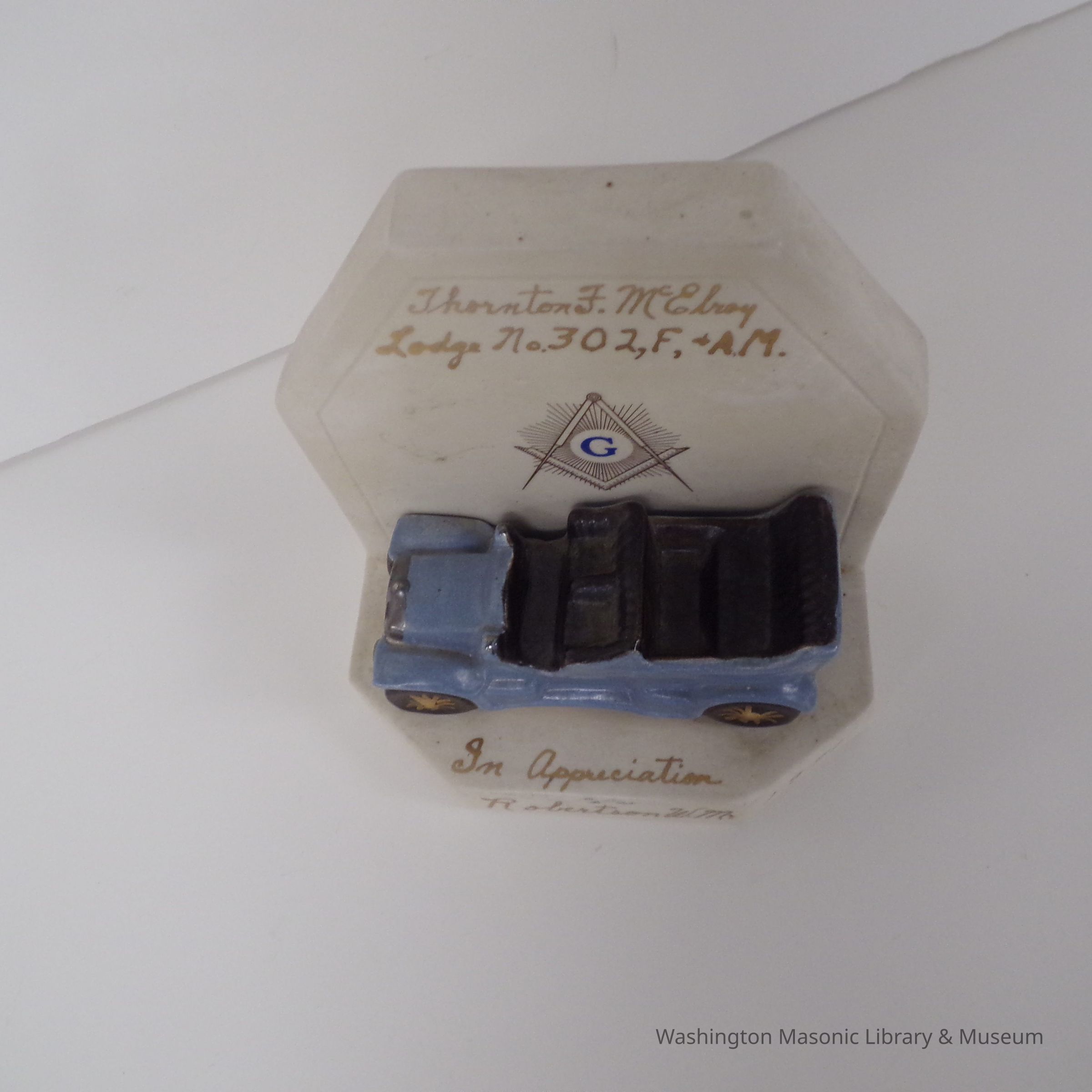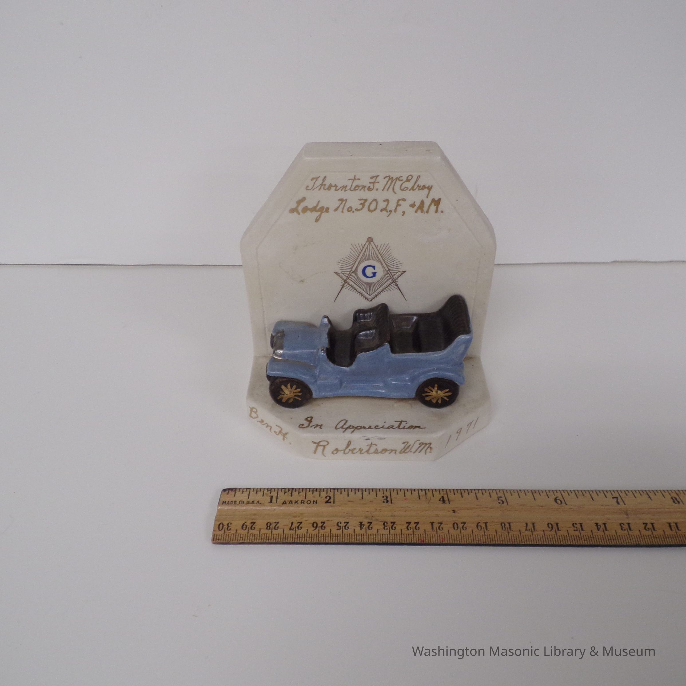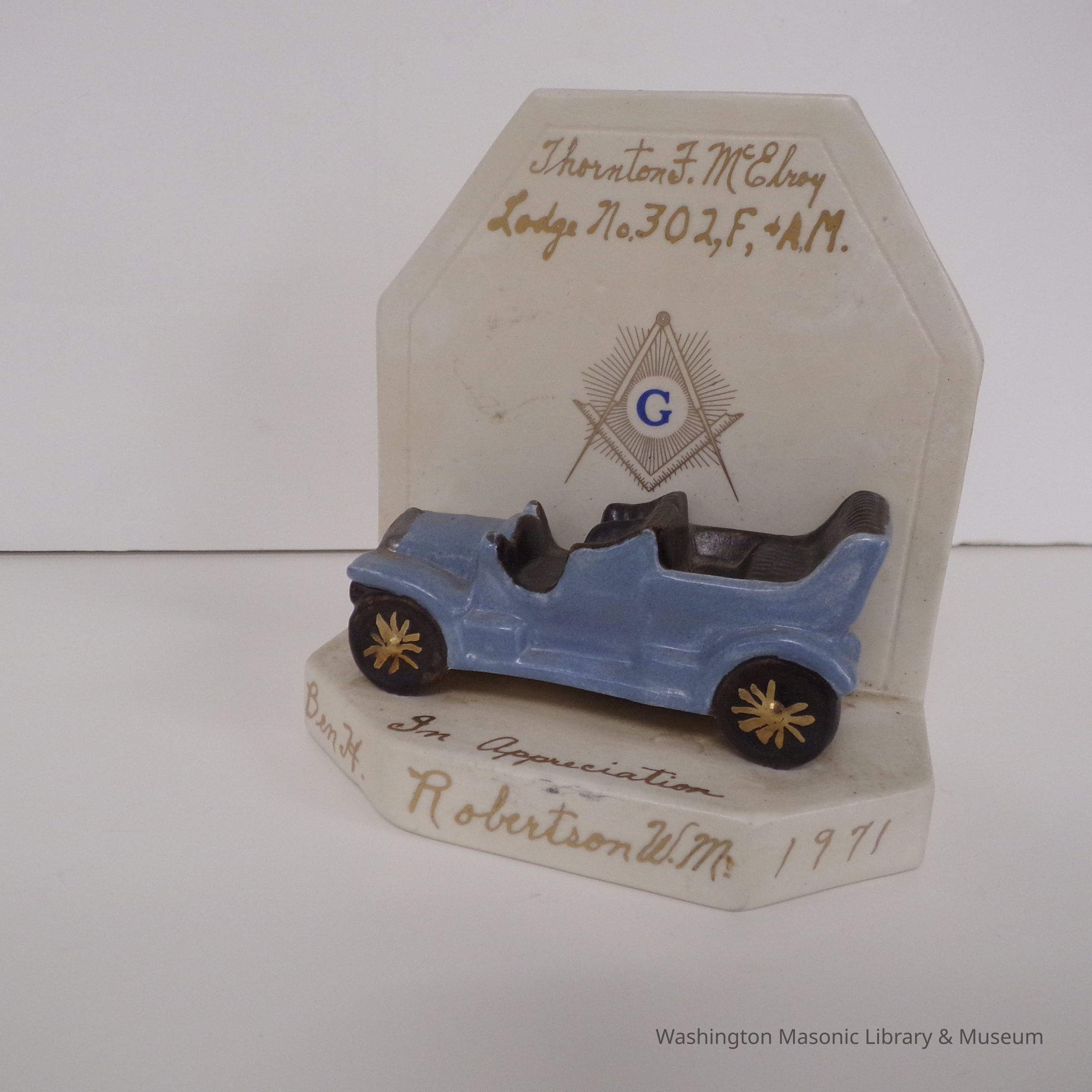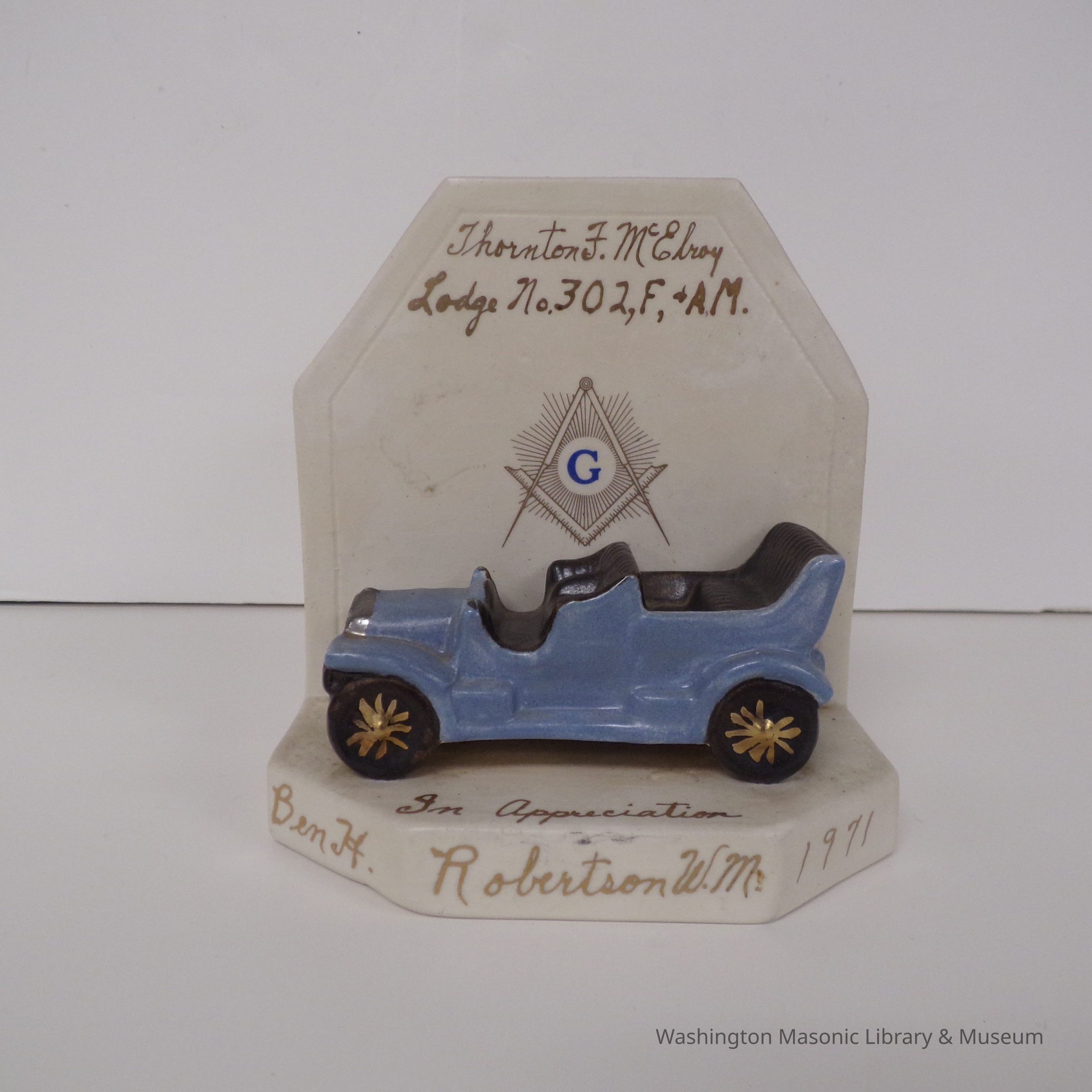 Plaque: Appreciation Gift presented to VW Brother William Miller (1971) from Ben H. Robertson, WM of ThortonF. McElroy Lodge No. 302.