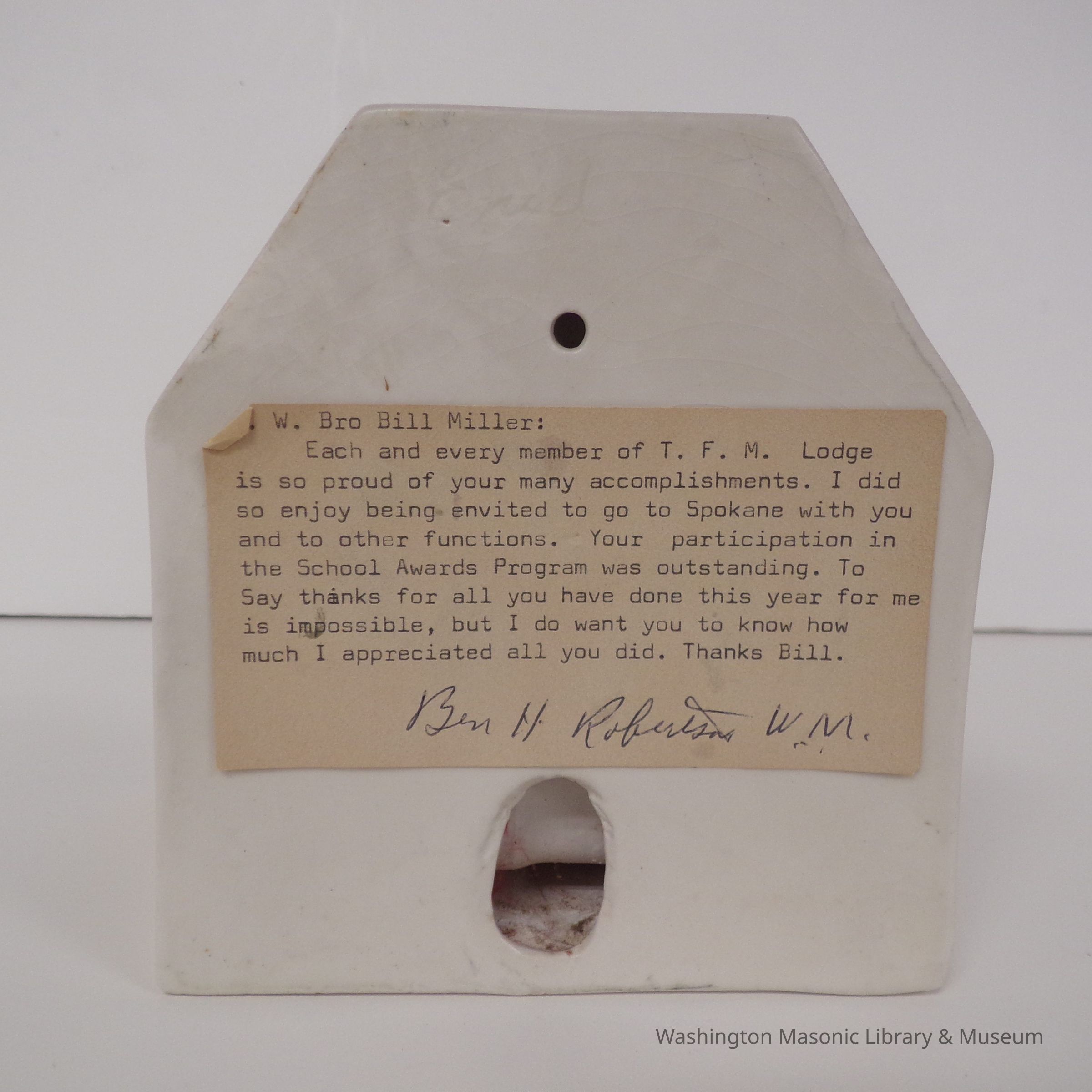 Each and every member of the T.F.M. Lodge is so proud of your many accomplishments. I did so enjoy being envited (sic) to go to Spokane with you and to other functions. Your participation in the School Awards Program was outstanding. To Say thanks for all you have done this year for me is impossible, but I do want you to know how much I appreciated all you did. Thanks Bill. " Signed: Ben H. Roberston, W.M.Collection