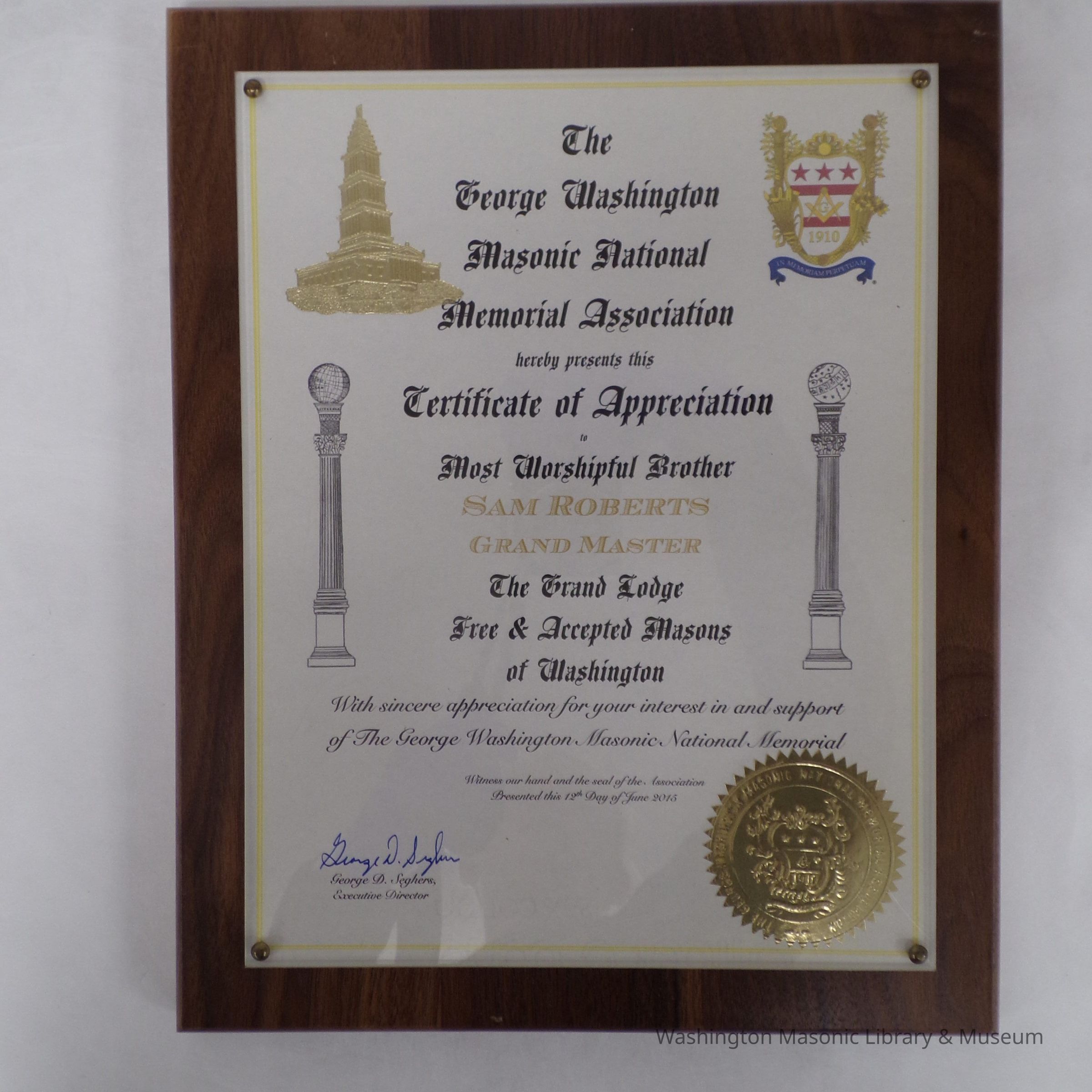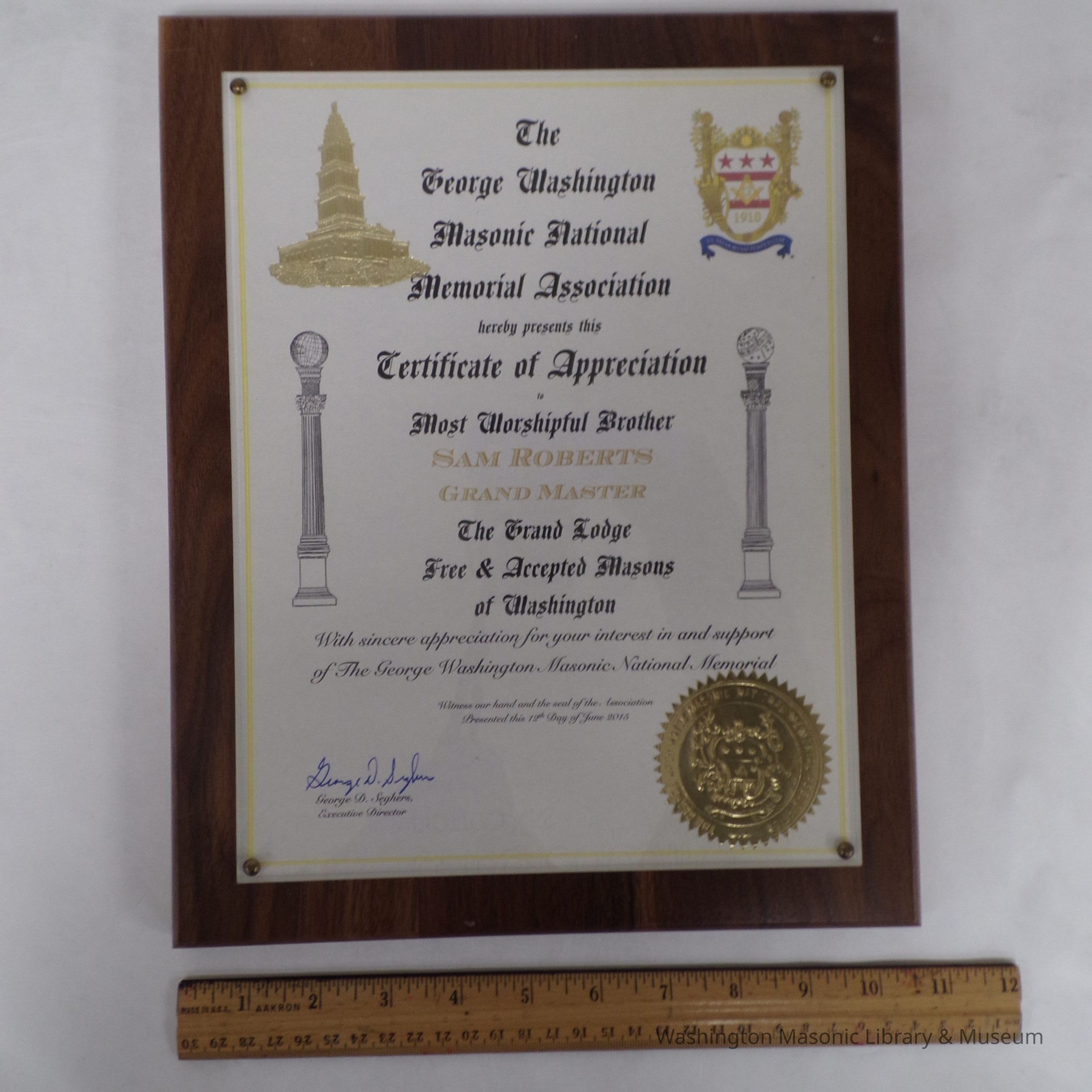 Plaque: The George Washington Masonic National Memorial Association hereby presents this certificate of appreciateion to MWB Sam Roberts"Dimensions