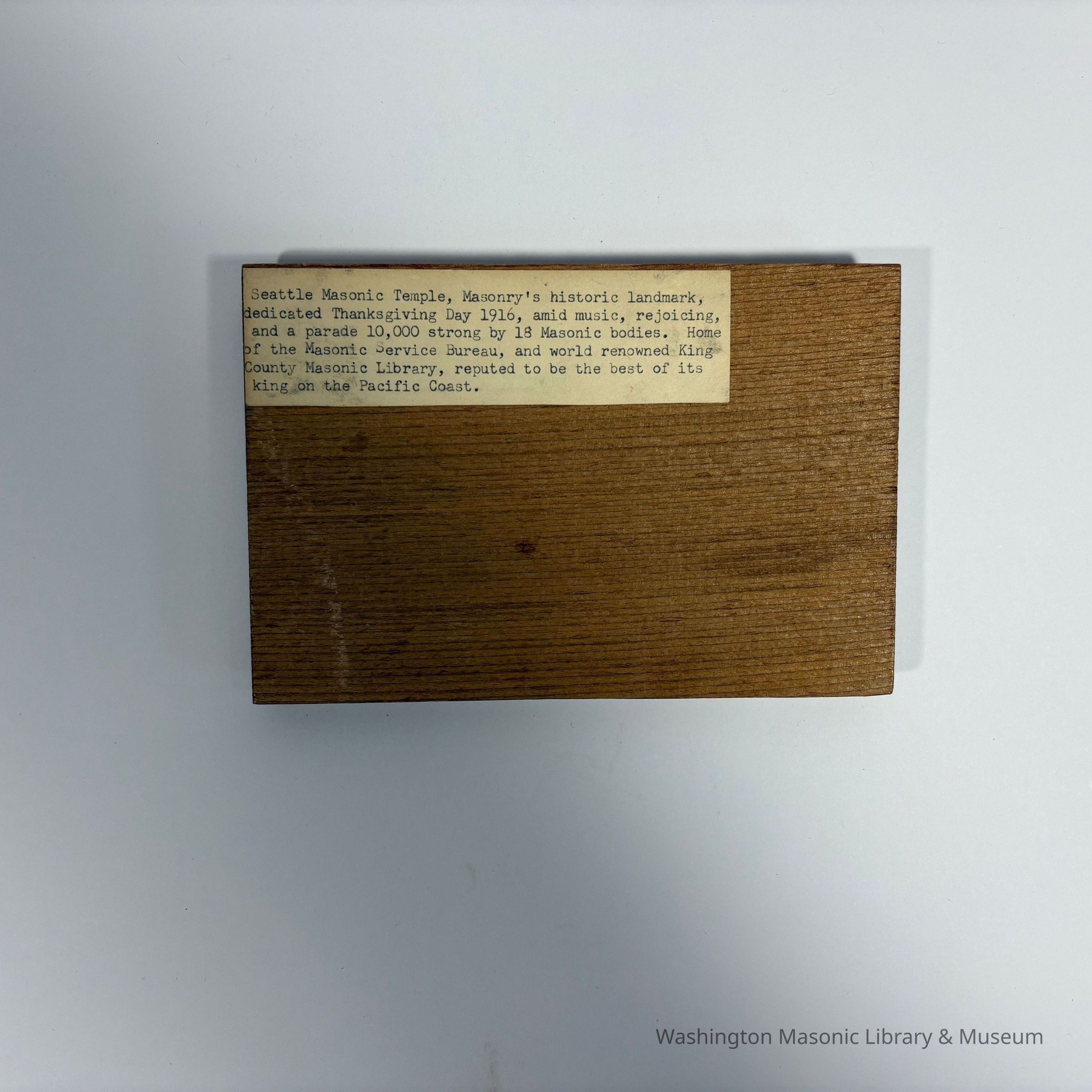 "Seattle Masonic Temple, Masonry's historic landmark, dedicated Thanksgiving Day 1916, amid music, rejoicing, and a parade 10,000 strong by 18 Masonic bodies. Home of the Masonic Service Bureau, and world renowned King County Masonic Library, reputed to be the best of its king(sic) on the Pacific Coast."Collection