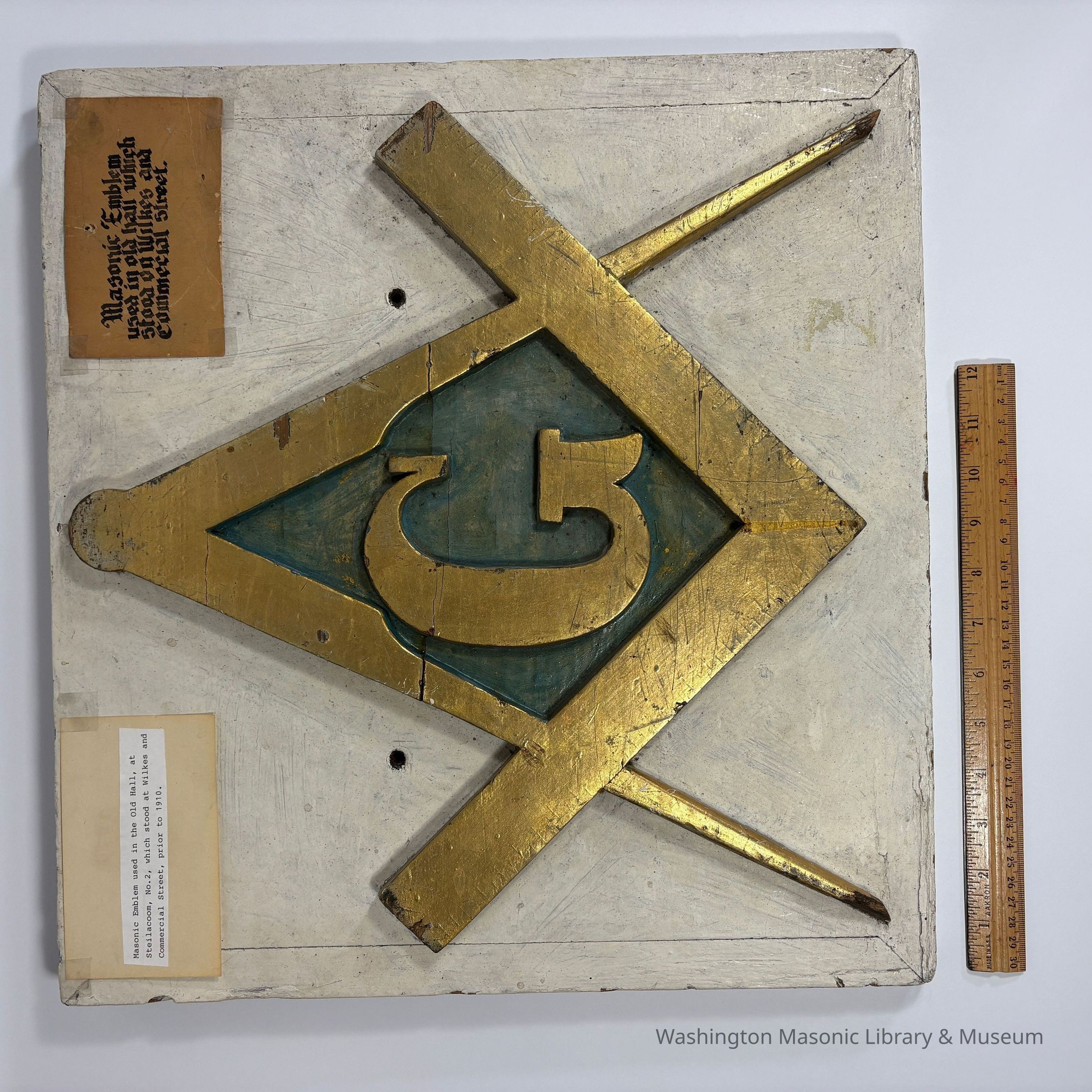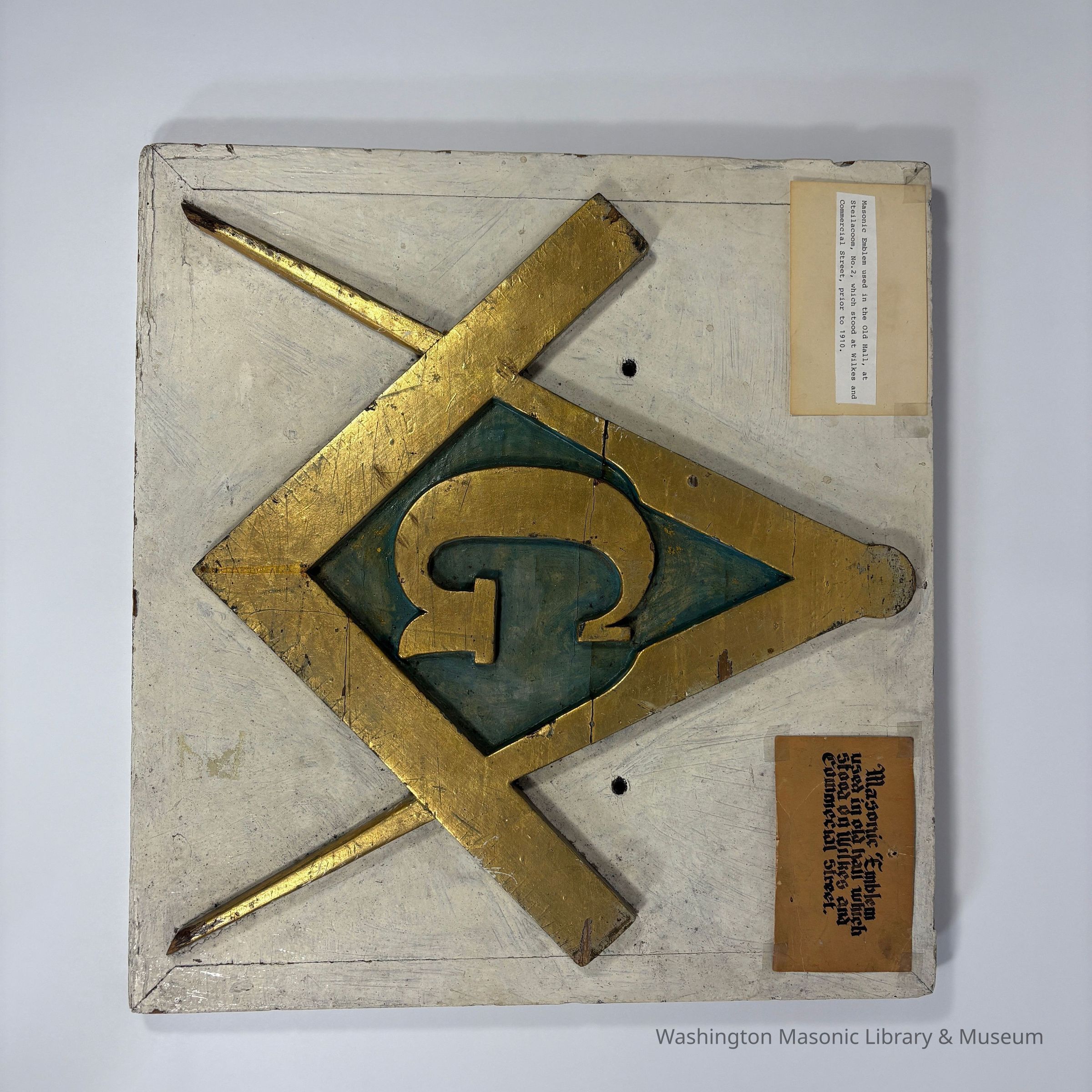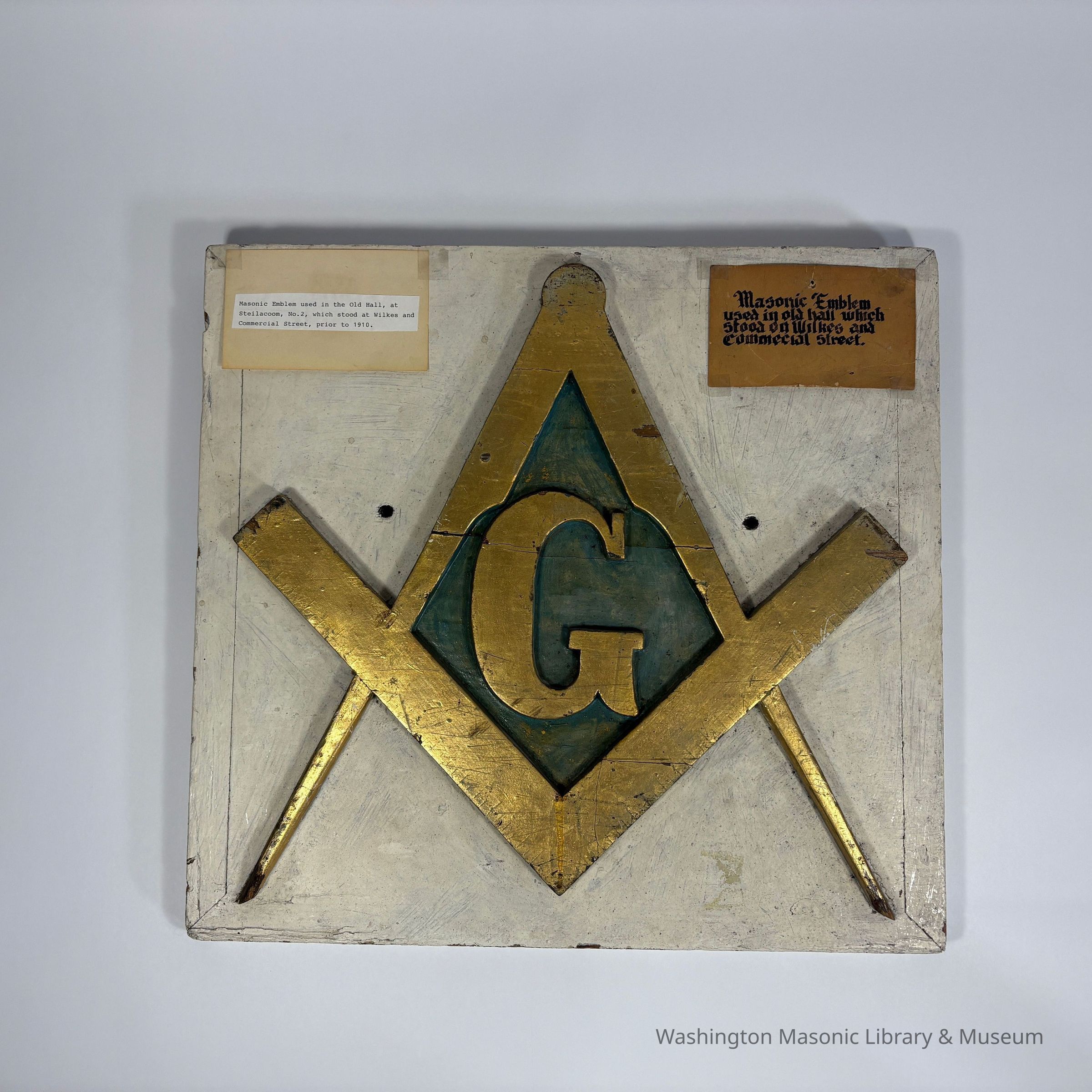 Plaque: Masonic Emblem. Square and Compass used in the old hall at Steilacoom No.2 , which stood at Wilkes and Commercial Street, prior to 1910. Puyallup, Washington. Likeliest timeframe: 1872-1910 (based on historical notes in accession folder)Made/Created
